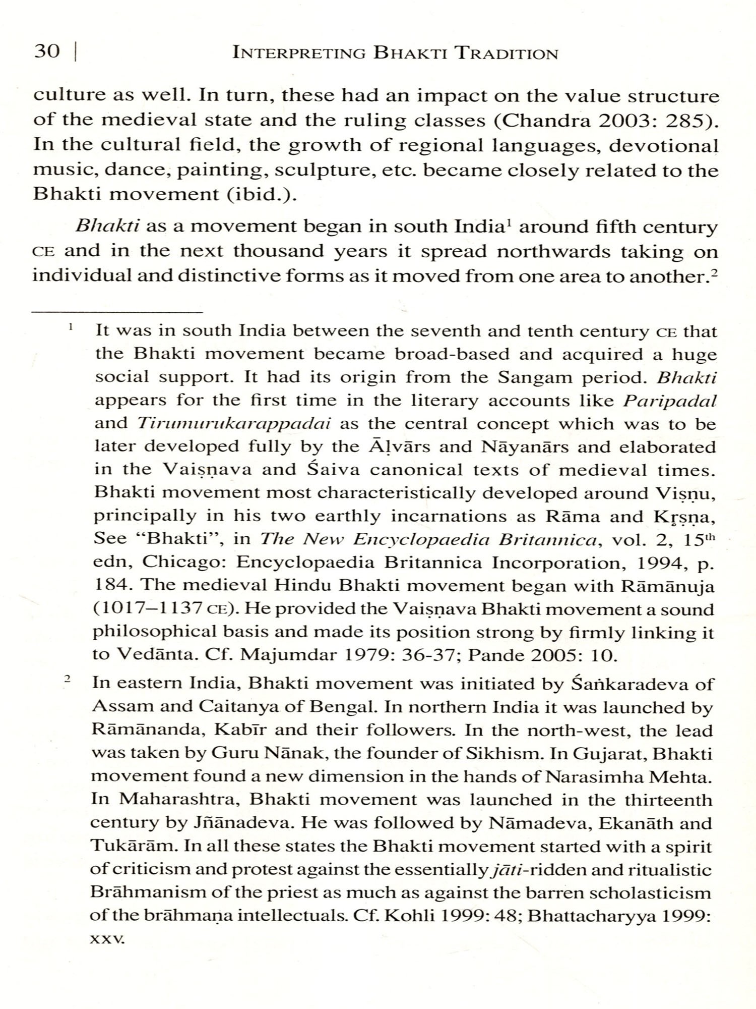 The advent of Islam in northern India and the overthrow of the Rajputs by the Turks towards the end of the twelfth century unleashed powerful forces which paved the way for the growth of bhakti as a popular movement. The violent end of the Rajput-brahmana alliance removed a big obstacle to the growth of those movements that opposed the varna system (Chandra 2003: 295). The prestige and influence commanded by the brahmaņas received a severe setback with the coming of Islam in north India. The loss of power and influence by the brahmaņas and the resultant freedom for the growth of anti-caste movements cleared the ground for the development of Bhakti movements (ibid.: 297, 299).