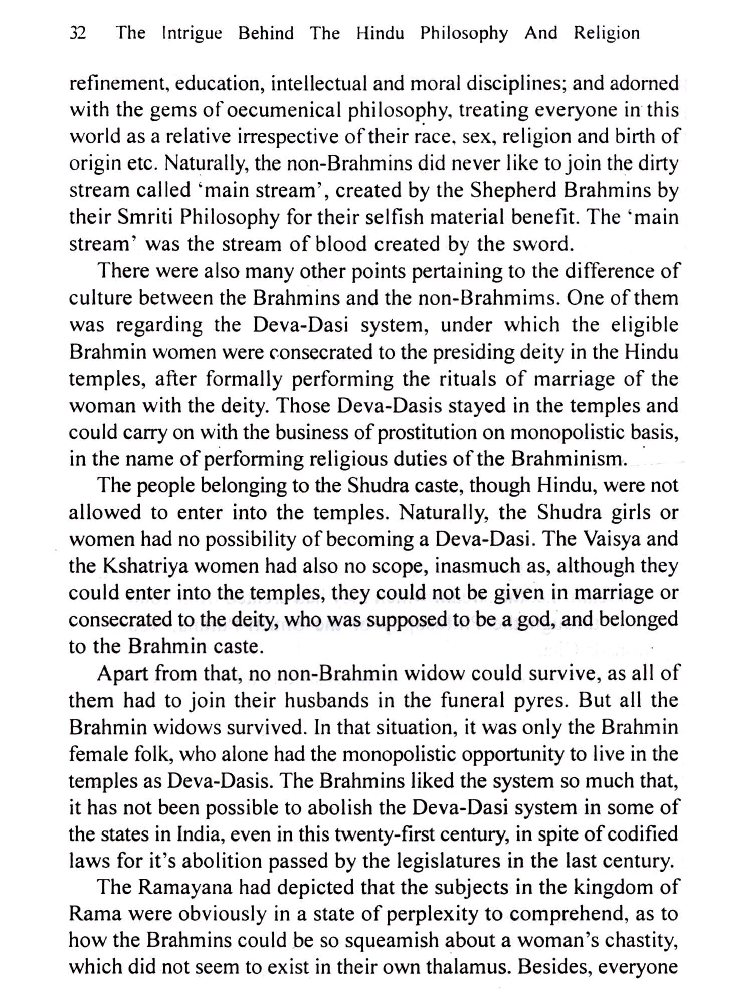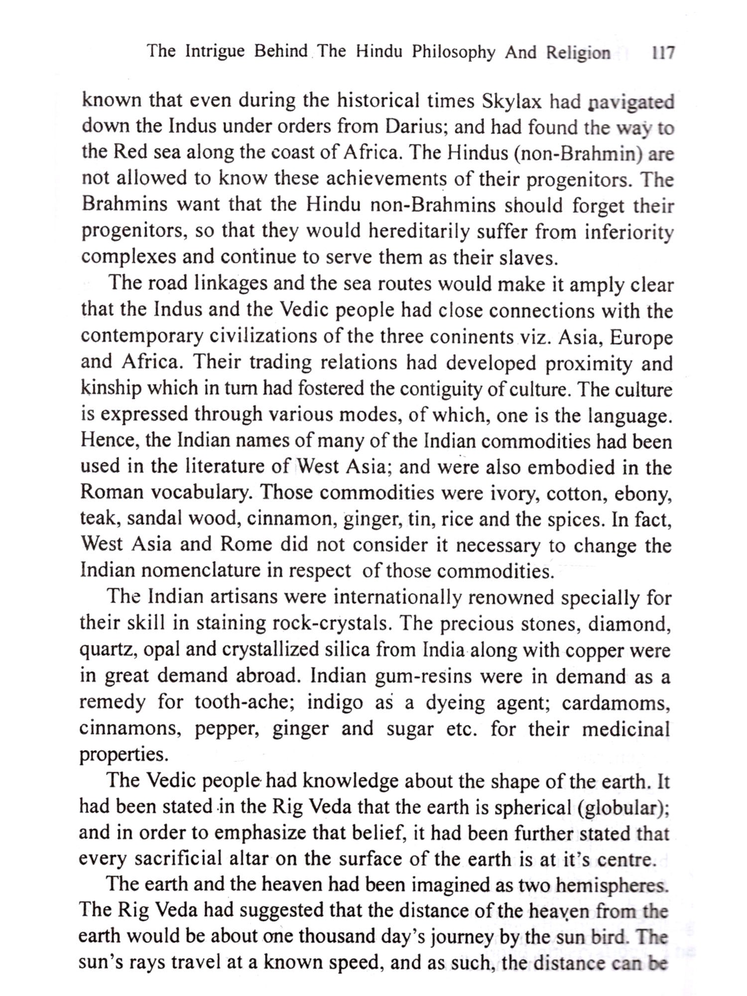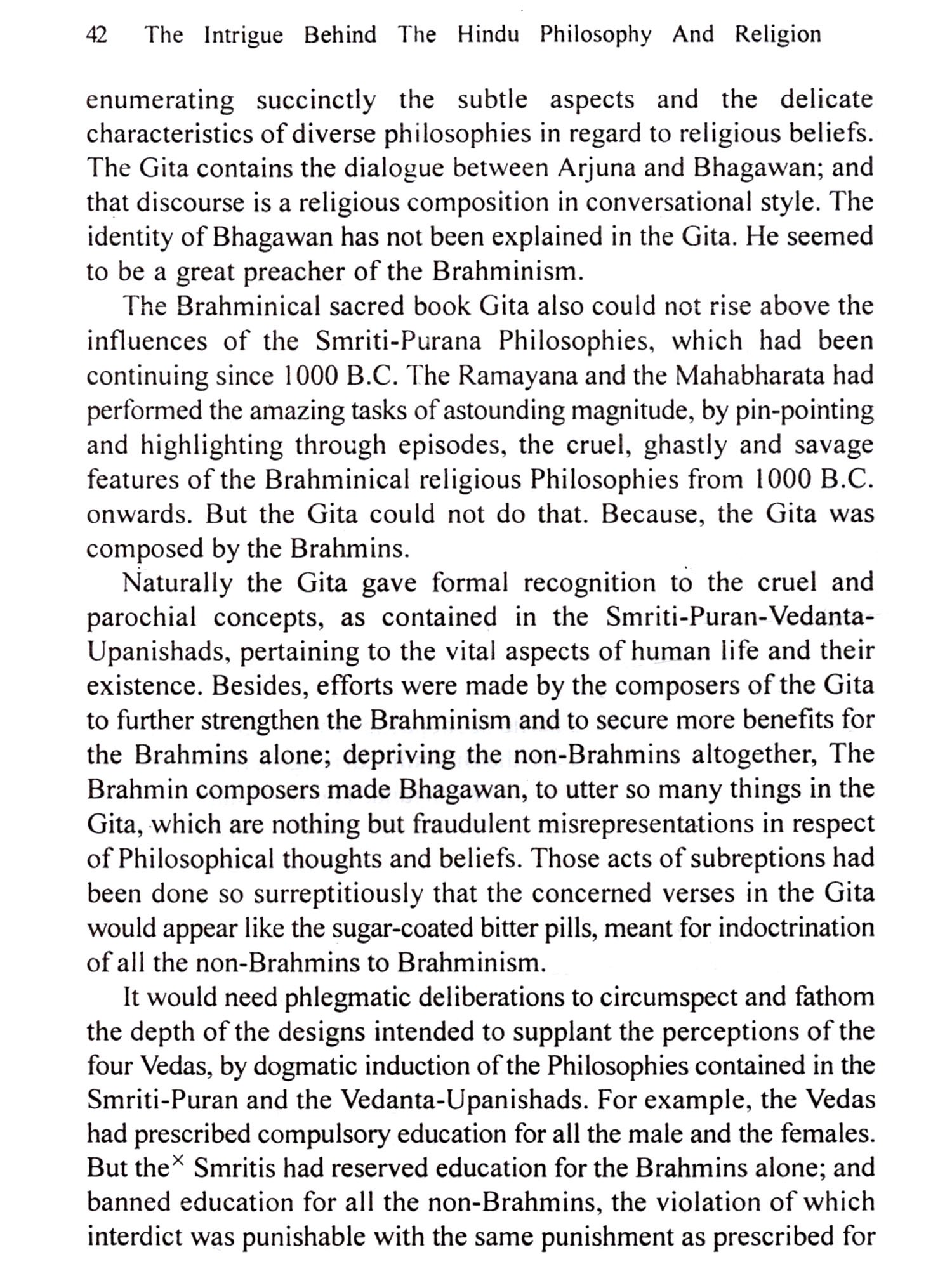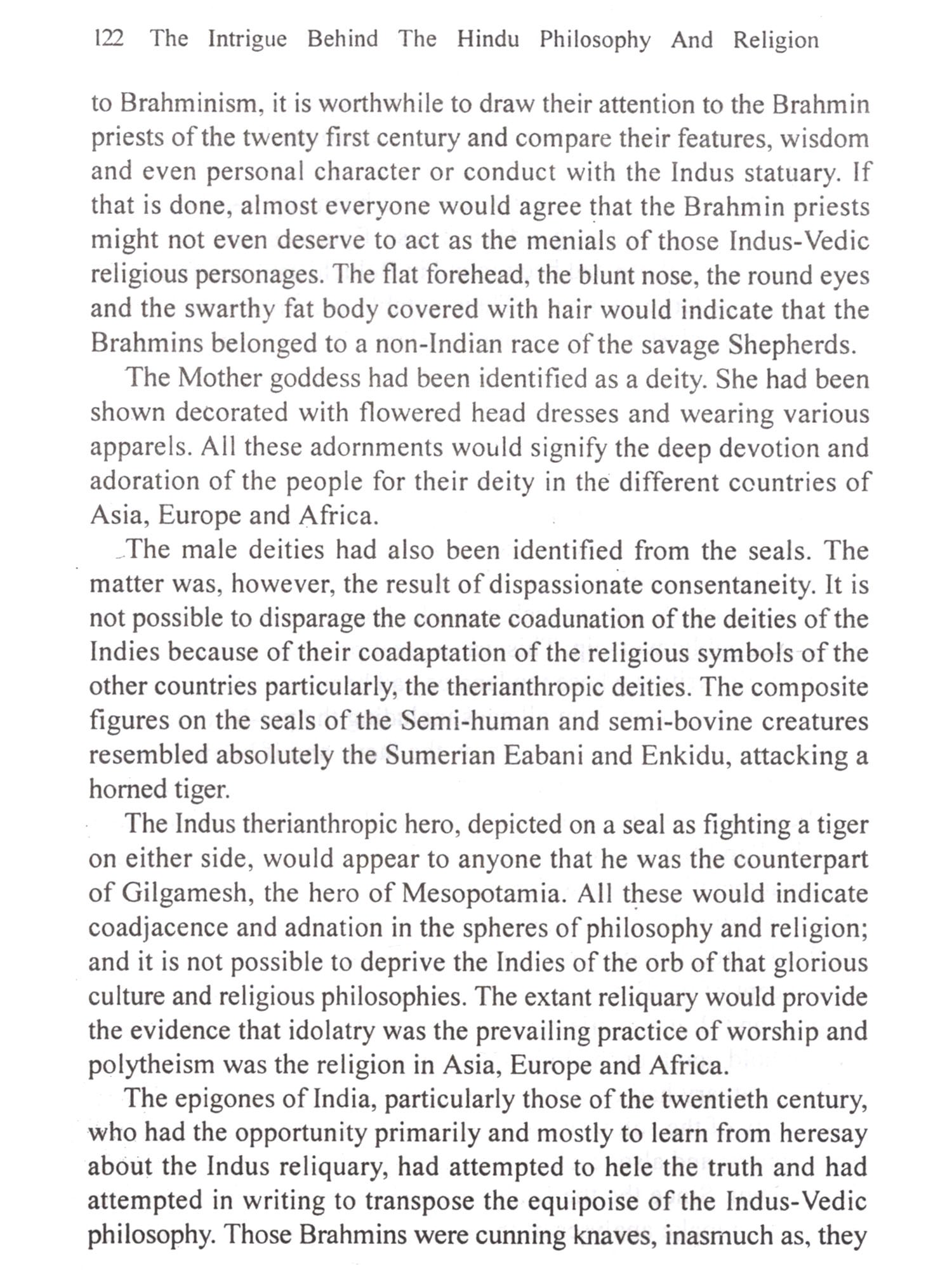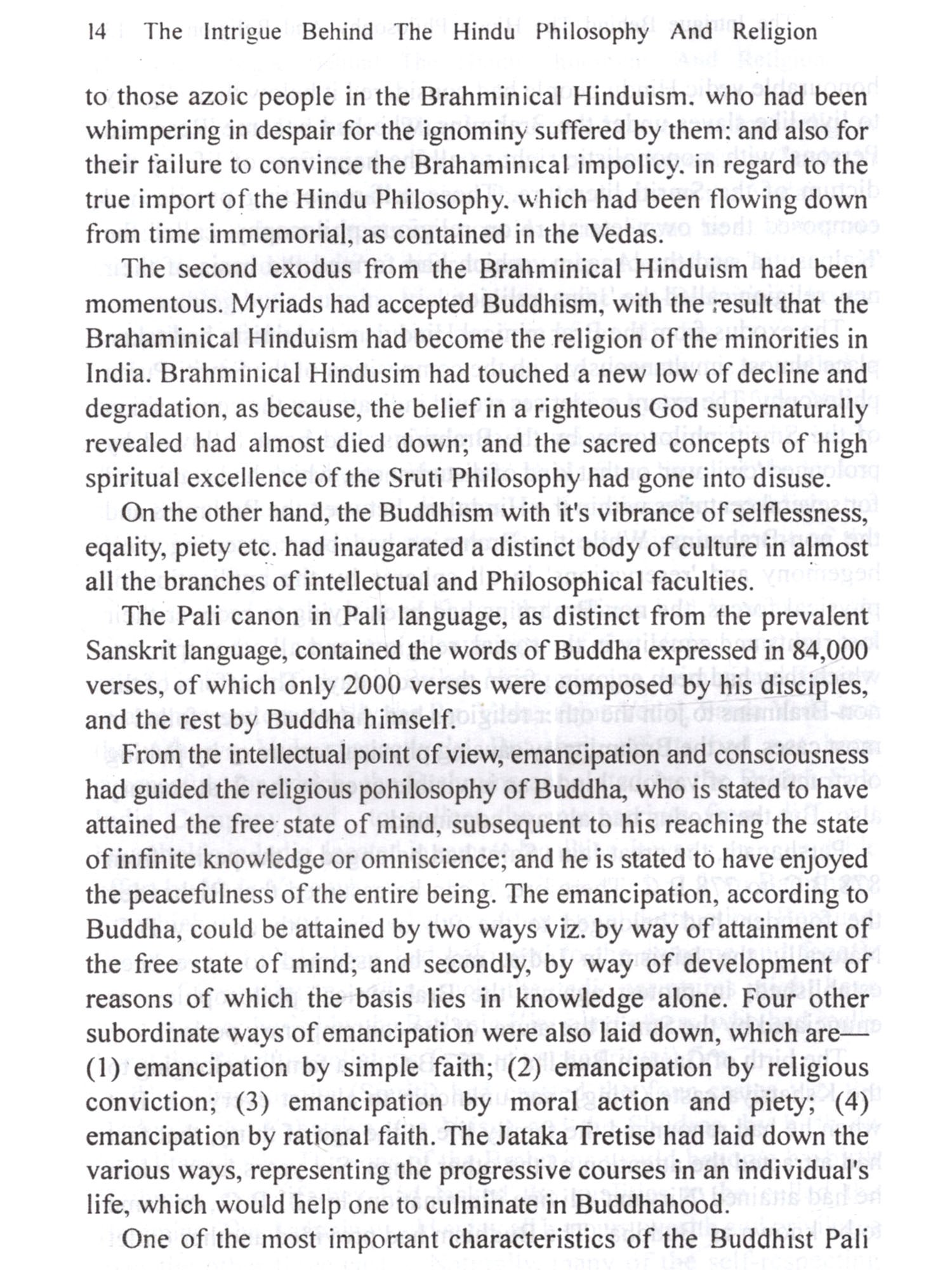 The Hindu Philosophy of religion, the oldest in the world, as contained in the four Vedas viz. Rig. Sam, Jaju and Atharba were composed by the autochthonous Hindus before 1500 BC. They had ecribed the way of life of their egalitarian society of which one of the precepts is you should make endeavour to convert this world into a heaven and enjoy that heaven in this life itself, along with the others. Some of the other precepts had empowered everyone including th females to compose the Hindu Philosophy of religion; and also perform the religious ceremonies, rites and rituals; and everyone could pursue any profession due to the system of compulsory education. This is Hinduism in brief, the Philosophy of which would provide absorbing literature for fascinating experiences. Subsequently, a foreign race of Shepherds had come and usurped the ruling power. They had assumed the sobriquet 'Brahmin' to conceal their origin. They had described their way of life and also announced the mandates of their martial polity to rule over the Hindus for eternity through their compositions viz. Smriti-Puran-Vedanta-Upanishads-Gita etc. which had 'reserved' all the rights and privileges only for the Brahmins. The Hindus (and even the daughters of the Brahmins) were deprived of their imprescriptible rights through savage cruelties. That is Brahrainism, the Philosophy of which would evoke disenchanting conjectures. Their Text had created heaven only for the Brahmins. The non-Brahmins are, however, prohibited by the Text to read the same. These types of irreligious injunctions in the religious Text coupled withd the permission to commit brutal crimes by the Brahmins againts the Hindus with impunity always helped the Brahminism to flourish by subjugating the Hindus and distorting their Philosophy of religion. The 'divide and rule policy of the Brahmins to rule over the Hindus (non-Brahmins) for eternity by dividing them into Kshatriya, Vaisya, Shudra Castes and their original father and the original mother depicted in Tabular forms. The underlying concord between the precepts of the Hinduism, Jainism, Buddhism, Sikhism etc. have been outlined. The roles played by the Christian rulers in India have been highlighted. The necessity to have a disquisition on the impact of the Muslim rule in India a: Verses from the Smriti-Puran-Vedanta-Upanishads-Gita ete, have been reproduced. for over 1000 years on the culture, Philosophy of religion etc., of de Hindus has been discussent, The concealed fact is that the Brahmins are incligible to performs religious rites, rituals and ceremonies as debarred by their Text Manusangita. The Hindus always demanded that the Brahmins shouló give up their irreligiously usurped rights; and merge with the sons of the soil, as was done by all the other foreign races like the Greeks, the Psytho-Parthians, the Yue-Chi etc. In 1947 the rulers of about 500 independent states had given up their 'right to rule" and merged with the people of India. Shortly before that, the "Depressed class' (Scheduled Caste) did not establish separate independent states for themselves on the basis of the 'separate electorate granted to them by the British government, although the Muslims had established West Pakistan and East Pakistan (Bangladesh) for themselves on the basis of the same decision. If the Scheduled Caste had established separate independerit states for themselves, they would have become the Presidents, Prime-Ministers, Governors, Chief Ministers etc.of their states. But the Scheduled Caste people had sacrificed those bright prospects of their future generations! Otherwise, several Passport and Visa would have been necessary to travel in India. In 1947, the British rulers had left India; and the Indians got complete freedom. The Brahmins did not learn from those illustrations and have been continuing with their usurpations, though about one per cent. That is why the Hindus (non-Brahmins) though 99 per cent, do not possess even the 'equal right to religion' till now in spite of the constitutional guarantee; and that amounted to virtual denial of citizenship to one thousand millions of Hindus! All these indicated the impact of the different Philosophy of religion as expressed through the conduct of their adherents. The precepts of the Brahminical Texts viz. Smriti-Puran-Vedanta-Upanishads-Gita etc. are opposed to the objectives of the U.N.O. and the Commonwealth; and those precepts are responsible for the continuing backwardness as also the isolation of India in the international sphere which have been analysed. It seems, the different Philosophy of religion in the world have been relegated by the statesmanship of 192 member countries of the U.N.O. and now a dynamic philosophy of religion would have to be evolved to meet the changing requirements of a progressive world.