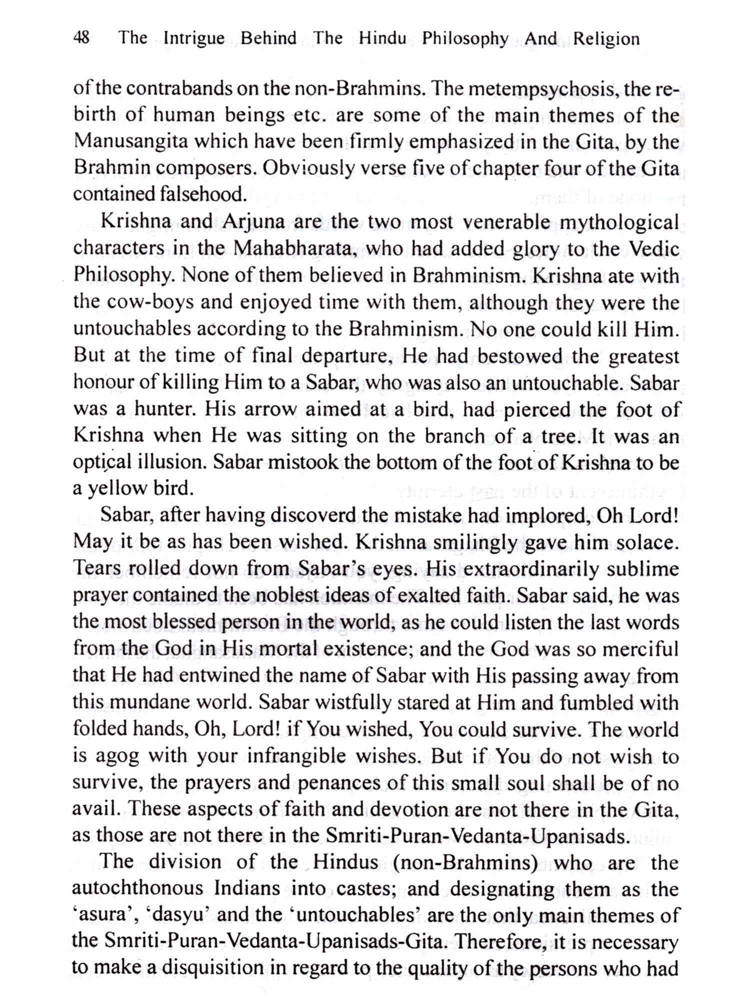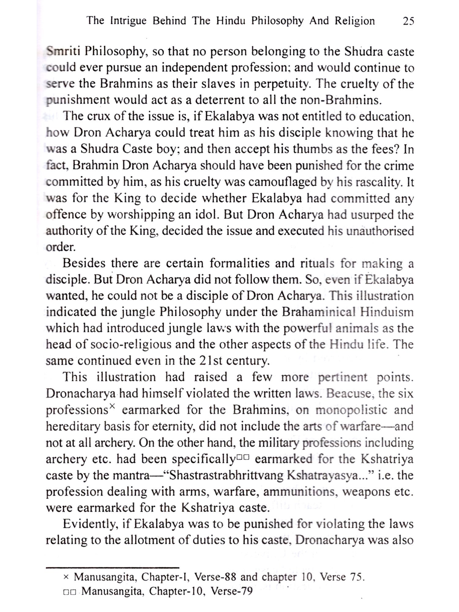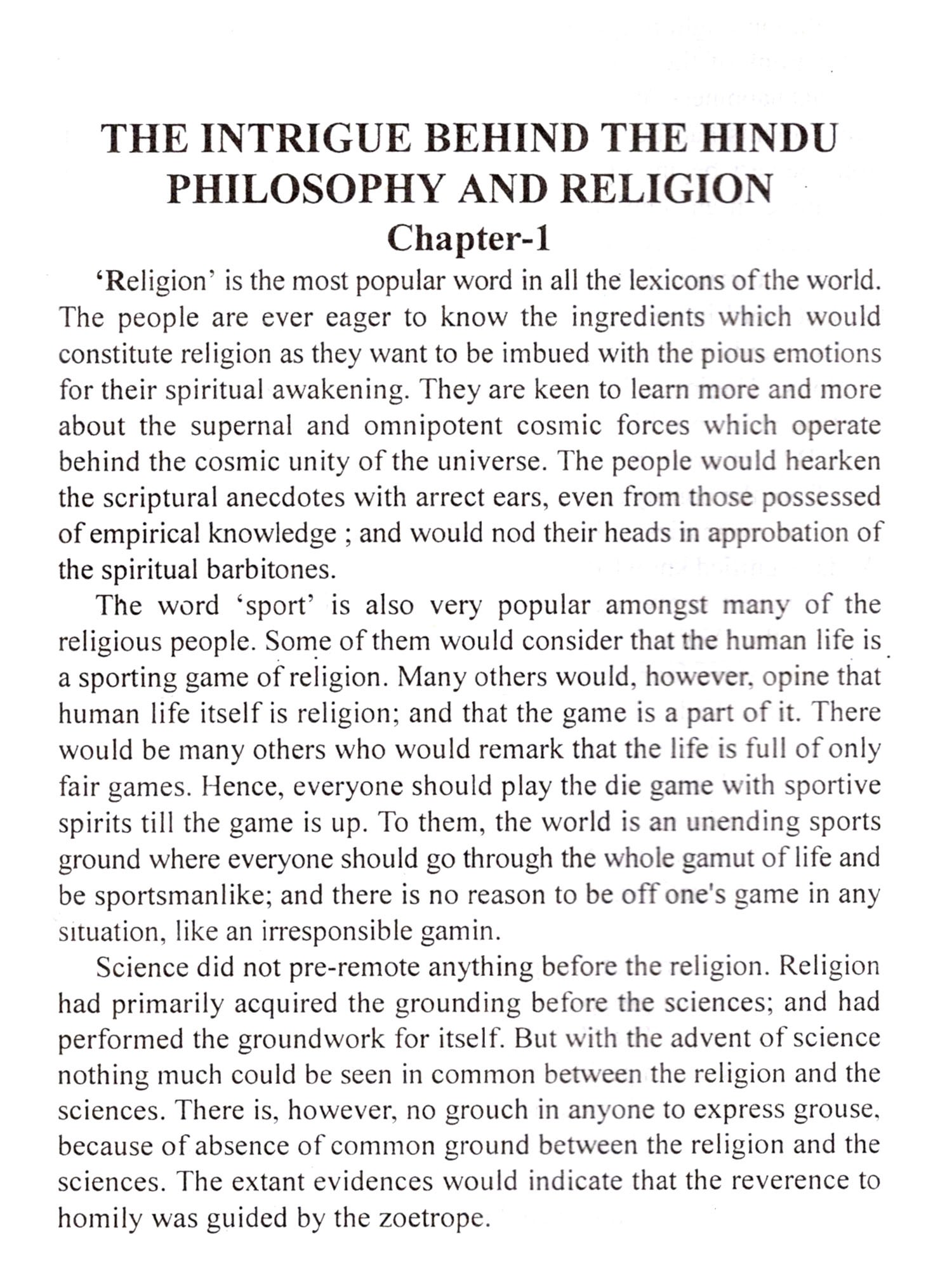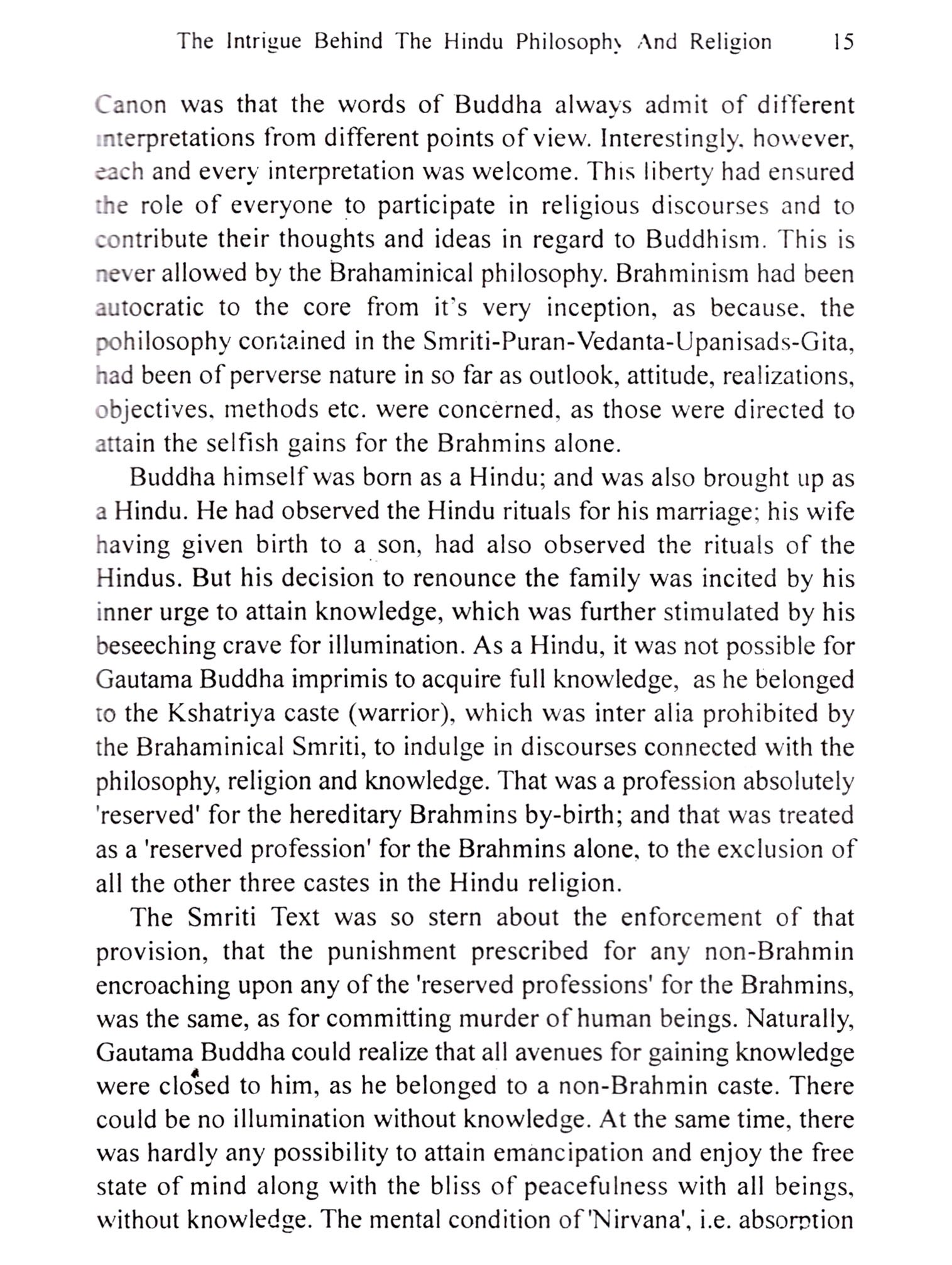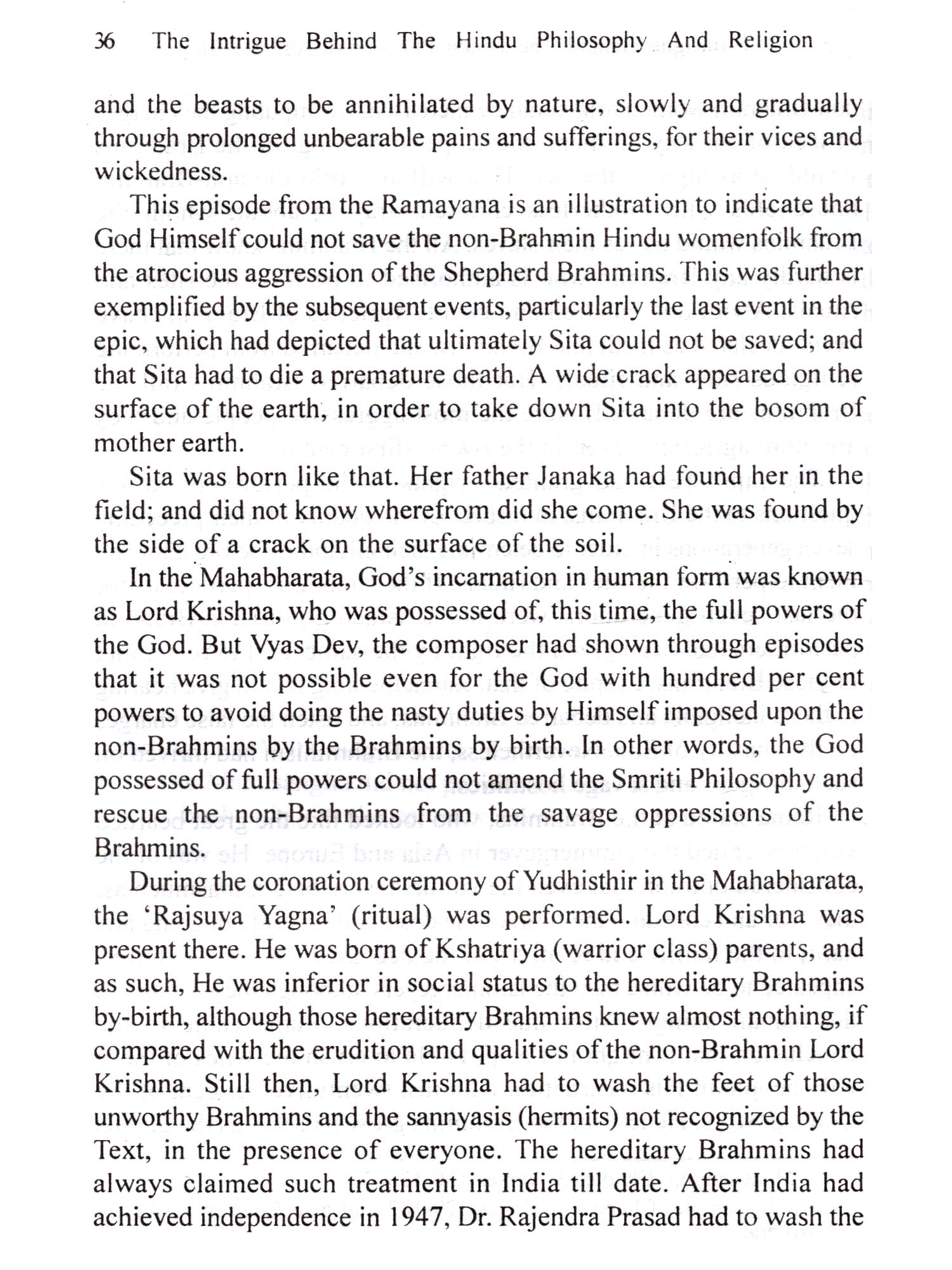 The Hindu Philosophy of religion, the oldest in the world, as contained in the four Vedas viz. Rig. Sam, Jaju and Atharba were composed by the autochthonous Hindus before 1500 BC. They had ecribed the way of life of their egalitarian society of which one of the precepts is you should make endeavour to convert this world into a heaven and enjoy that heaven in this life itself, along with the others. Some of the other precepts had empowered everyone including th females to compose the Hindu Philosophy of religion; and also perform the religious ceremonies, rites and rituals; and everyone could pursue any profession due to the system of compulsory education. This is Hinduism in brief, the Philosophy of which would provide absorbing literature for fascinating experiences. Subsequently, a foreign race of Shepherds had come and usurped the ruling power. They had assumed the sobriquet 'Brahmin' to conceal their origin. They had described their way of life and also announced the mandates of their martial polity to rule over the Hindus for eternity through their compositions viz. Smriti-Puran-Vedanta-Upanishads-Gita etc. which had 'reserved' all the rights and privileges only for the Brahmins. The Hindus (and even the daughters of the Brahmins) were deprived of their imprescriptible rights through savage cruelties. That is Brahrainism, the Philosophy of which would evoke disenchanting conjectures. Their Text had created heaven only for the Brahmins. The non-Brahmins are, however, prohibited by the Text to read the same. These types of irreligious injunctions in the religious Text coupled withd the permission to commit brutal crimes by the Brahmins againts the Hindus with impunity always helped the Brahminism to flourish by subjugating the Hindus and distorting their Philosophy of religion. The 'divide and rule policy of the Brahmins to rule over the Hindus (non-Brahmins) for eternity by dividing them into Kshatriya, Vaisya, Shudra Castes and their original father and the original mother depicted in Tabular forms. The underlying concord between the precepts of the Hinduism, Jainism, Buddhism, Sikhism etc. have been outlined. The roles played by the Christian rulers in India have been highlighted. The necessity to have a disquisition on the impact of the Muslim rule in India a: Verses from the Smriti-Puran-Vedanta-Upanishads-Gita ete, have been reproduced. for over 1000 years on the culture, Philosophy of religion etc., of de Hindus has been discussent, The concealed fact is that the Brahmins are incligible to performs religious rites, rituals and ceremonies as debarred by their Text Manusangita. The Hindus always demanded that the Brahmins shouló give up their irreligiously usurped rights; and merge with the sons of the soil, as was done by all the other foreign races like the Greeks, the Psytho-Parthians, the Yue-Chi etc. In 1947 the rulers of about 500 independent states had given up their 'right to rule" and merged with the people of India. Shortly before that, the "Depressed class' (Scheduled Caste) did not establish separate independent states for themselves on the basis of the 'separate electorate granted to them by the British government, although the Muslims had established West Pakistan and East Pakistan (Bangladesh) for themselves on the basis of the same decision. If the Scheduled Caste had established separate independerit states for themselves, they would have become the Presidents, Prime-Ministers, Governors, Chief Ministers etc.of their states. But the Scheduled Caste people had sacrificed those bright prospects of their future generations! Otherwise, several Passport and Visa would have been necessary to travel in India. In 1947, the British rulers had left India; and the Indians got complete freedom. The Brahmins did not learn from those illustrations and have been continuing with their usurpations, though about one per cent. That is why the Hindus (non-Brahmins) though 99 per cent, do not possess even the 'equal right to religion' till now in spite of the constitutional guarantee; and that amounted to virtual denial of citizenship to one thousand millions of Hindus! All these indicated the impact of the different Philosophy of religion as expressed through the conduct of their adherents. The precepts of the Brahminical Texts viz. Smriti-Puran-Vedanta-Upanishads-Gita etc. are opposed to the objectives of the U.N.O. and the Commonwealth; and those precepts are responsible for the continuing backwardness as also the isolation of India in the international sphere which have been analysed. It seems, the different Philosophy of religion in the world have been relegated by the statesmanship of 192 member countries of the U.N.O. and now a dynamic philosophy of religion would have to be evolved to meet the changing requirements of a progressive world.