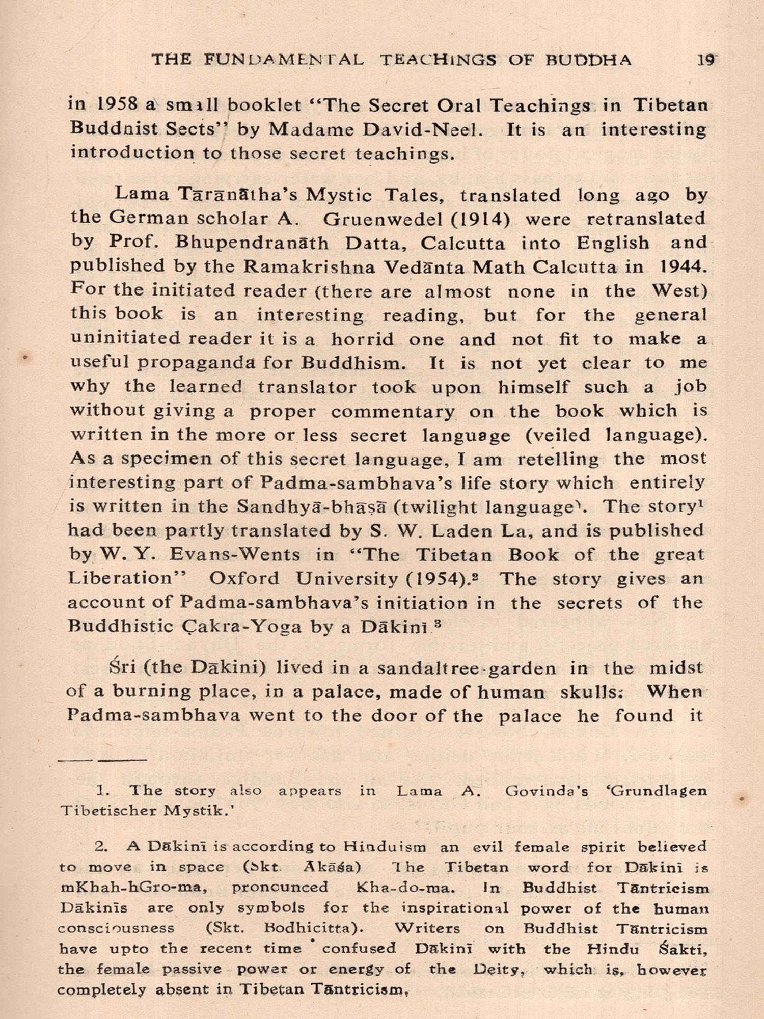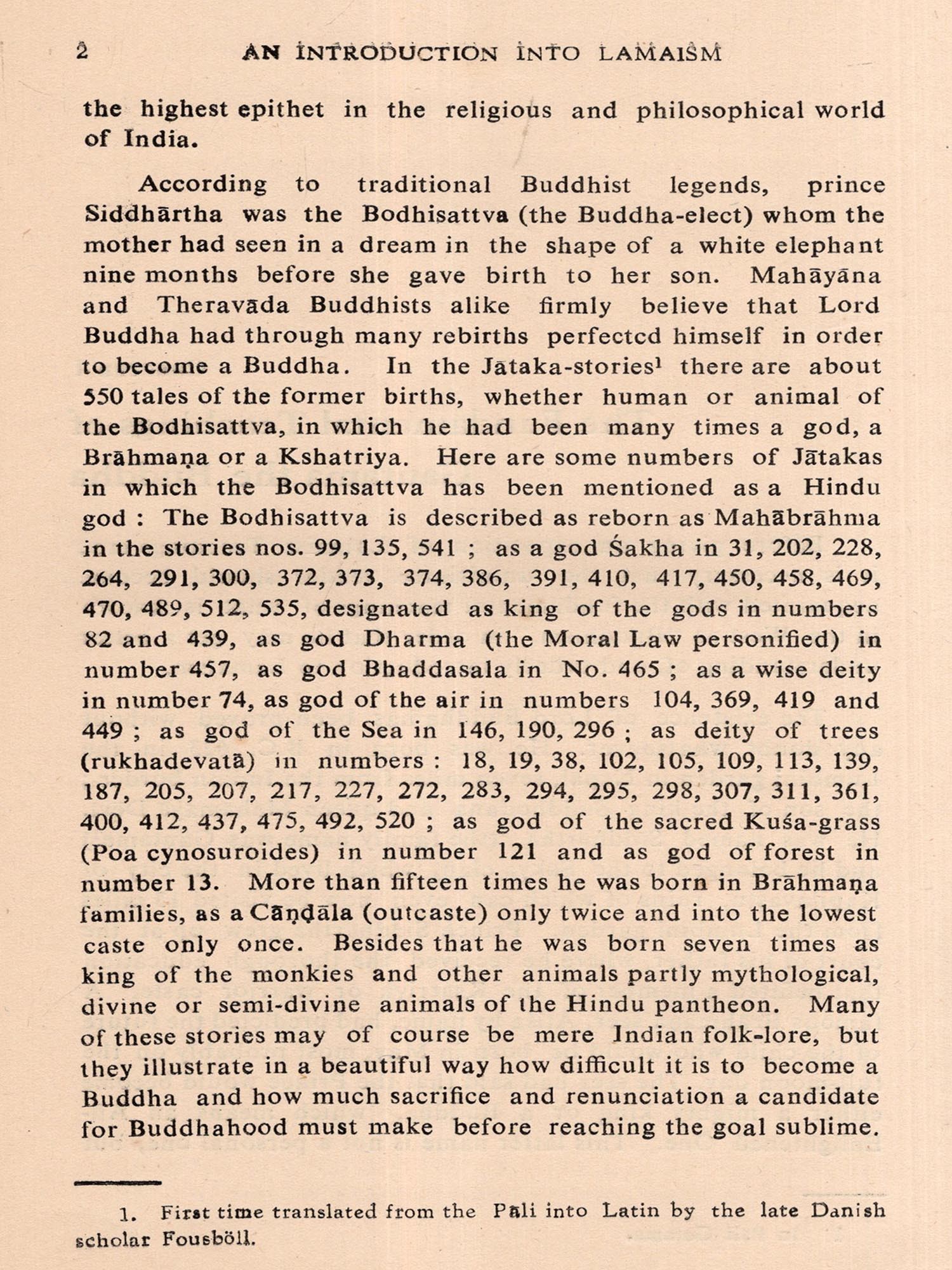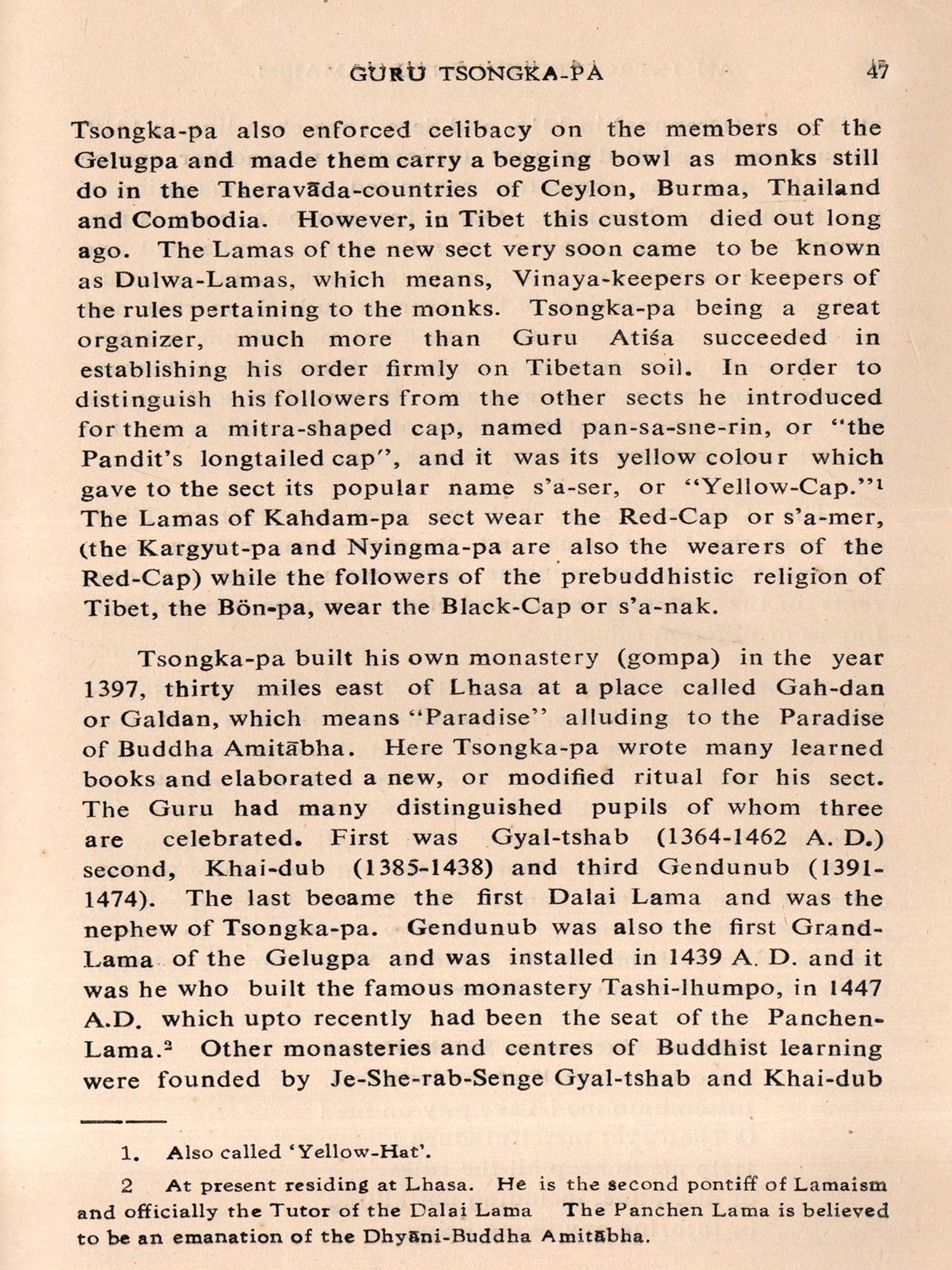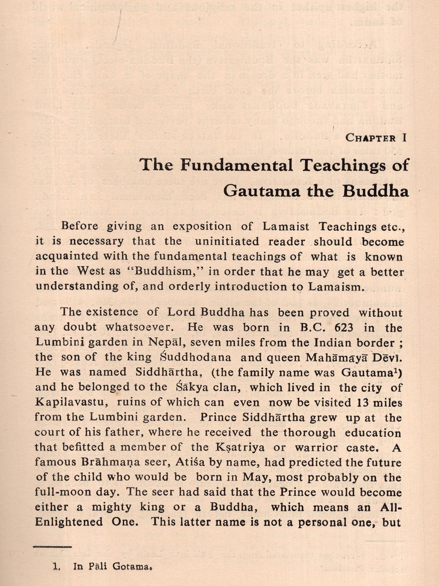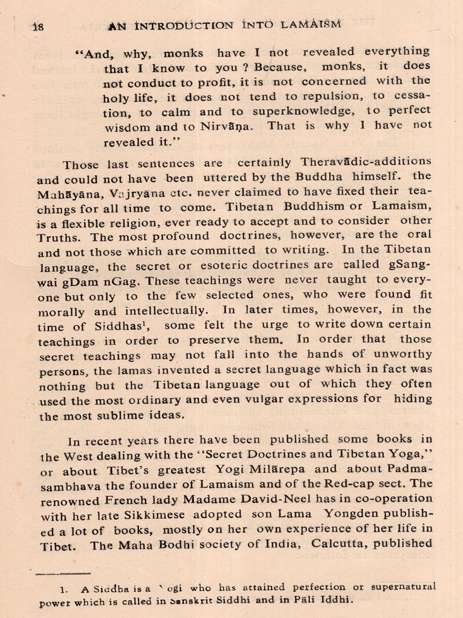 At that time I was the Bhiksu in-charge of the Ananda Vihara, Bombay, a Maha-Bodhi Society centre, and I took the rare opportunity to invite the Tibetan spiritual and temporal heads to our temple. The invitation was graciously accepted and responded to on the 9th of December, 1956. All those who had the privilege to be present during the Tibetan reception ceremony at the Ananda Vihara were deeply impressed by the nobility, friendliness and informality of the two young Grandlamas who won the heart of the Indian people. After this historical visit, quite a lot of visitors approachad me to know about the Creed of the Lamas of which they confessed their ignorance. Some others frankly admitted that they had the idea that Tibetan Buddhism or Lamaism was a crude and corrupted form of Lord Buddha's teachings, connected with devil-worship, black magic and sexual "rituals". I tried my best to explain the true nature of Lamaism and then I was urged by the inquirers to prepare a book on the subject of Lamaism. A few days later, I was again with the two Grandlamas at Holy Isipatana-Sarnath, the place where Lord Buddha delivered his first great Sermon. Thereafter we proceeded to Buddhagaya in order to worship at the famous temple and under the Bodhi-tree where the former Sakya prince Siddhartha obtained the Highest Enlightenment, and there I took a vow to write as soon as possible, a book on Lamaism, an introduction and guide to further studies.