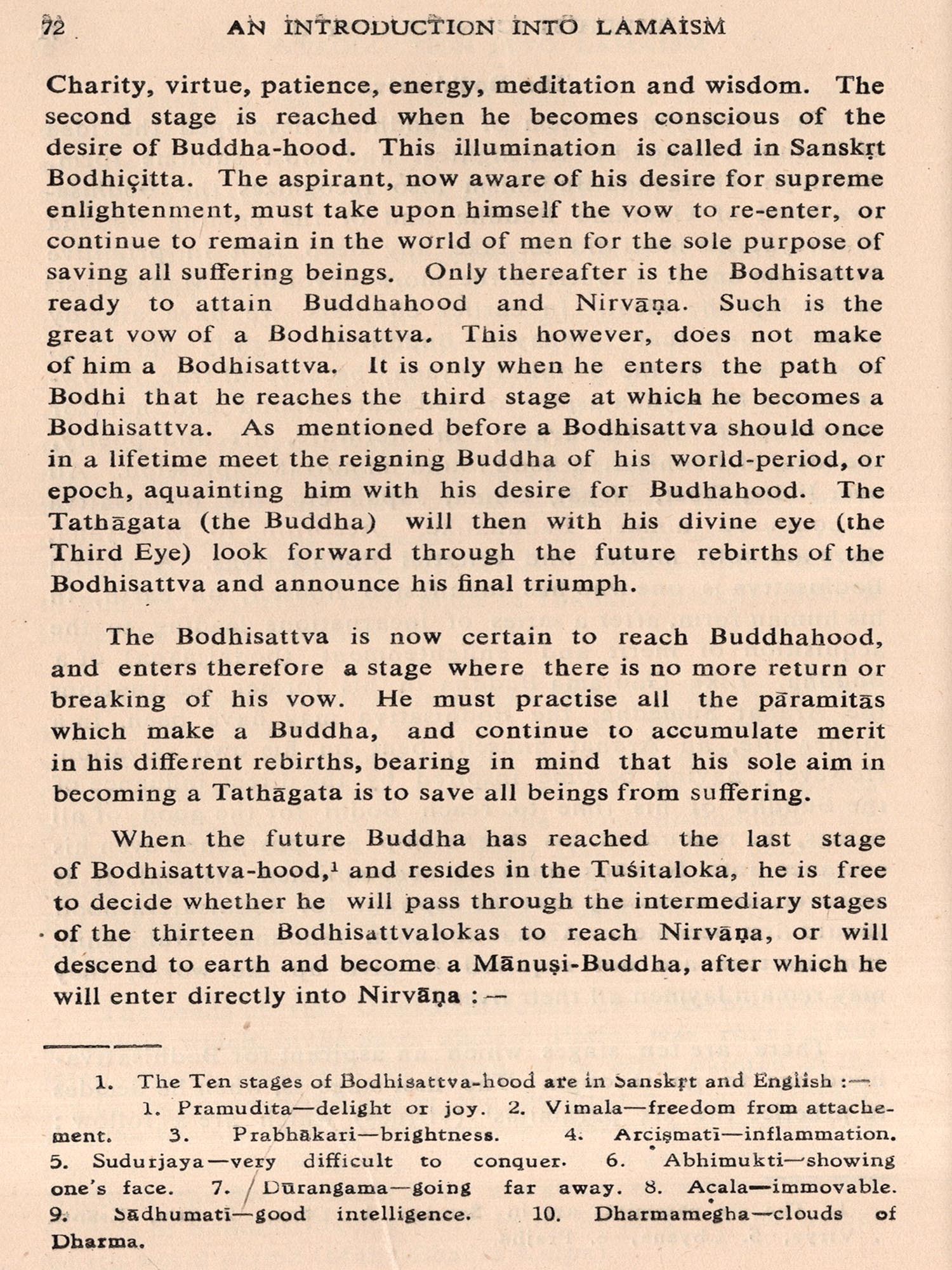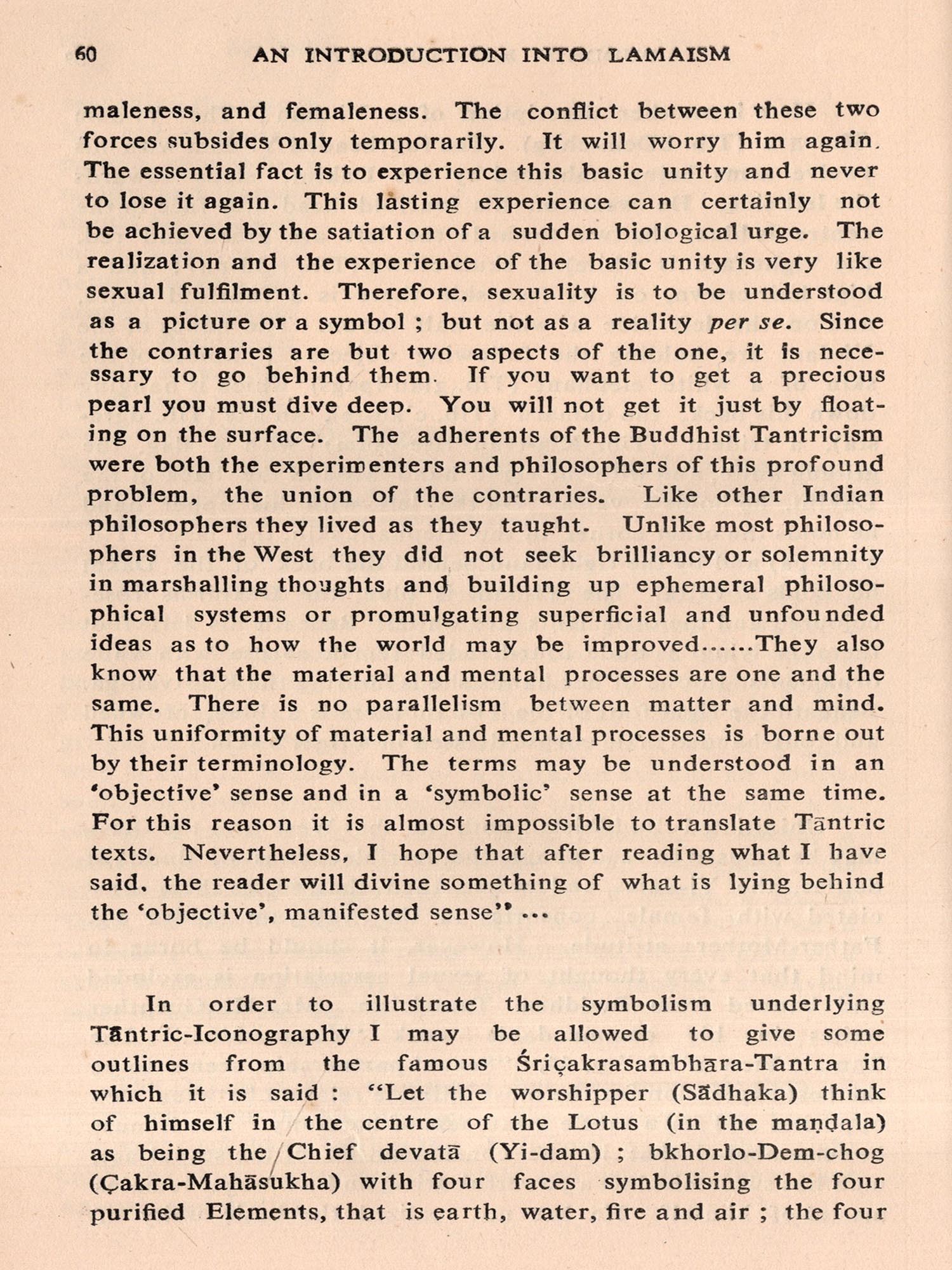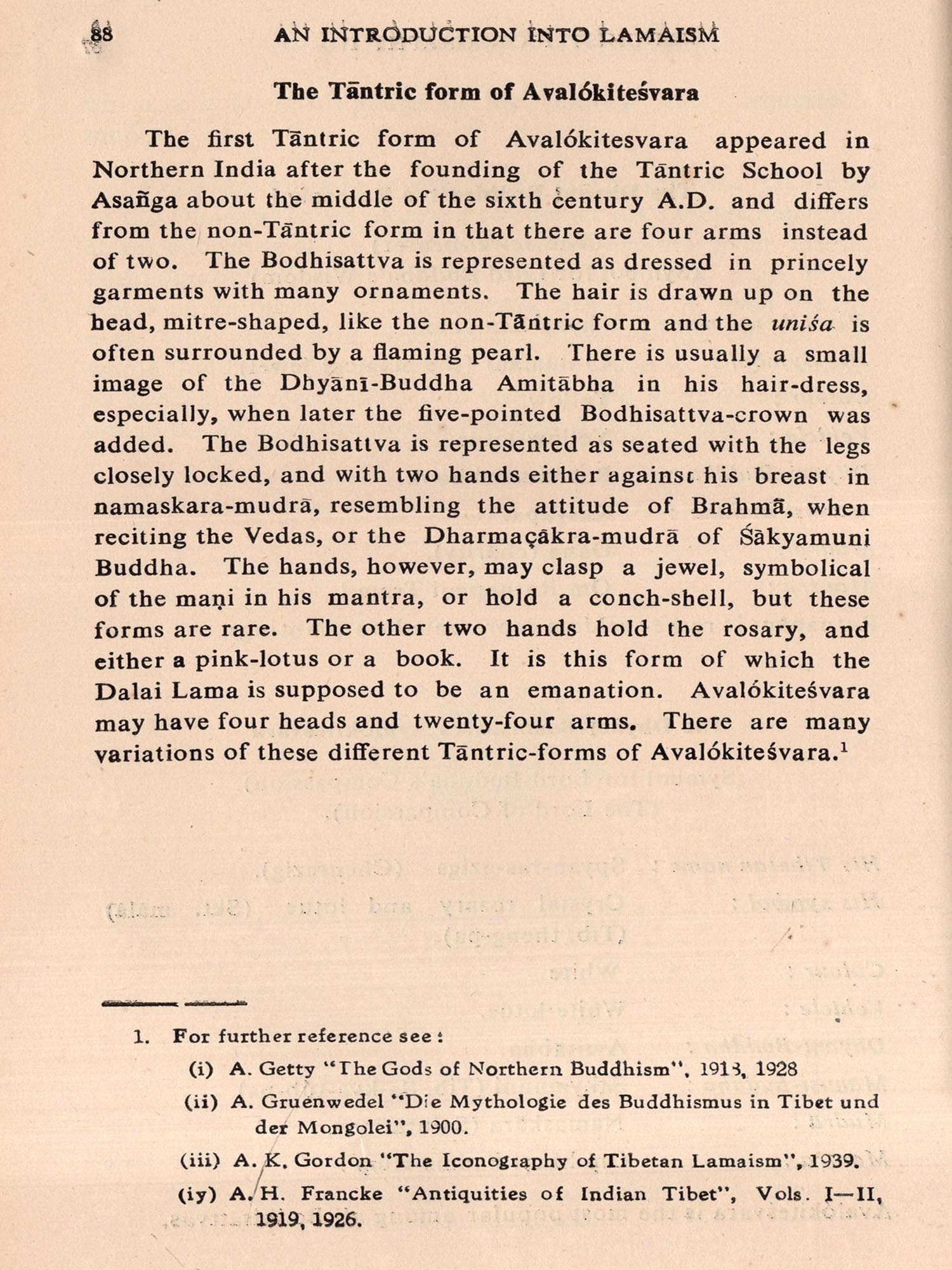 In the present work I have tried to give all fundamental features of Lamaism, the Tibetan form of Buddhism; its history, rituals, Tantricism and Iconography, but I do not pretend to have given a complete account of this vast field of religiophilosophical ideas. It is impossible to cover the whole field in one book. For the most earnest student of Lamaism and Tibetology, I have given at the end a list of books which may be consulted for further studies.