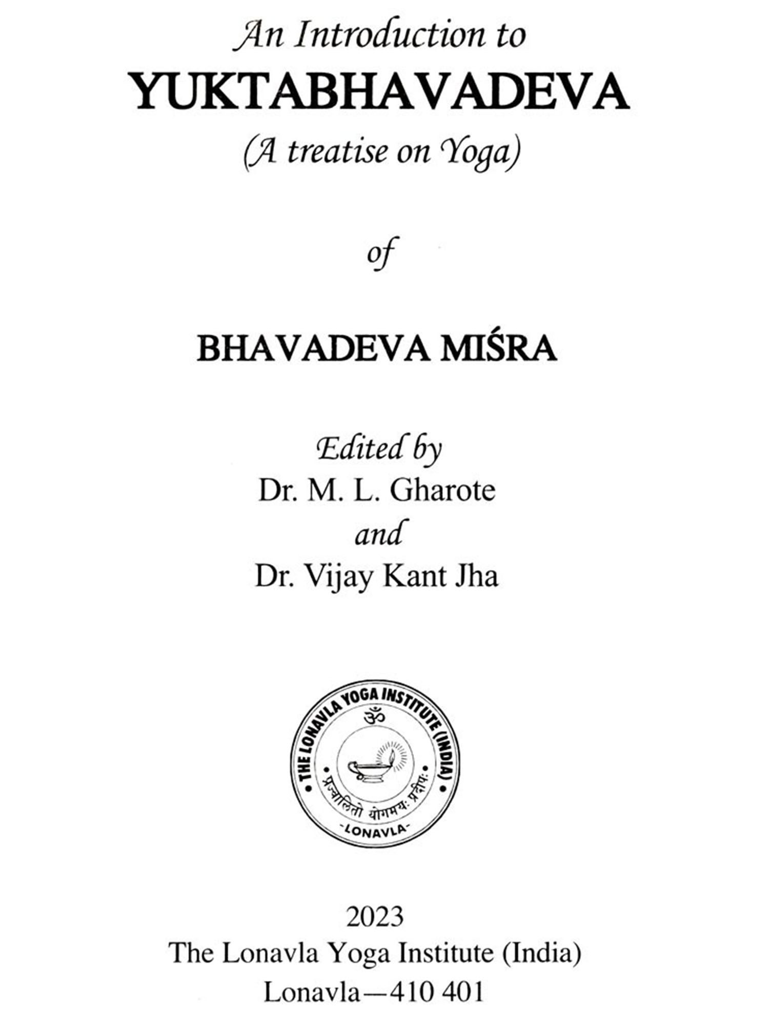 Yuktabhavadeva is a treatise which is about 400 years old. It has been listed in the KKKK, Catalogue of Yoga Manuscripts and other catalogues. Despite this fact, it has not attracted the attention of scholars, research workers and yoga enthusiasts upto now, as a result of which such an important treatise on yoga remained unknown. Looking to the valuable contents of yoga in this treatise, the Lonavla Yoga Institute (India) considered it desirable to bring it to the notice of yoga community by editing and publishing this text.