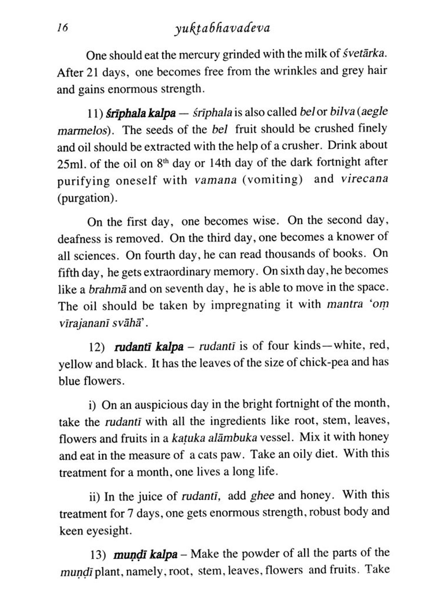 bhavadeva's erudition can be judged on the basis of the references he quotes frequently from the sanskrta texts like sruti, smrti, purana, ayurveda, darsana in support of his explanations of the various topics of yoga. In case of the conflicting views, he presents his opinion in prose form in an attempt to reconcile the diverse views. From this we can judge his critical acumen.