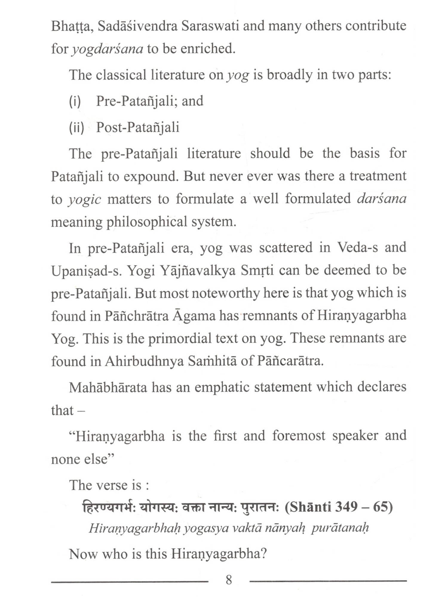 This is an attempt to introduce classical yog which has come down to us from very very ancient times. Traditionally yog is a sastra and a darsana. But in our times it has become a subject of practicality for wellness in life. That aspect of yog which serves the modern and worldly human is being highlighted and therefore yog has become extremely popular. Hence yog has become well-known but it is also greatly misconstrued. A couple of centuries back it was misconstrued differently and was considered to be a subject not for one and all but only for a few 'out-of-world' persons! It was believed to be a very abstruse and mysterious subject and hence was kept away from the common man. In that sense, yog was unknown while today it is widely mis-known! A persuant of yog should at some stage of study, turn to textual yog and understand the subject as it is, in the long-long tradition rather than remain selective by usefulness. Utilitarianism thus, grows unduly. Classical yog has a darsanic or philosophical base as well as a śastric base. It is a science, an art, a philosophy and culture to serve mankind not only corporeally and mentally but also wholesomely. This implies inclusion from gross to subtle to metaphysical aspects i.e.exoteric and esoteric aspects. come ly yog ecome aspect an is mely also Was bject ons! ject that It must be known that yog has its pedagogy and scholastics. The human being is not only a biological species but the container of an entire microcosm. Hence this book is an invitation to curious students to know about some basic texts of yog which have been given to us by sages of lore as well as those of the classical era. This is hoped to be a curtain raiser for the few seekers who may be curious to know the classical yog. The yogic texts give a great insight for us to 'see' within us. Yog is indeed a spiritual encyclopaedia. The texts introduced here are the body of that encyclopaedia. I am extremely thankful to my students who prepared the manuscript. It is only appropriate that I mention their names and thank Bharati Kalle, Harshal Baxi and Machhindra Daund for typing the text. I extend my thanks to Firooza Ali Razvi who did the final editing. I also thank Sri Deepak Marathe, Ideal Printers, Pune for the layout, cover design and printing.