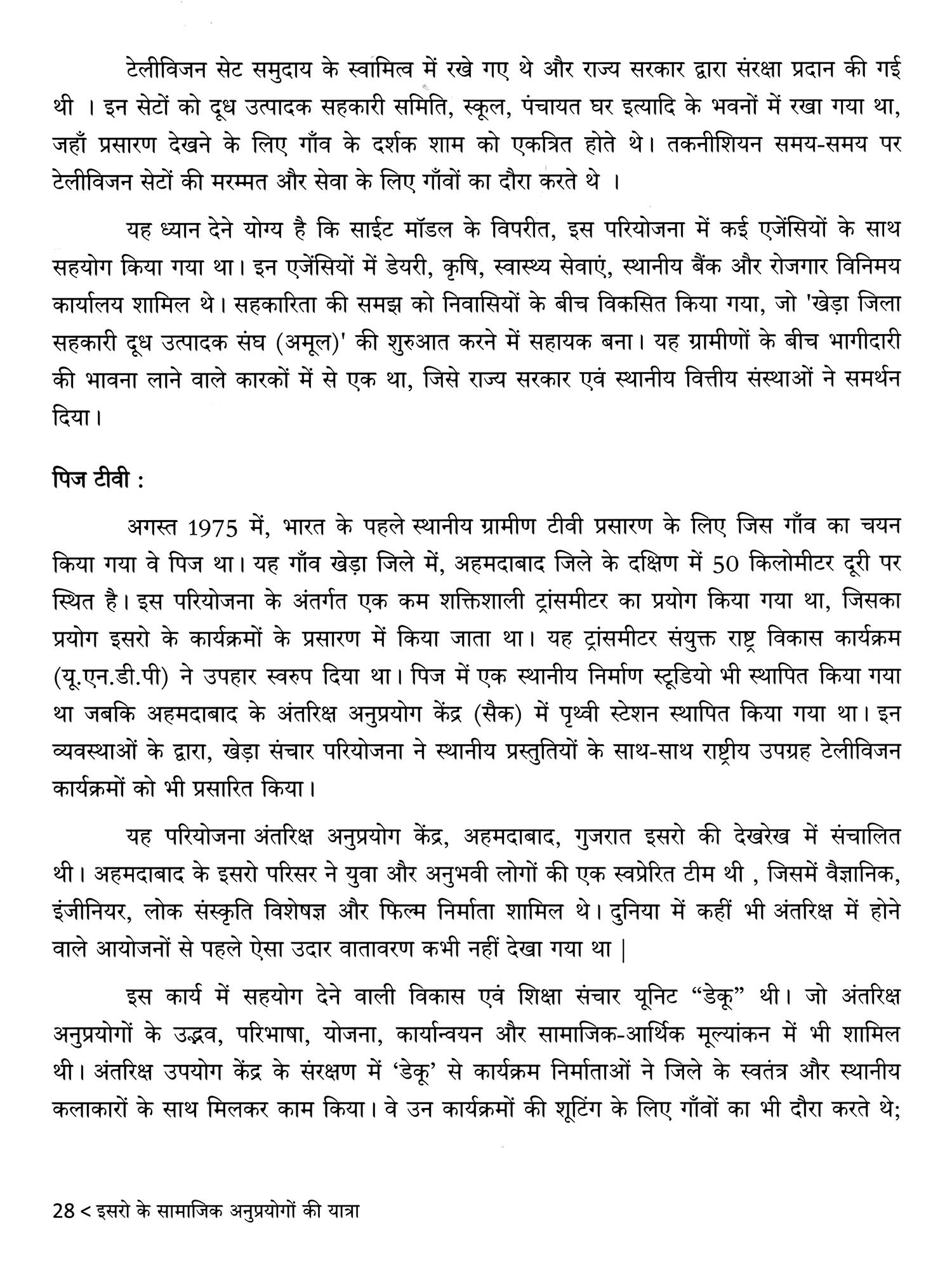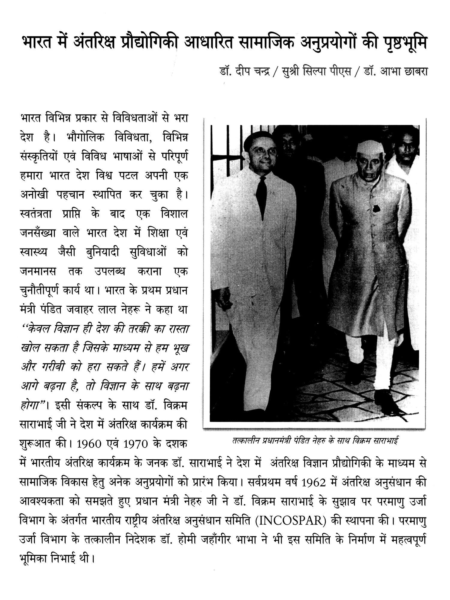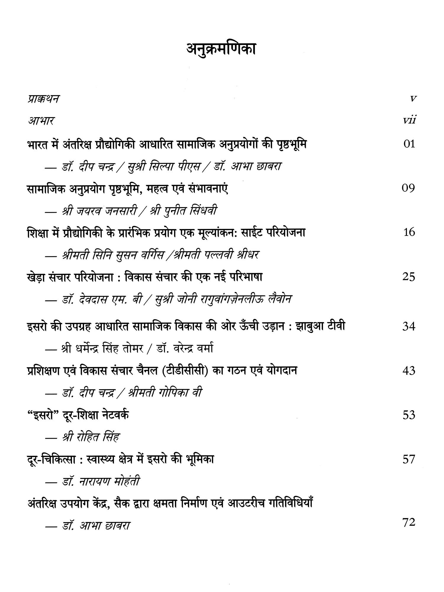 इस पुस्तक के प्रथम अध्याय में लेखकों डॉ. दीप चन्द्र, सुश्री सिल्पा पीएस एवं डॉ. आभा छाबरा ने इसरो के सामाजिक अनुप्रयोगों की विस्तृत जानकारी एवं इनके संचालन में "सैक/डेकू" की भूमिका को बताया है। दूसरे अध्याय में लेखकों श्री जयरव जनसारी एवं श्री पुनीत सिंघवी ने सामाजिक अनुप्रयोगों जैसे दूर-शिक्षा और अन्य अनुप्रयोगों की पृष्ठभूमि का वर्णन किया है। श्रीमती सिनि सुसन वर्गिस एवं श्रीमती पल्लवी श्रीधर ने तीसरे अध्याय में शिक्षा प्रदान करने हेतु देश में पहली बार अंतरिक्ष प्रौद्योगिकी का प्रयोग "साईट" परियोजना की सफलता एवं मूल्यांकन किया है। चौथे अध्याय में डॉ. देवदास एमबी एवं सुश्री-जोनी आर. लैवीन ने इसरो की बहुचर्चित "खेड़ा संचार परियोजना" के संबंध में बताया है।