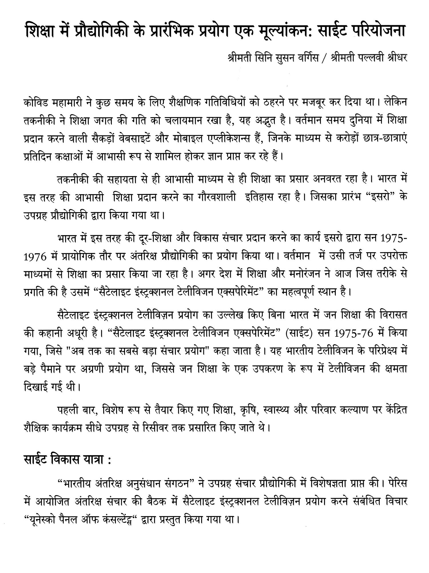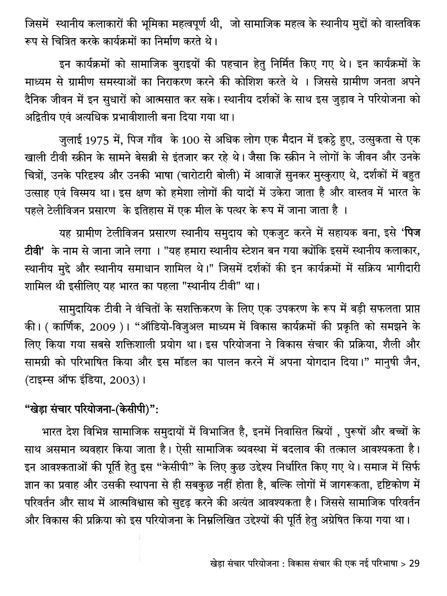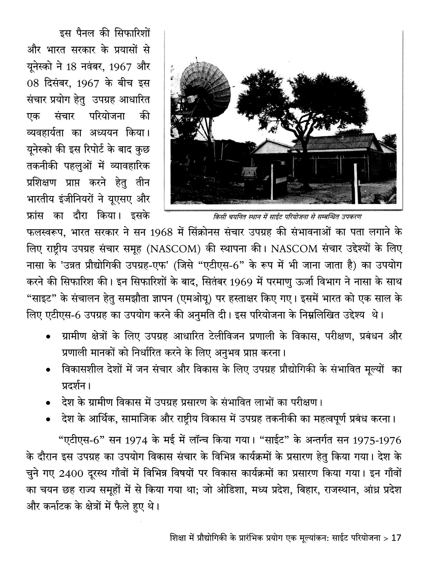पाँचवें अध्याय में श्री धर्मेन्द्र तोमर एवं डॉ. वरेन्द्र वर्मा, झाबुआ जिले में उपग्रह संचार के माध्यम से इसरो द्वारा किए गए सामाजिक अनुप्रयोग का वर्णन किया है। छठवें अध्याय में डॉ. दीप चन्द्र एवं श्रीमती गोपिका वी ने देश की ग्रामीण जनता में शिक्षा और सामाजिक जागरुकता बढ़ाने हेतु "प्रशिक्षण एवं विकास संचार चैनल" के माध्यम से लोगों को प्रशिक्षण देने की जानकारी का वर्णन किया है।