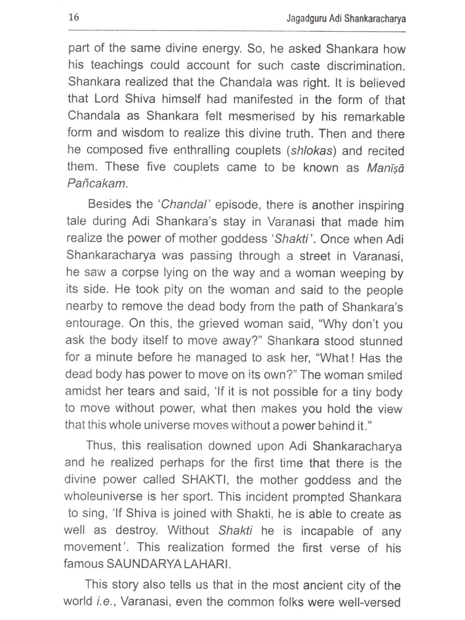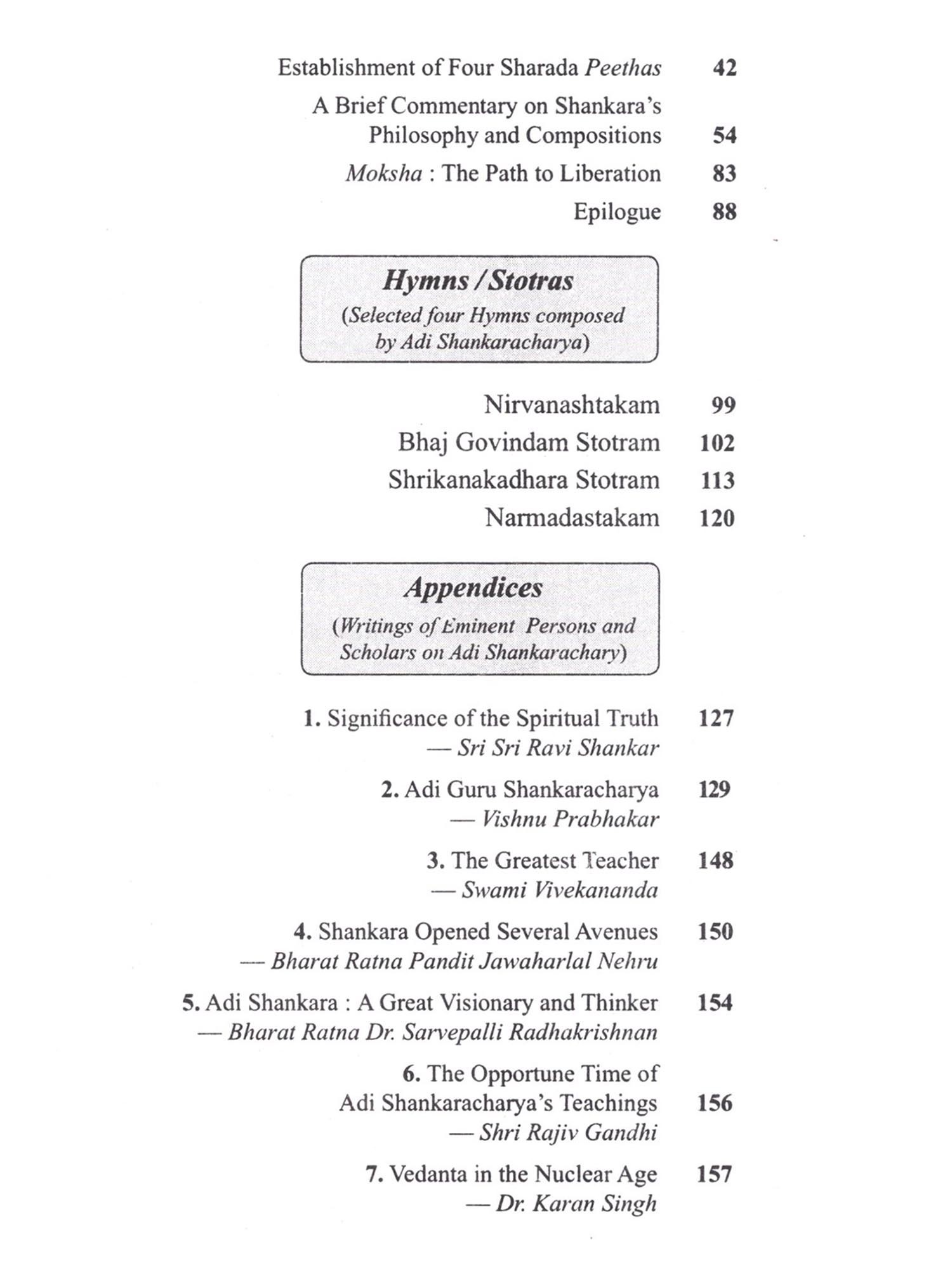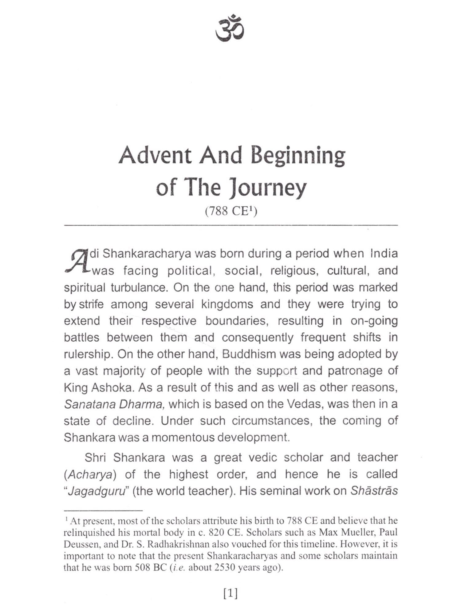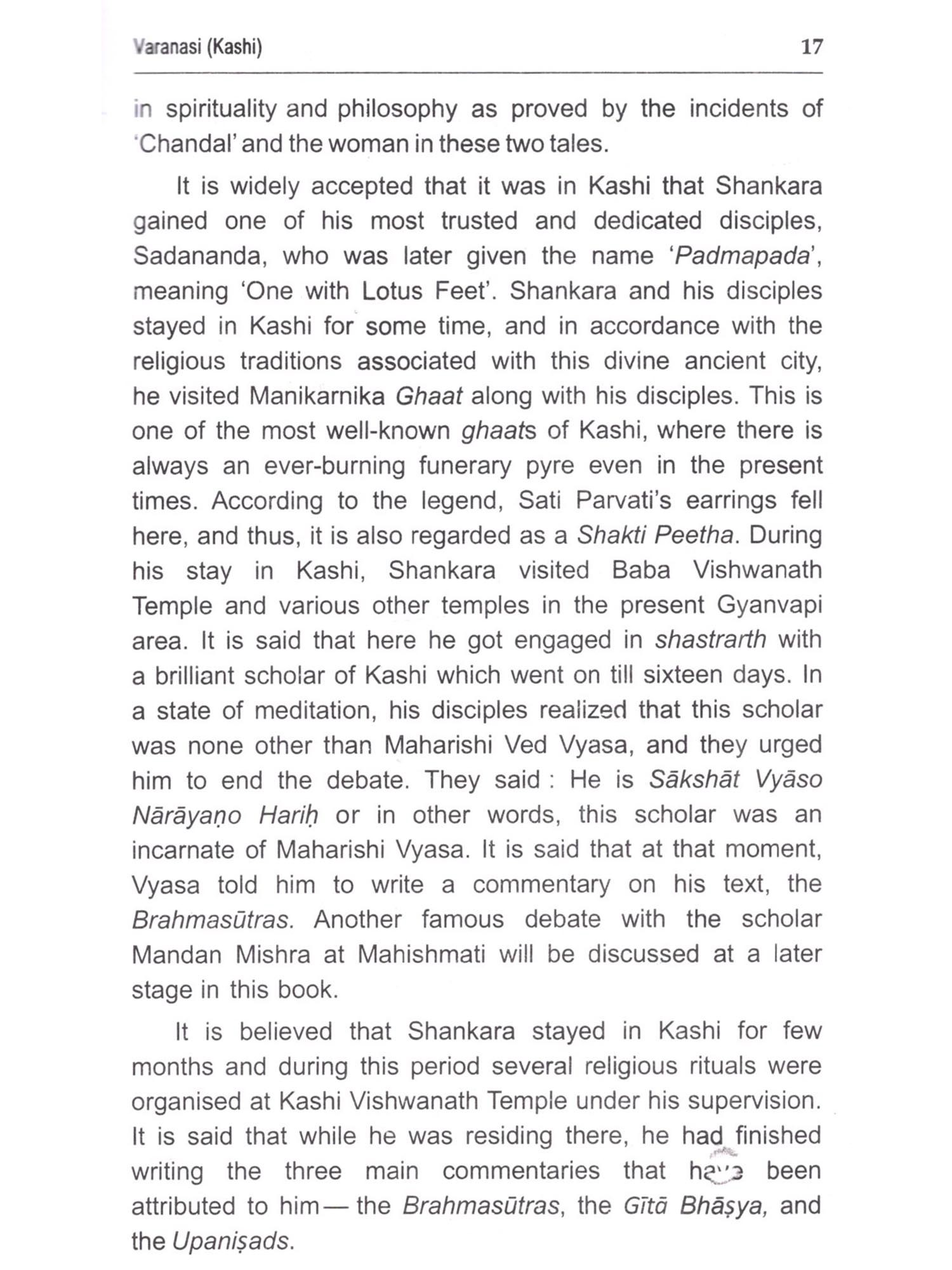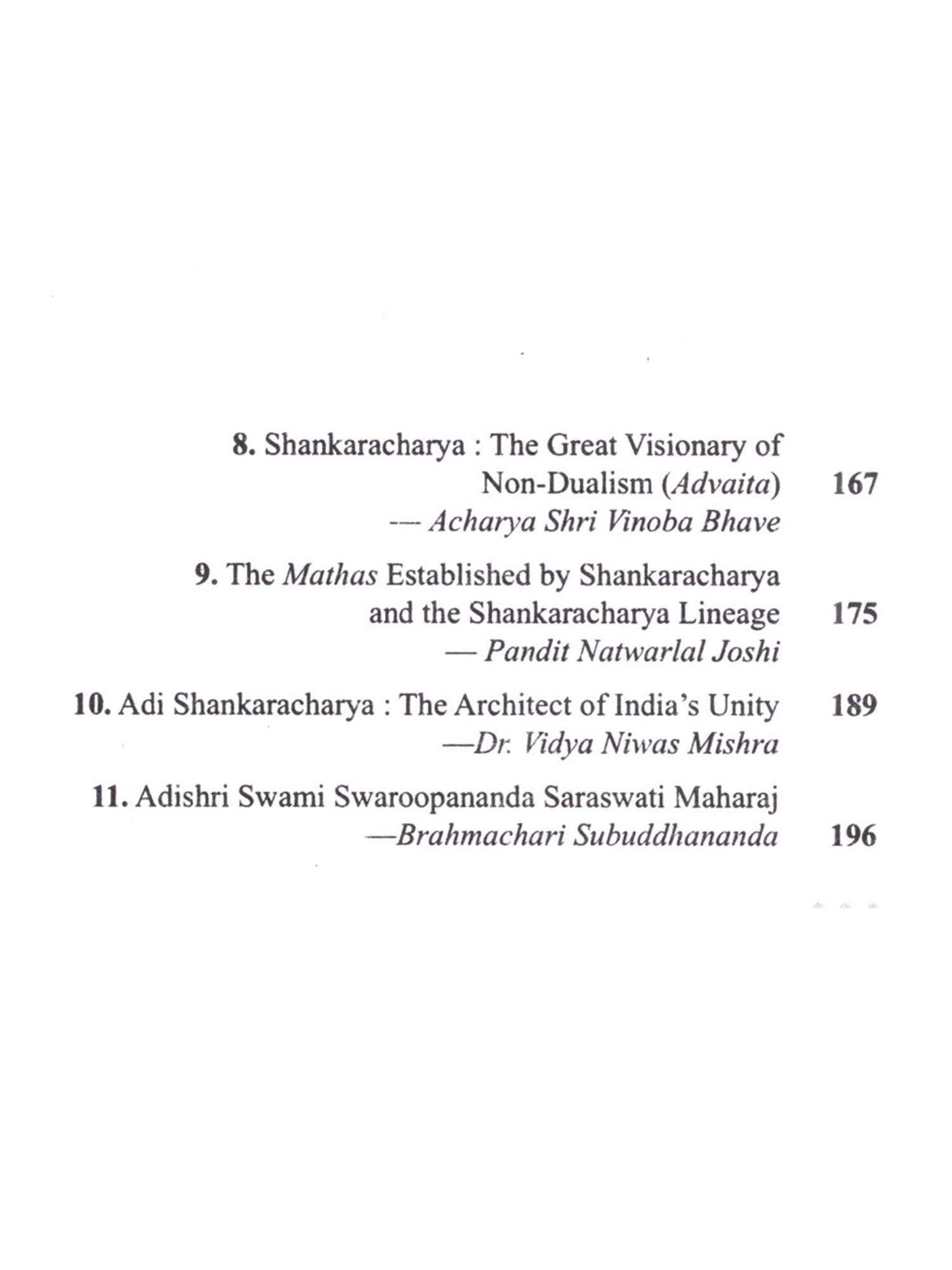 This book dwells upon the life and times of JAGADGURU ADI SHANKARACHARYA with emphasis on his journeys to various important pügrus centers, undertaken by him for the revival of Sanatana Dharms and caltural ethics of Bharatvarsha (India). It is being published at a time when the modern world is eagulpbed in mindless war and erosion of human values Adi Shankara passionately propagated the uprishadic message of ADVAITA philosophy of oneness of all living phenomena and wrote brilliant commentaries (Bhashyas) on scriptures e.g. Bhagwadgita, Brahmasutra, and t/prashads. During his travels to pilgrim centres like Varanasi, Dwarka, Srinagar (Kashmir). Kamakhaya etc. he held "Shastrarths" (Debates) with eminent contemporary scholars of those centres. During his arduous journeys, he undertook the task of revival of Sanatan Dharma at such a tumultuous time when Buddhism and Jatuam had become dominant religions, relegating the Sanatana Dharmo to margin. All these aspects and unprecedented achievements of Adi Shankara have been adequately covered in this book, which will prove to be quite inspiring for the paders, particularly the younger generation of India. Adi Shankaracharya established four main religious centres in the four corners of India with the aim of reviving Sanatana Dharmo. These four Perthes are-Badrikashram Jotish Peetho (Joshimath) in the north. Rameshwaram Sharada Peetho in the south. Dwarka Sharada Peetha in the west, and Jagannatha Puri Peetha in the east. Besides revival of Sanatana Dharma, Adi Shankaracharya immensely contributed to the enrichment of India's culture and Its spiritual traditions. All this and much more happened during his very short life span of only thirty two years.
