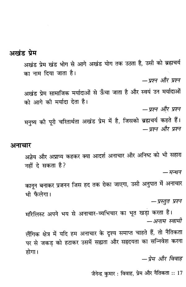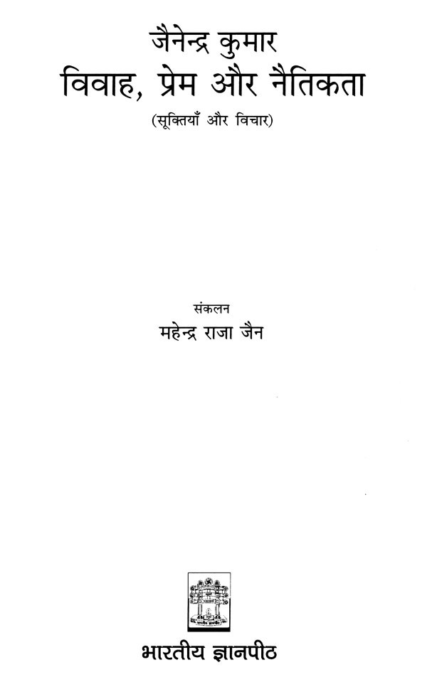 मीडिया और टेलीविजन ने 'विवाह', 'प्रेम' और 'नैतिकता'- इन तीन शब्दों को आज इतना अधिक चर्चित बना दिया है कि कभी-कभी न चाहते हुए भी लोगों की बातचीत में ये शब्द अनायास आ ही जाते हैं और जब जैनेन्द्र कुमार की बात हो तब तो किसी न किसी रूप में इनकी चर्चा होना ही है। वस्तुतः जैनेन्द्र कुमार ने इन तीनों के विषय में इतना अधिक लिखा है कि इन तीनों शब्दों की तो बात ही क्या, इनमें से किसी भी एक शब्द को जैनेन्द्र कुमार के सन्दर्भ से अलग नहीं किया जा सकता। इन तीनों पर एक साथ और अलग-अलग कई शोध ग्रन्थ भी लिखे जा सकते हैं। 'विवाह', 'प्रेम' और' नैतिकता' पर जैनेन्द्र कुमार के विचारों और सूक्तियों का यह संकलन जैनेन्द्र साहित्य के अध्ययेताओं के साथ ही जैनेन्द्र के साहित्य में थोड़ी भी रुचि रखनेवालों के लिए भी उपयोगी होगा। जैनेन्द्र कुमार ने इतने अधिक विषयों पर और इतने विस्तार से लिखा है कि किसी भी विषय पर जैनेन्द्र को ठीक से समझने के लिए इस प्रकार के सन्दर्भ ग्रन्थ की आवश्यकता से इनकार नहीं किया जा सकता। सामान्य पाठक के लिए भी रोचक और मनोरंजक इस पुस्तक में 'विवाह', 'प्रेम' और 'नैतिकता' के सम्बन्ध में लगभग 300 विषय शीर्षकों के अन्तर्गत जैनेन्द्र कुमार के विचारों का निचोड़ रख दिया गया है। यह शोध ग्रन्थ ही नहीं 'काफी टेबिल बुक' भी है, जो बुक शेल्फ ही नहीं किसी भी ड्राइंग रूम की भी शोभा बढ़ाएगी। आशा है शोधार्थियों के साथ ही सामान्य पाठकों के लिए भी समान रूप से उपयोगी इस पुस्तक का पुस्तक जगत में स्वागत होगा।