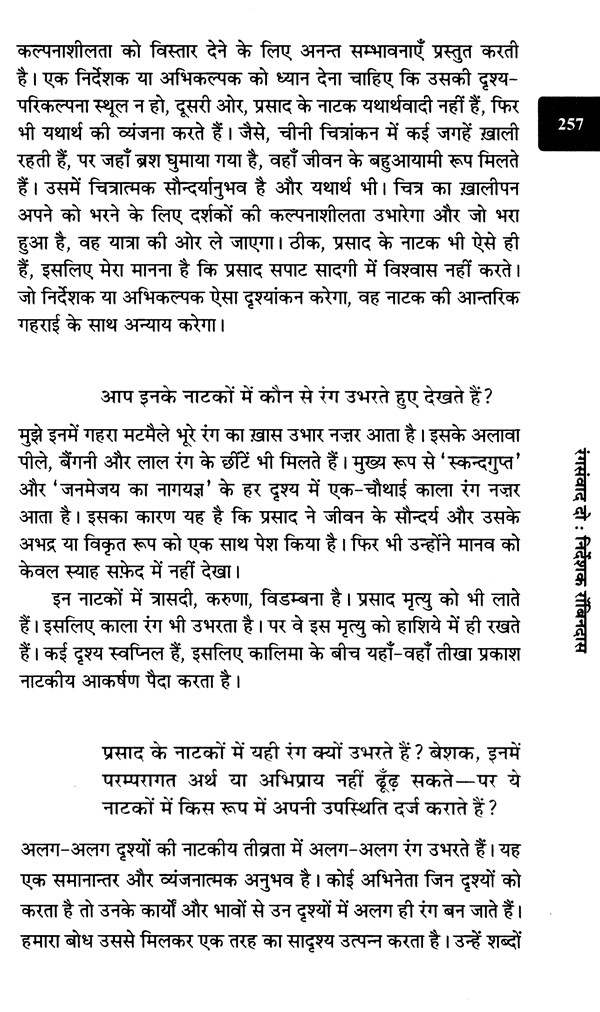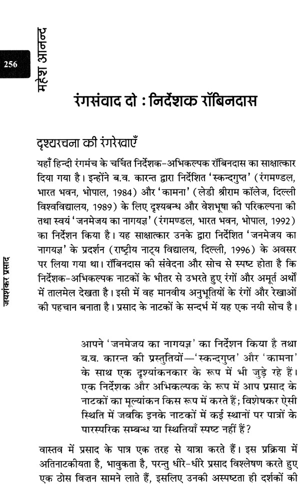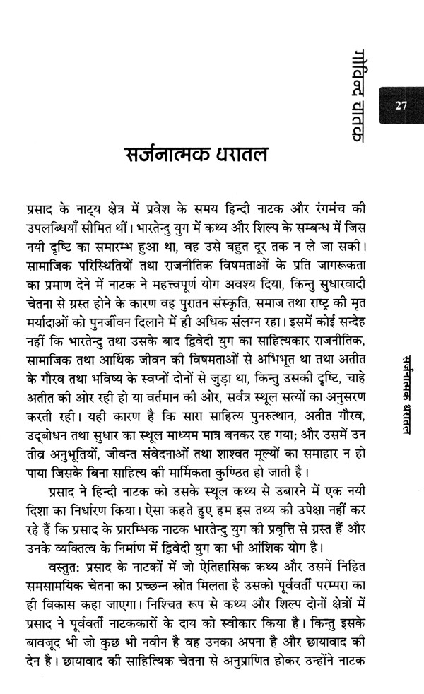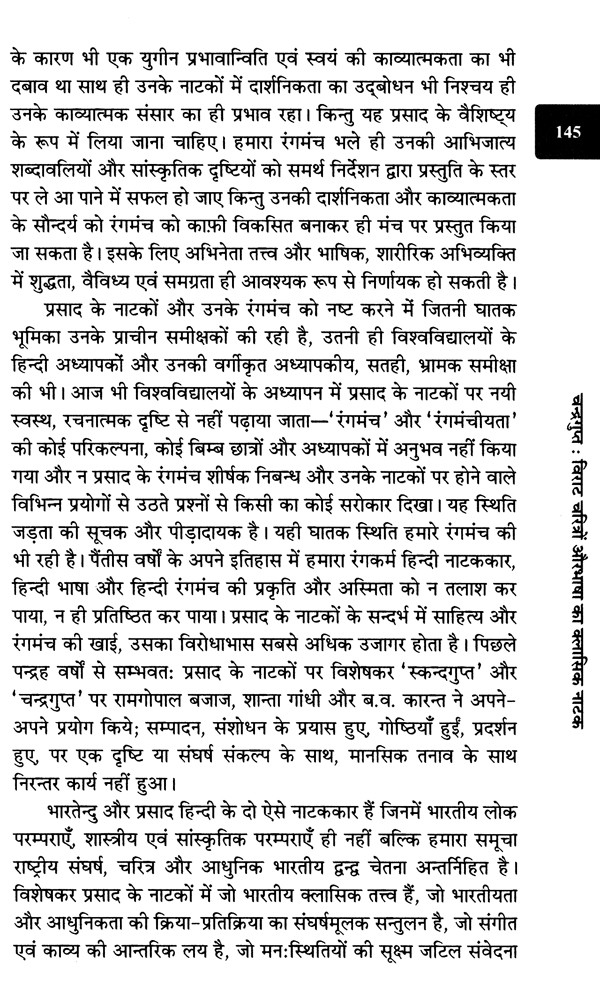 बीसवीं शताब्दी के प्रारम्भिक दशकों में जयशंकर प्रसाद के नाटकों से हिन्दी नाटकलेखन के एक नये अध्याय की शुरुआत होती है, और उनके निबन्धों से एक नयी रंगदृष्टि से परिचय मिलता है। नाटकलेखन में उन्होंने ऐतिहासिक शोध के भीतर से जीवन्त मानव की संघर्ष-यात्रा के अनेक पड़ावों का अंकन किया है। और अपने निबन्धों में उन्होंने हिन्दी रंगमंच की जातीय पहचान को पाने के लिए प्रेरित किया-ऐसा रंगमंच जो भारतीय सन्दर्भों में शास्त्रीय, पारम्परिक और पश्चिमी नाट्यों के व्यवहार और तत्त्वों के मेल से भारतीय नाट्यधर्मी शैली के एक नये मुहावरे को रेखांकित करे। इस प्रक्रिया में पारसी थिएटर और शेक्सपियर के अनेक रंगतत्त्व मिलते हैं, परन्तु संस्कृत नाटकों और पारम्परिक नाट्यों तथा इनके तत्त्वों में जो समानता है उससे ये तत्त्व आरोपित नहीं हैं, वरन् इस नयी रंगशैली को प्रदर्शनात्मक (थिएट्रिकल) आकर्षण के साथ गढ़ते हैं।
