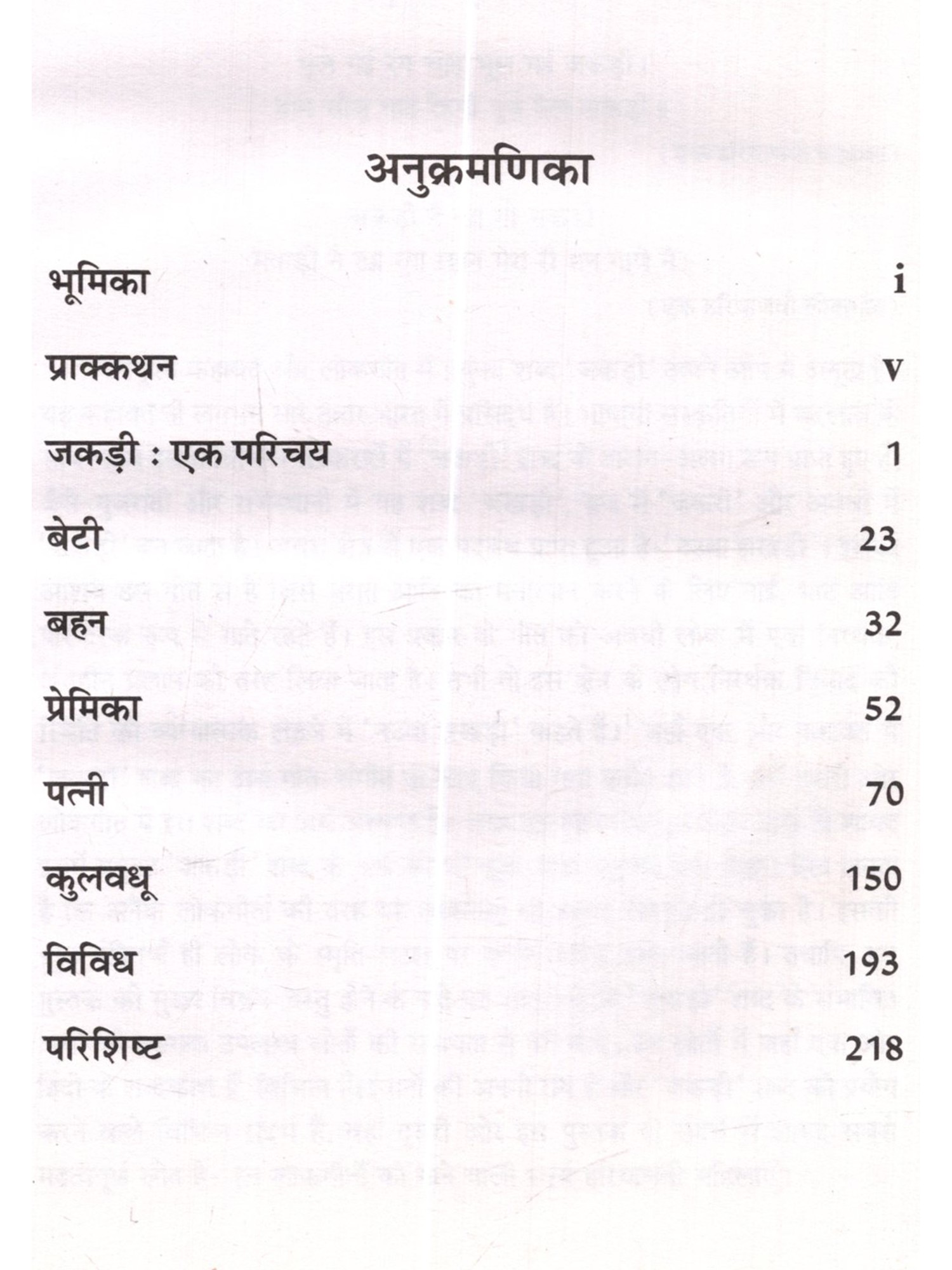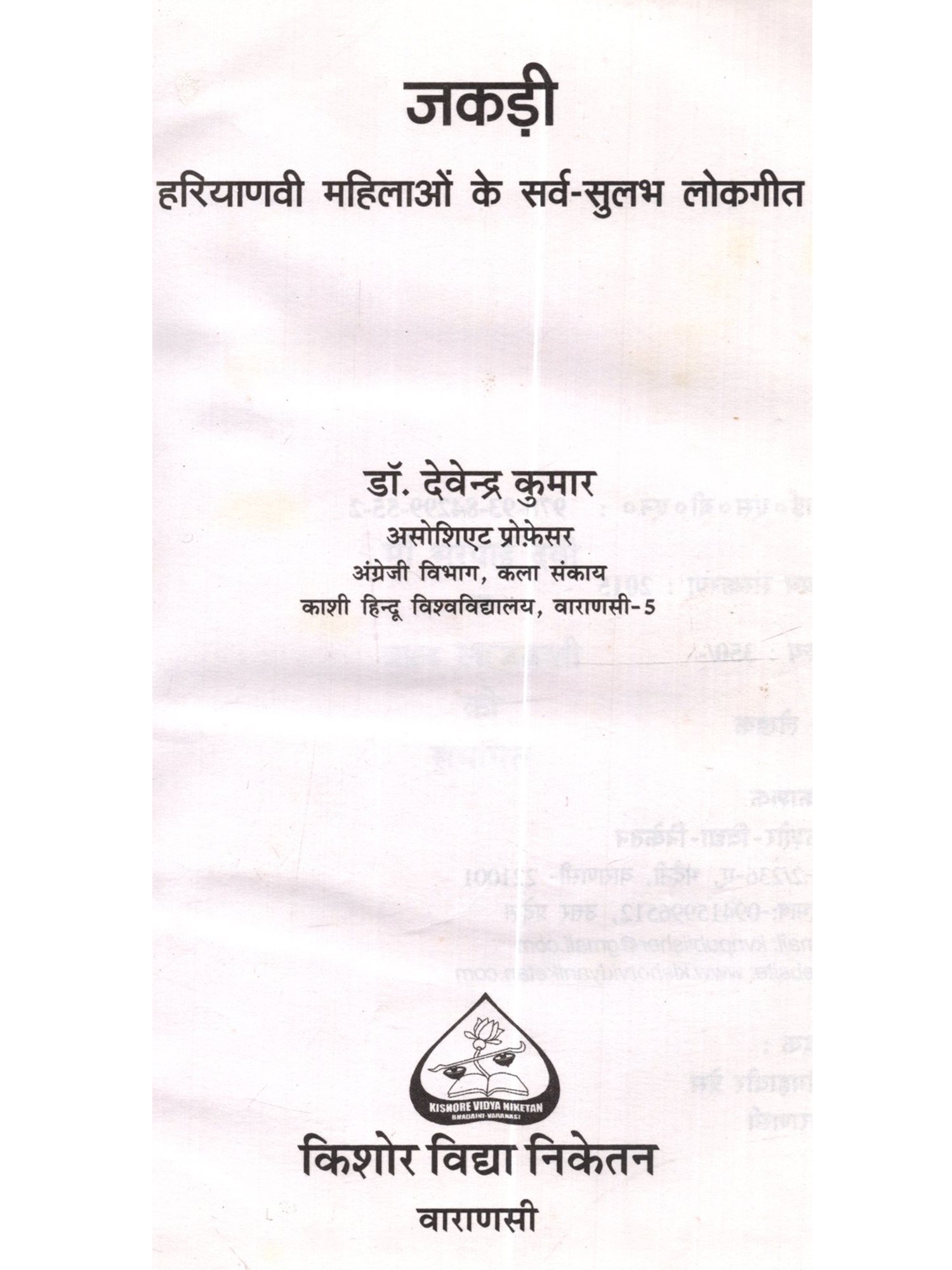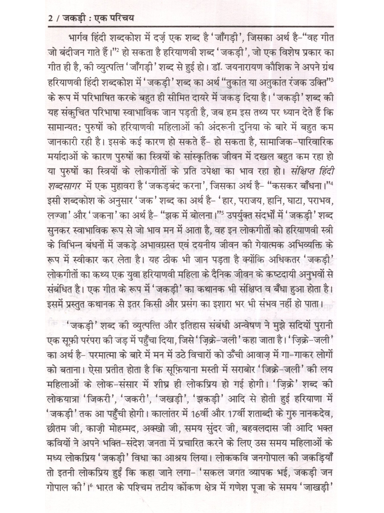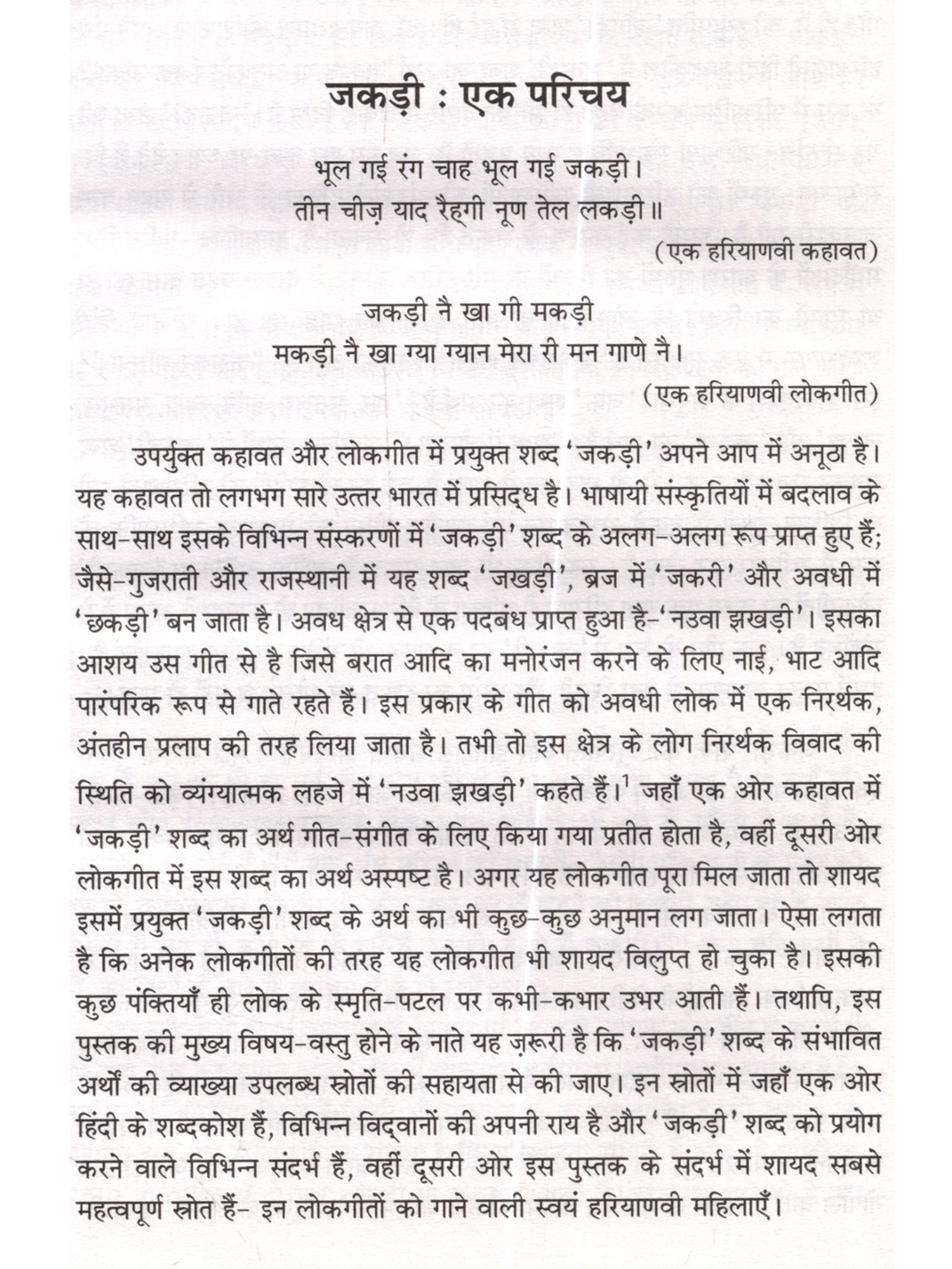आज लगभग सभी पारम्परिक समाओं में सदियों से प्रवाहमान लोक संस्कृति की धारा लुप्त होने के कगार पर है। ऐसे संक्रमण काल में इत्त लुप्त होती संस्कृति के विभिन्न घटकों को भावी पीढ़ियों के लिये सहेजने की आवश्यकता है। प्रस्तुत पुस्तक जकड़ी हरियाणवी महिलाओं के सर्व-सुलभ लोकगीत इस दिशा में एक छोटा-सा प्रयास है। हरियाणवी महिलाओं में लोकप्रिय जकड़ी' नामक लोकगीत लोकविदों की दृष्टि में प्रायः उपेक्षित ही रहे हैं। उनका अधिकतर ध्यान संस्कार-गीतों पर ही केन्द्रित रहा है। प्रस्तुत पुस्तक जकड़ी जैसी लोकविद्या का पहला स्वतन्त्र और विस्तृत अध्ययन है। 'जकड़ी' जैसे लोकगीतों की सांस्कृतिक और समाजशास्त्रीय उपादेयता इस तथ्य में निहित है कि ये लोकगीत एक हरियाणवी स्त्री के जीवन के सबसे महत्वपूर्ण पड़ाव की सटीक अभिव्यक्ति है। स्त्री के जीवन का यह पड़ाव है-उसके रजस्वला होने से लेकर उसके पुत्रवती होने तक का समय। यही वह समय है जिस दौरान उसके जीवन में आने वाले स्त्रीजन्य बदलाव एक झंझावात की तरह आते हैं। देखा जाए तो हरियाणवी महिलाओं द्वारा गायी जाने वाली जकड़ियों एक स्त्री के विवाहोपरान्त होने वाले विस्थापन और पुनः स्थापन के बीच के अत्यन्त महत्वपूर्ण कालखंड की मुखर अभिव्यक्ति हैं। इस दौरान उसे कितनी ही तरह की पारिवारिक, सामाजिक, सांस्कृतिक एवं भौगोलिक संरचनाओं की दुरुहता से दो-चार होना पड़ता है, यह केवल एक स्त्री-मन ही जान सकता है। जकड़ियाँ इन्हीं जटिल संरचनाओं के बीच एक स्त्री की मनोवैज्ञानिक यात्रा की सामूहिक एवं कलात्मक अभिव्यक्ति हैं। समग्र रूप से कहा जा सकता है कि जकड़ियों का संसार इन्हें गाने वाली हरियाणवी महिलाओं के 'आंतरिक संसार' की ही भाँति विविधताओं से भरा हुआ है। एक स्त्री के जीवन की सबसे महत्वपूर्ण अवस्था का चित्रण करने के साथ-साथ जकड़ियाँ सम-सामयिक राजनीतिक, सामाजिक, सांस्कृतिक घटनाओं को भी अपने में समाहित करती रही हैं। यदि किसी को इन घटनाओं के संबंध में लोक की यथार्थवादी टिप्पणी देखनी हो, तो जकड़ी से बेहतर स्रोत शायद ही कोई मिले।