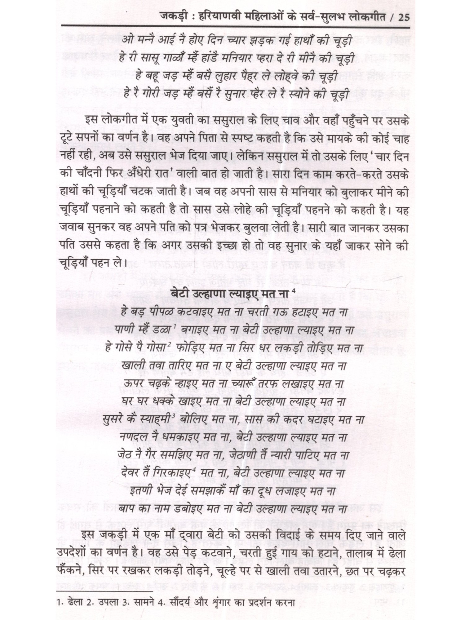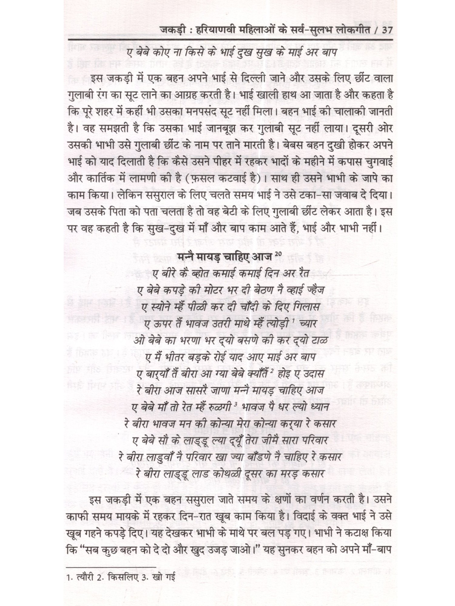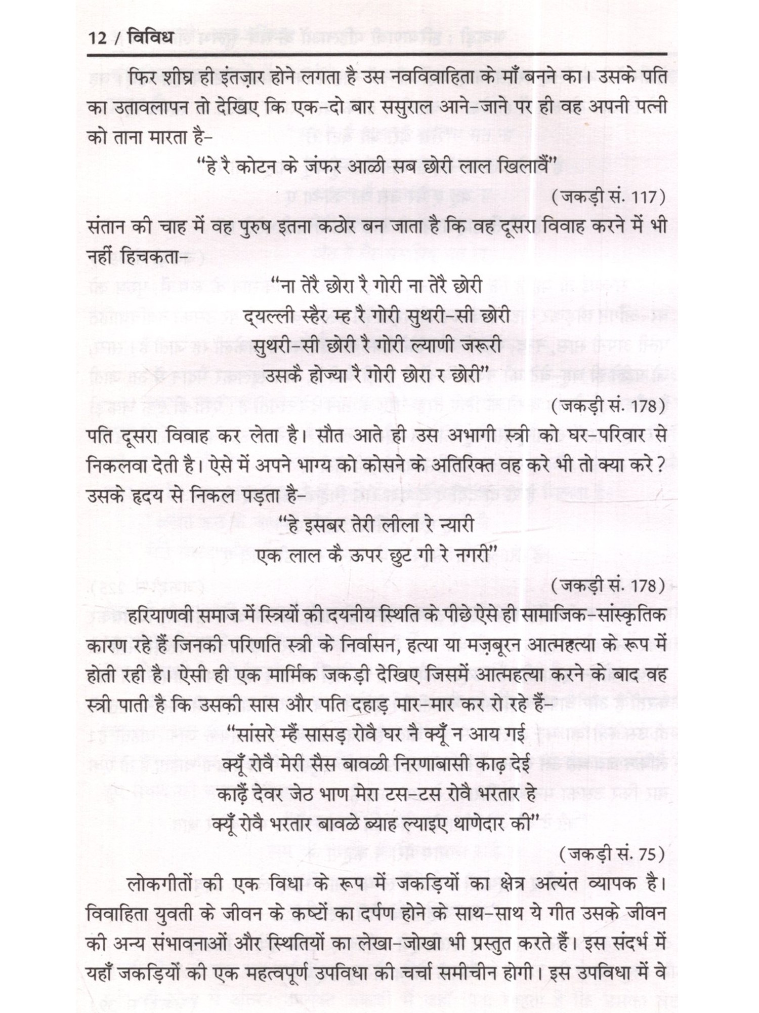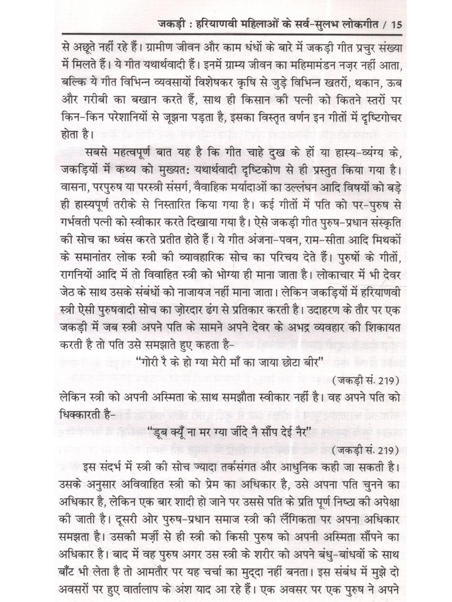 आज लगभग सभी पारम्परिक समाओं में सदियों से प्रवाहमान लोक संस्कृति की धारा लुप्त होने के कगार पर है। ऐसे संक्रमण काल में इत्त लुप्त होती संस्कृति के विभिन्न घटकों को भावी पीढ़ियों के लिये सहेजने की आवश्यकता है। प्रस्तुत पुस्तक जकड़ी हरियाणवी महिलाओं के सर्व-सुलभ लोकगीत इस दिशा में एक छोटा-सा प्रयास है। हरियाणवी महिलाओं में लोकप्रिय जकड़ी' नामक लोकगीत लोकविदों की दृष्टि में प्रायः उपेक्षित ही रहे हैं। उनका अधिकतर ध्यान संस्कार-गीतों पर ही केन्द्रित रहा है। प्रस्तुत पुस्तक जकड़ी जैसी लोकविद्या का पहला स्वतन्त्र और विस्तृत अध्ययन है। 'जकड़ी' जैसे लोकगीतों की सांस्कृतिक और समाजशास्त्रीय उपादेयता इस तथ्य में निहित है कि ये लोकगीत एक हरियाणवी स्त्री के जीवन के सबसे महत्वपूर्ण पड़ाव की सटीक अभिव्यक्ति है। स्त्री के जीवन का यह पड़ाव है-उसके रजस्वला होने से लेकर उसके पुत्रवती होने तक का समय। यही वह समय है जिस दौरान उसके जीवन में आने वाले स्त्रीजन्य बदलाव एक झंझावात की तरह आते हैं। देखा जाए तो हरियाणवी महिलाओं द्वारा गायी जाने वाली जकड़ियों एक स्त्री के विवाहोपरान्त होने वाले विस्थापन और पुनः स्थापन के बीच के अत्यन्त महत्वपूर्ण कालखंड की मुखर अभिव्यक्ति हैं। इस दौरान उसे कितनी ही तरह की पारिवारिक, सामाजिक, सांस्कृतिक एवं भौगोलिक संरचनाओं की दुरुहता से दो-चार होना पड़ता है, यह केवल एक स्त्री-मन ही जान सकता है। जकड़ियाँ इन्हीं जटिल संरचनाओं के बीच एक स्त्री की मनोवैज्ञानिक यात्रा की सामूहिक एवं कलात्मक अभिव्यक्ति हैं। समग्र रूप से कहा जा सकता है कि जकड़ियों का संसार इन्हें गाने वाली हरियाणवी महिलाओं के 'आंतरिक संसार' की ही भाँति विविधताओं से भरा हुआ है। एक स्त्री के जीवन की सबसे महत्वपूर्ण अवस्था का चित्रण करने के साथ-साथ जकड़ियाँ सम-सामयिक राजनीतिक, सामाजिक, सांस्कृतिक घटनाओं को भी अपने में समाहित करती रही हैं। यदि किसी को इन घटनाओं के संबंध में लोक की यथार्थवादी टिप्पणी देखनी हो, तो जकड़ी से बेहतर स्रोत शायद ही कोई मिले।