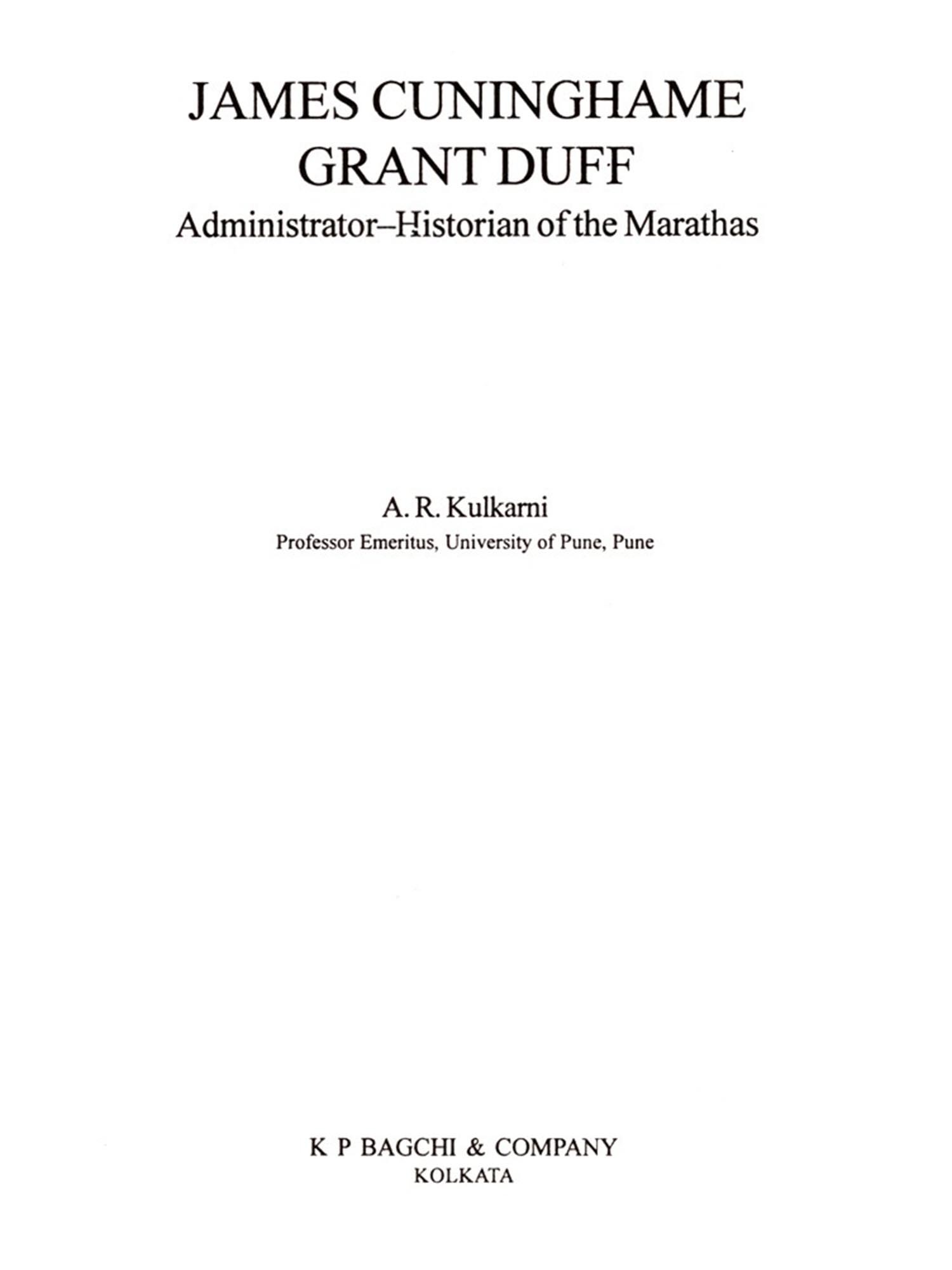 In the wake of the gradual dissolution of the Mughal power, the smaller chiefs and provincial satraps have begun to set up their independent principalities in different parts of India. By the middle of the second half of the 18th century, the Marathas on the one hand and the English East India Company on the other, have set up their establishments. By the end of the 18 century, the struggle between the English and the Marathas resulted in the defeat of the Marathas, although their power was not yet broken, by the Treaty of Bassein of 1802. The final eclipse of the Maratha power could be seen in the defeat of the Marathas in the fateful battle of 1817, confirmed by the Treaty of 1818, by which the English took over the control of the Maratha kingdom. It is in this background that Prof. Kulkarni has traced the biography of an enterprising English officer, James Grant, known popularly in India as Grant Duff. In the early 18th century, as in the 17th, the European Company merchants and officials had to know everything-from fighting, to trading and administering the conquered provinces. By carly 19th century, the trading part of the English Company officials have been separated from the fighters and administrators, which had created a new genre of officialdom among the English. Prof. Kulkarni here traces the life story of such an official, who was a fighter and an administrator at the same time. But he was much more. He was also an historian, who wrote a three volume History of the Marathas, one of the earliest of the Englishmen to do so who had seen the Marathas from very close quarter. As shown by Prof. Kulkarni, this was different from the usual Memoirs of the Englishmen who later wrote perhaps from their diaries kept during.