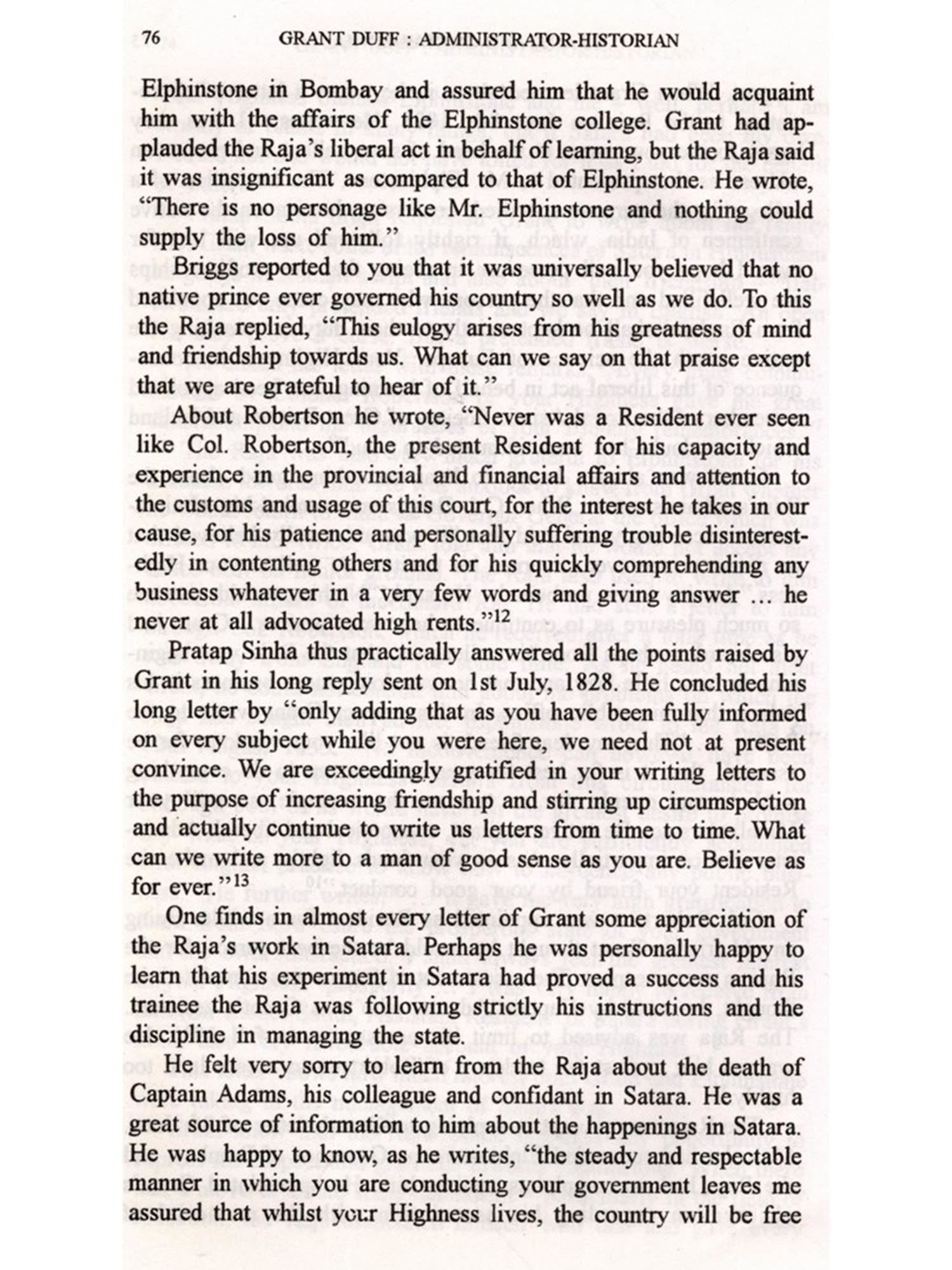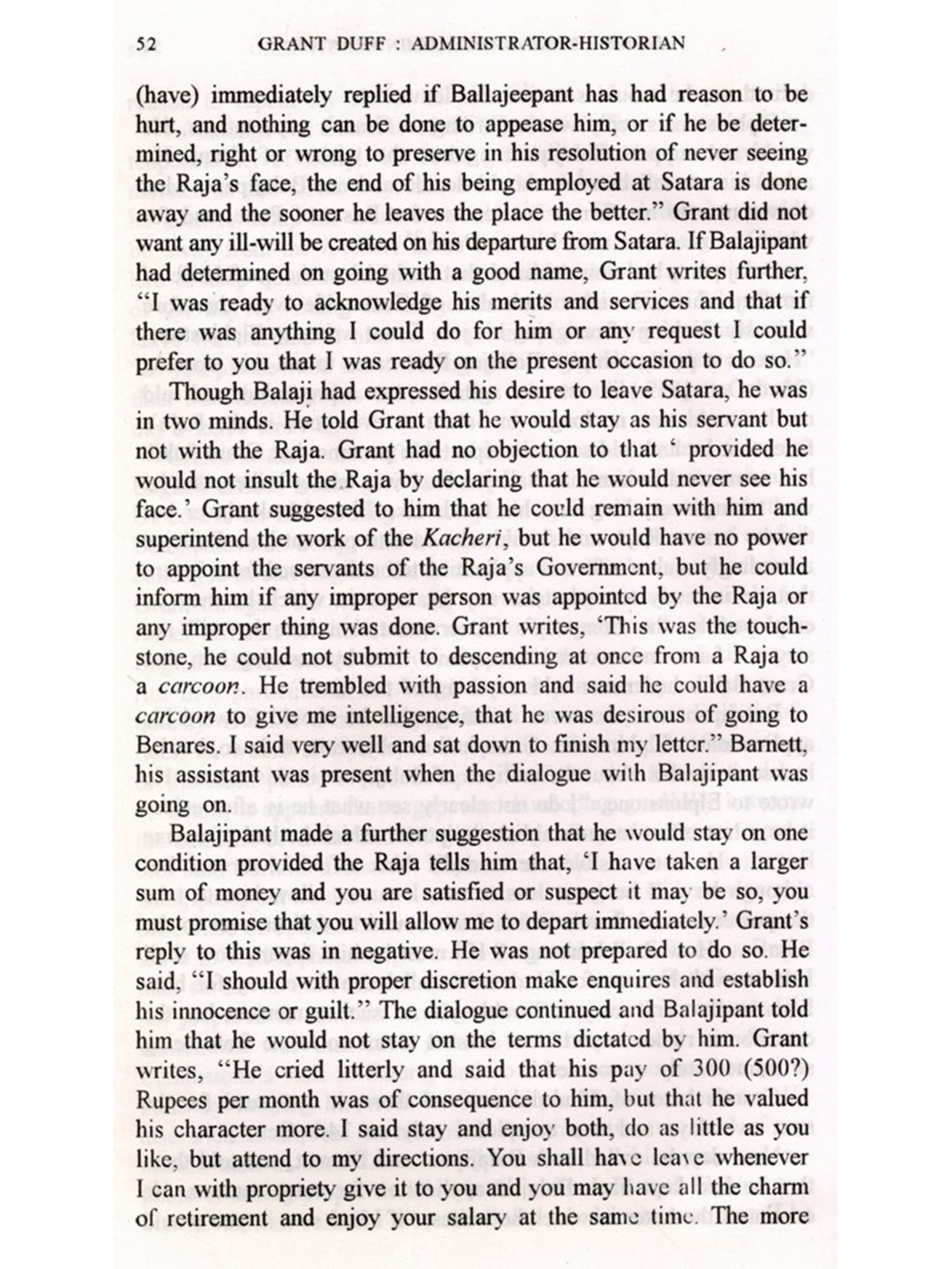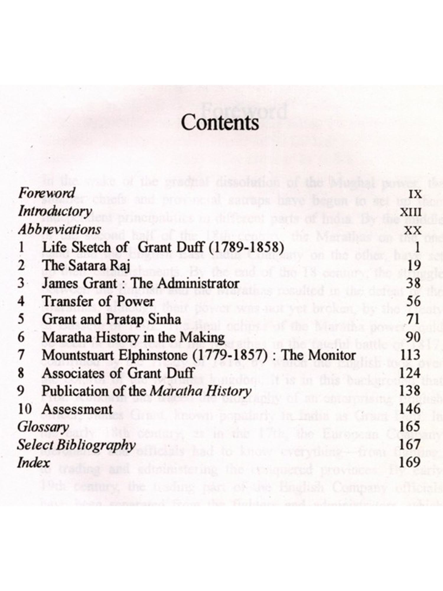 While preparing a paper on Balajipant Natu, a person known for hoistig the Union Jack on the Shaniwar Wada, the palace of the Peshwas, in 1818, I came across a number of references to Capt. Grant Duff, in the Parasnis collection preserved in the Deccan College. This led me to Professor Kenneth Ballhatchet's servival work on Western India of Mountstuart Elphinsotne's time, Social Policy and Social change in Western India (1817-1830), based primarily on the correspondence official and private preserved in the India Office Library and Records, London. This book made me anxious to know more about Grant Duff. The historians of Maharashtra have discussed at length the merits and demerits of Grant Duff's A History of the Mahrattas, and they have not only rejected his 'Hisotry' but even considered him as the enemy of the Marathas. However, not much has been known of him as an administrator, managing the affairs of the Satara Raj in the most disturbed period in Maharashtra which was also the formative period of the Company Sarkar i.e. the Rule of the East India Company (1818-1857) Ballhatchet's book supplied me good deal of information about the administration of Grant Duff, and also further aroused my curiosity about him.