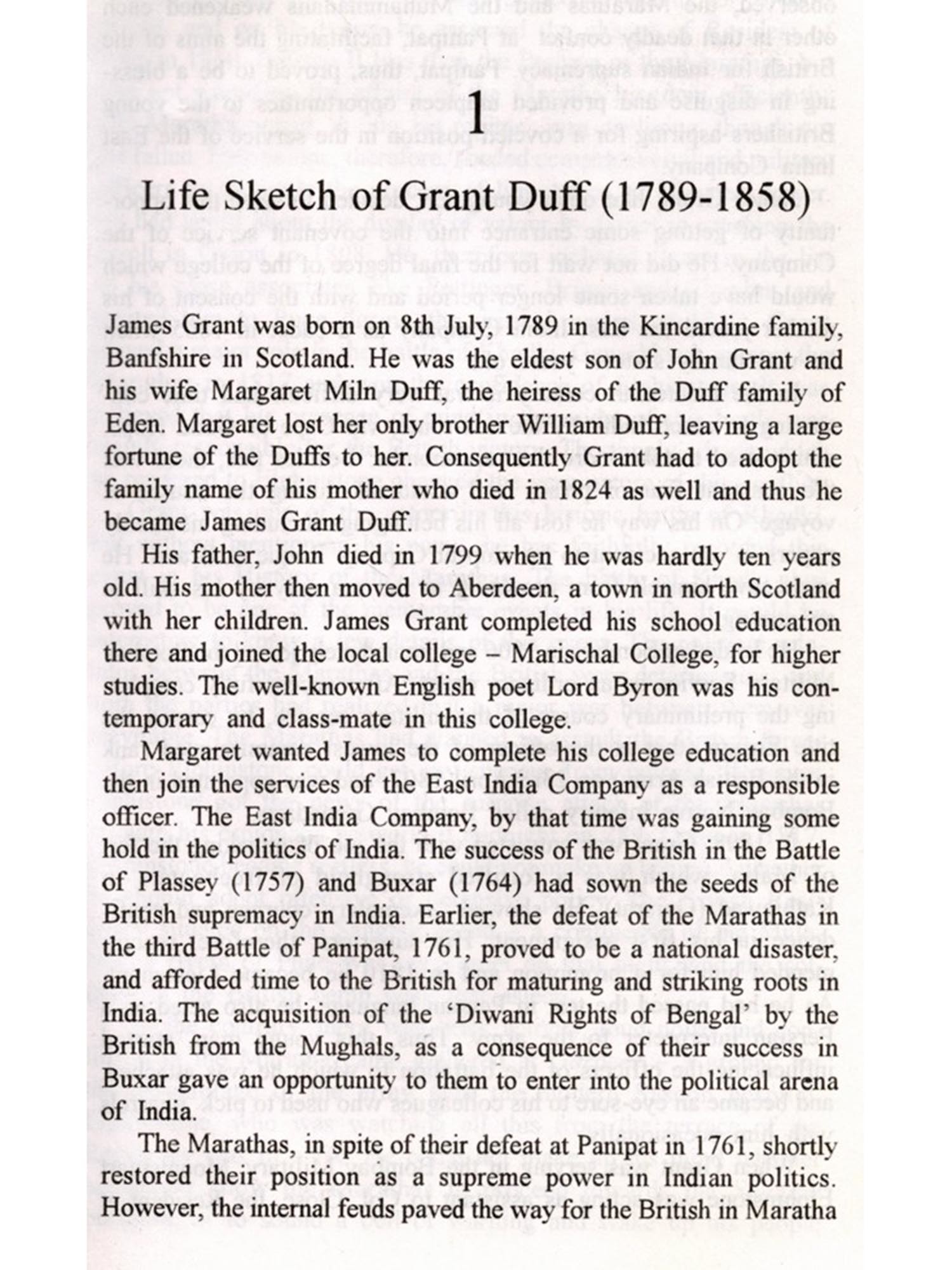 their sojourn in India. Duff was born in a Scottish family on the 8th of July 1789, a few days after the commencement of the French Revolution, which had no effect on Duff. He could barely complete his education and then joined the East India Company as simple cadet, landing at Bombay in 1806 and joining the Bombay military service immediately. After showing his valour in capturing several forts in the Maratha Kingdom, Duff participated in the fateful battle of 1817 and imparted useful intelligence to Mountstuart Elphinstone and Captain Burr that led to the English victory, although it is now clear that the defeat of the Marathas could be ascribed to their internal faction fighting and the inefficiency of the disorganized Maratha leadership. It has been stated by some historians that Duff was instrumental in provoking the Peshwa to the battle, but Prof. Kulkarni does not allude to that. After the liquidation of the Maratha power, Elphinstone picked up Duff to act as an administrator in the Kingdom of Satara for a period of nearly four years after which the kingdom would be handed over to the Raja Pratap Singh, one of the descendants of Raja Sahu. This arrangement, to last till 1821, was slightly different from the arrangement made at Mysore by Lord Wellesley after the defeat and destruction of Tipu Sultan.