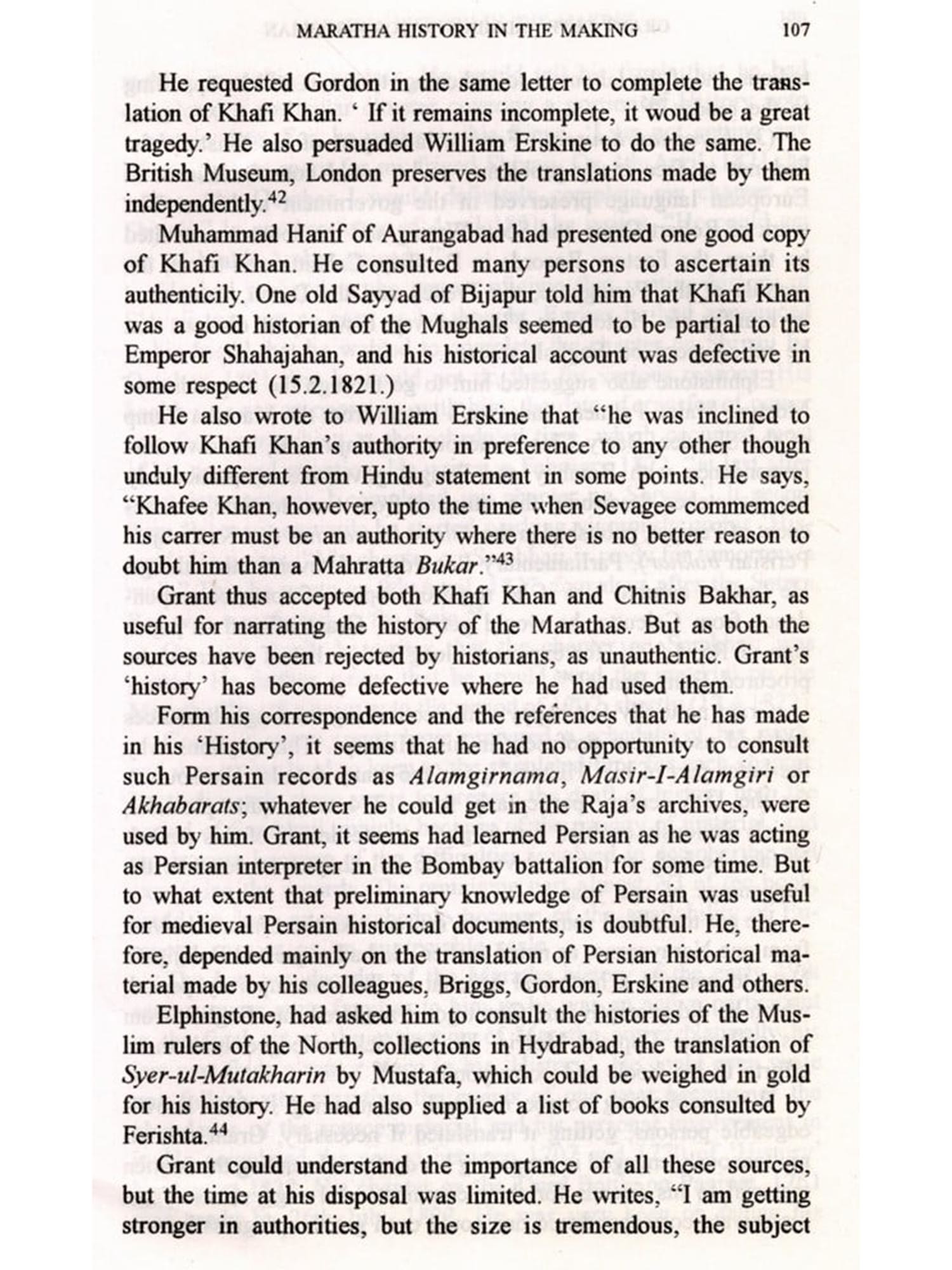 At this juncture, by sheer co-incidence, I met Professor Ballhatchet in Delhi in 1966 who was invited to participate in a Seminar sponsored by the University Grants Commission on 'Mod-ern Techniques of Social and Economic Hsitory. In the course of discussion, he suggested that a careful analysis of the huge amount of correspondence of Elphinstone and his contemporaries, pre-served in the India Office Library, London, would give ample material on hitherto unknown aspects of Grant Duff's career as an administrator and historian. As there was not the remotest possibility of my visiting London to undertake this study, I just could not take the suggestion seriously.