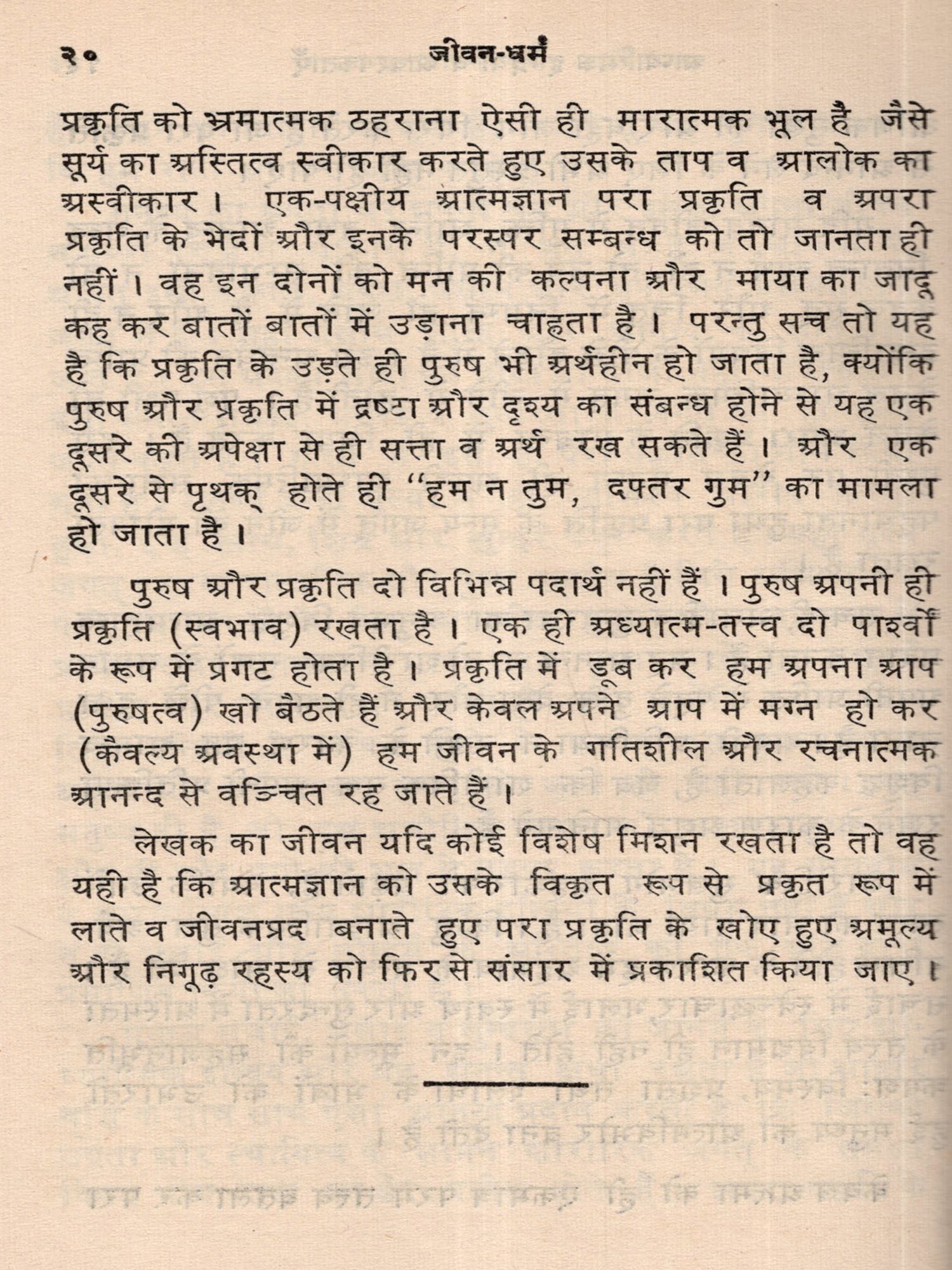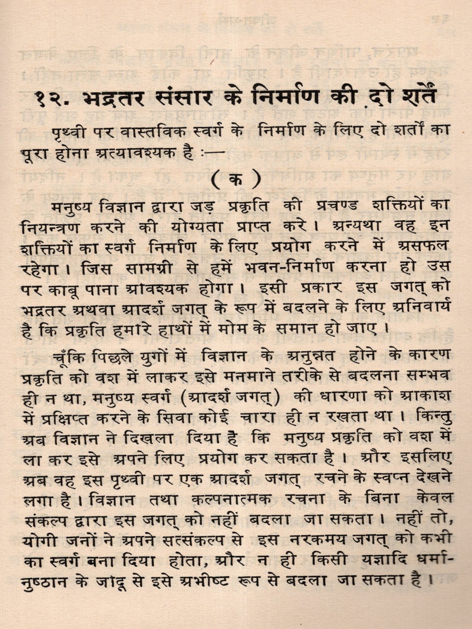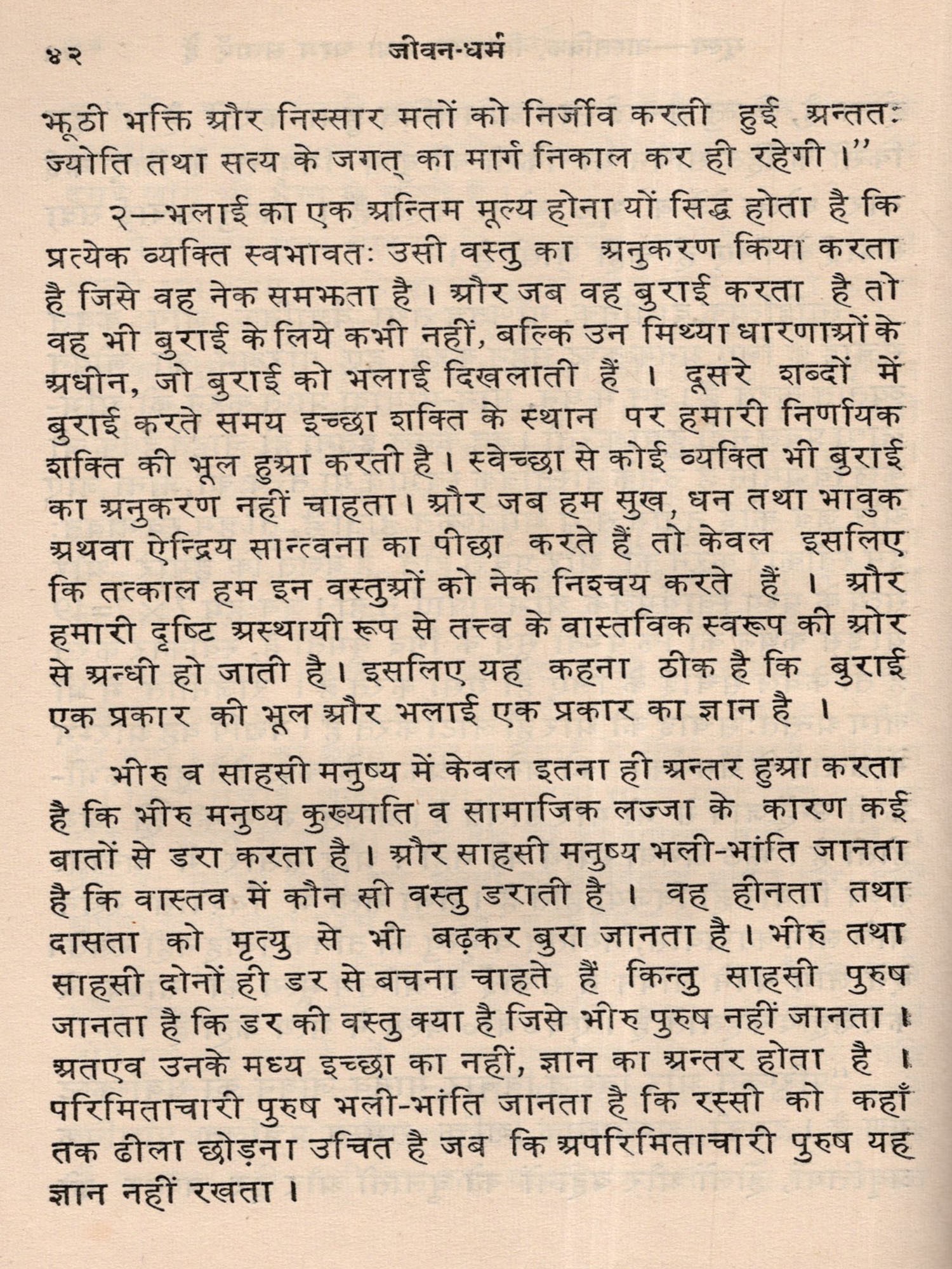 सूर्योदय होते ही समस्त कृत्रिम दीपक अनावश्यक हो जाते हैं। इसी प्रकार जीवन-ज्ञान का उजियारा परम्परागत अनेक मतों को अर्थहीन बना देता है। अब समय आ गया है कि हम स्वरूप में जागृत होकर स्वधर्म पालन करना सीखें और क्रम-विकास द्वारा प्राप्त अपनी पैतृक पाशविकता से नियन्त्रित होने के स्थान पर इसे अपने मानवीय उद्देश्यों की सेवा में लगा दें।