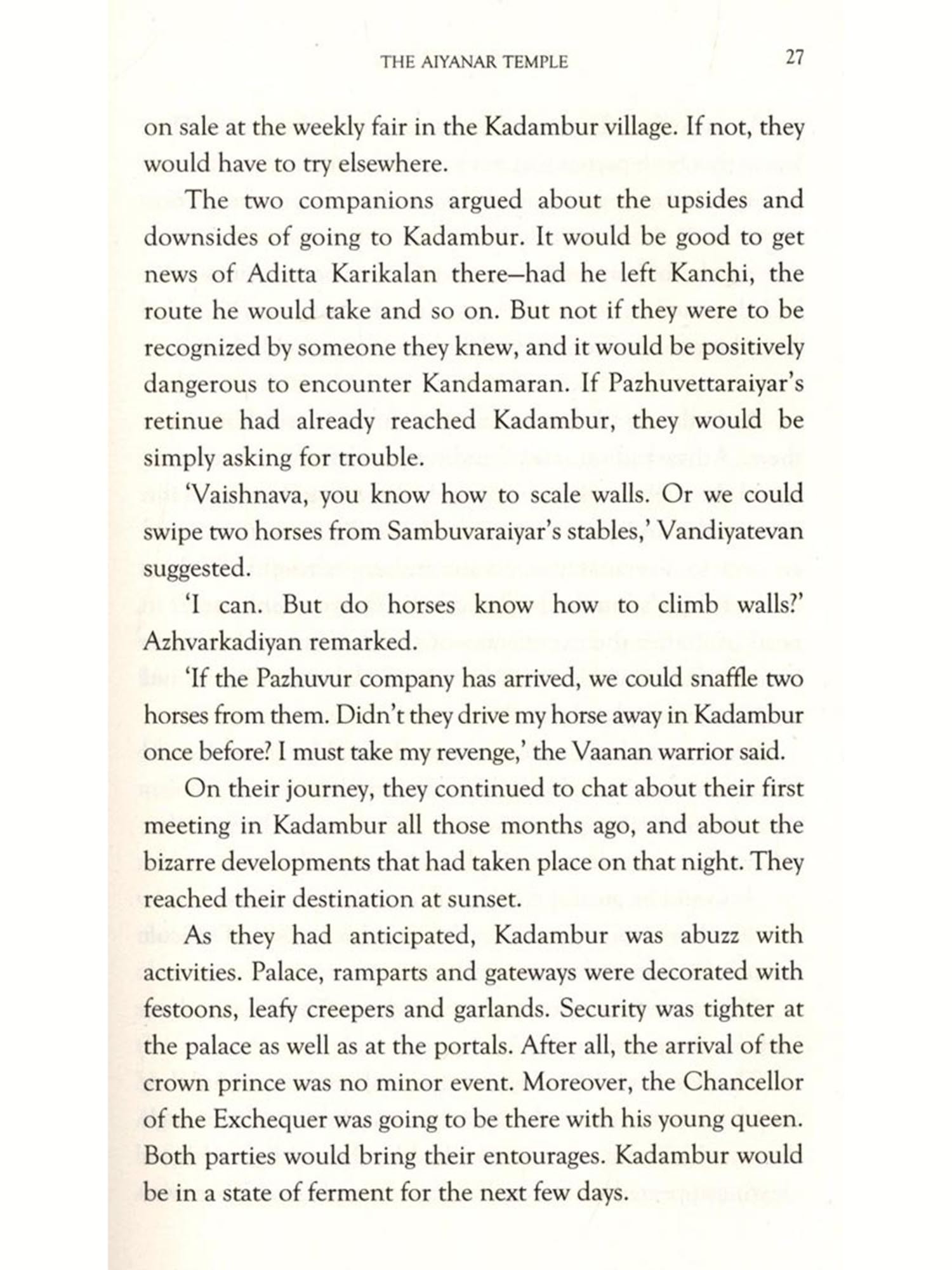 What will happen in Kadambur? The beguiling and breathtaking Nandini Devi requests a rendezvous with Crown Prince Aditta Karikalan. He is determined to meet her, despite opposition from friends and family. Does Nandini mean to persuade Karikalan to give up the crown or to kill him? Meanwhile, in Tanjavur, the life of the ailing emperor Sundara Chozha is under threat. Will his assassins succeed? The mute Mandakini Devi has been forcibly taken to Tanjavur, and Poonkuzhali rushes there to help her aunt. What will happen when the betrayed Mandakini meets the royal family?