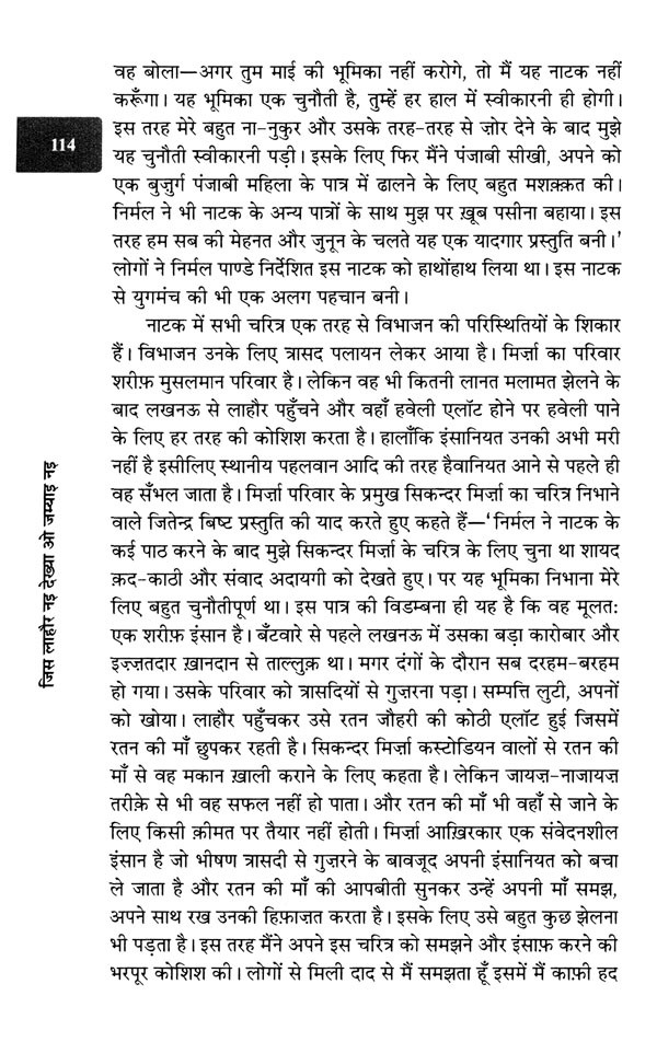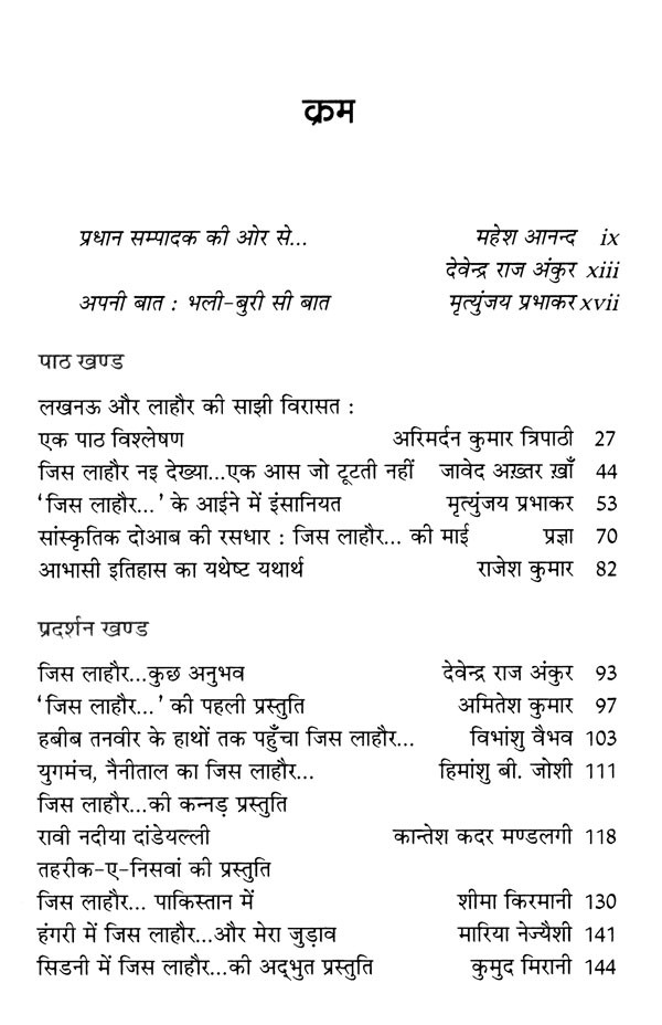 असगर वजाहत कहानी, उपन्यास, आत्मकथा, यात्रा-संस्मरण, नाटक आदि अनेक विधाओं में एकसाथ सक्रिय हैं। उनके नाटकों ने शुरू से हिन्दी पाठकों व दर्शकों का ध्यान खींचा है। उनके नाटकों में जो एक बात सामान्य है, वह है उनमें निहित व्यंग्य, विडम्बना और विद्रूरूपता। नाटकों का कथानक भी इन्हीं के इर्द-गिर्द रचा गया है। नाटक 'जिस लाहौर नइ देख्या...' का ताना-बाना भी कुछ इसी तरह बुना गया है। पूरा नाटक यथार्थवादी है, लेकिन प्रारम्भिक दृश्य में ही व्यंग्य-विडम्बना-विद्रूरूपता से साक्षात्कार होता है। मण्टो के यहाँ भी भारत-पाक विभाजन के ऐसे ही तिलमिलाते नज़ारे मिलते हैं! विभाजन अब भी कई लोगों के लिए एक गुत्थी ही है। इतिहास में इसकी गहरी और विस्तृत छान-बीन है। साम्राज्यवादी मंसूबों से इंसानियत की तबाही तो एक जाना-माना तथ्य है, लेकिन मनुष्य का एक-दूसरे के ही ख़िलाफ़ नफ़रत, पागलपन कई बार एक अनसुलझी गुत्थी ही लगती है। इंसानियत ही जैसे खुद अपने सामने यह सवाल रखती है कि क्या एक धरती के कई टुकड़े किये जा सकते हैं? क्या कई टुकड़ों में बँटी धरती के बाशिन्दों की फ़ितरत भी बँट जाती है ?