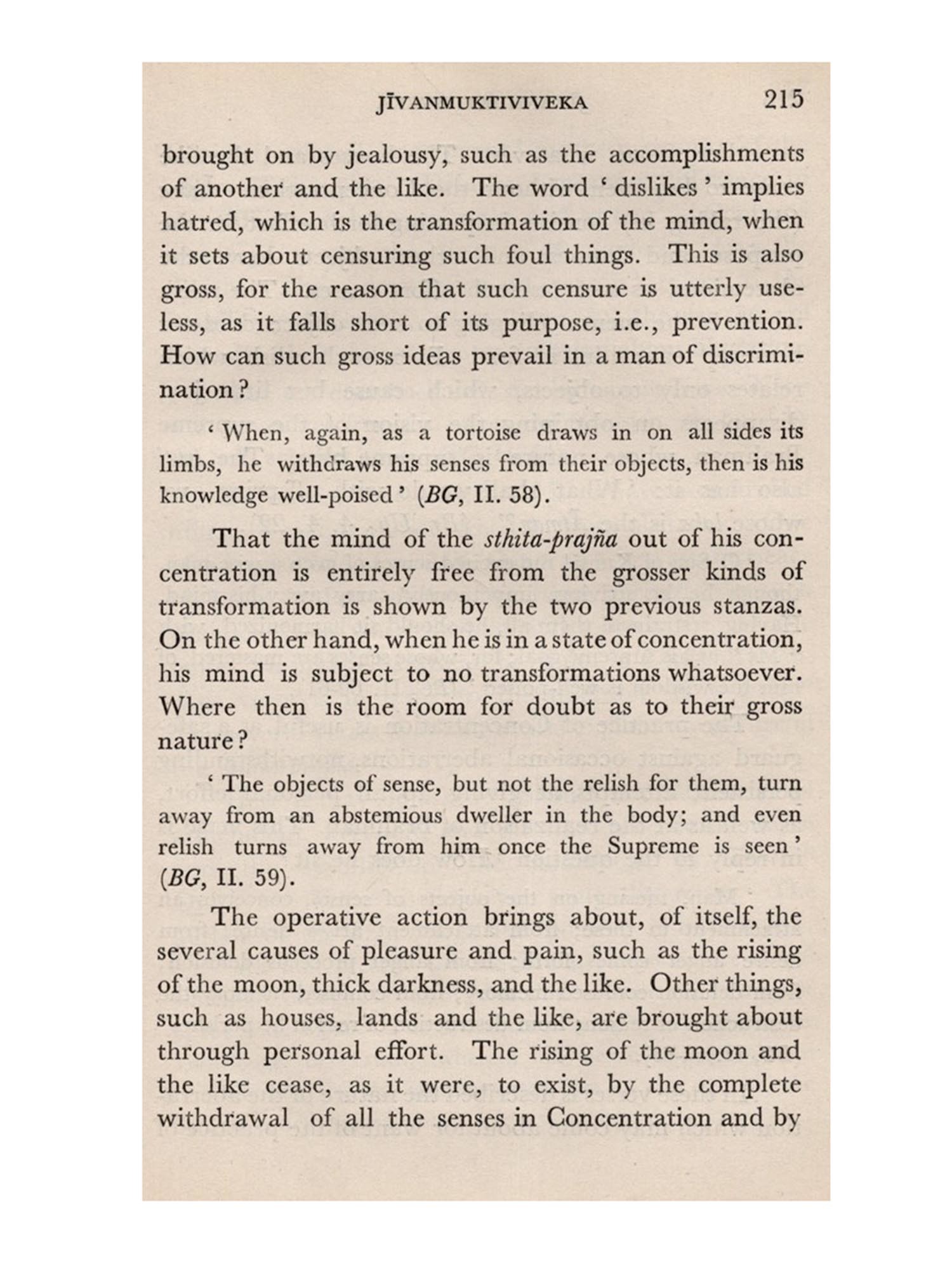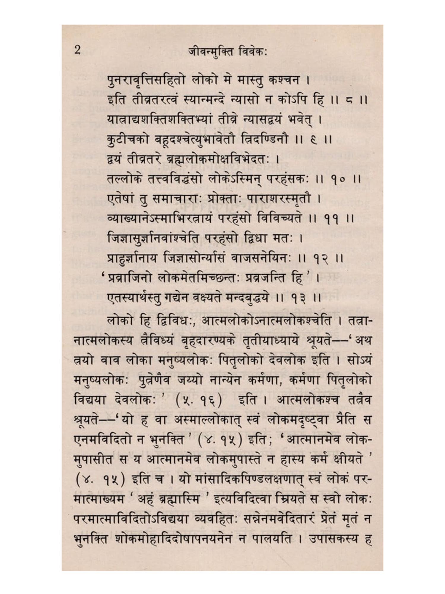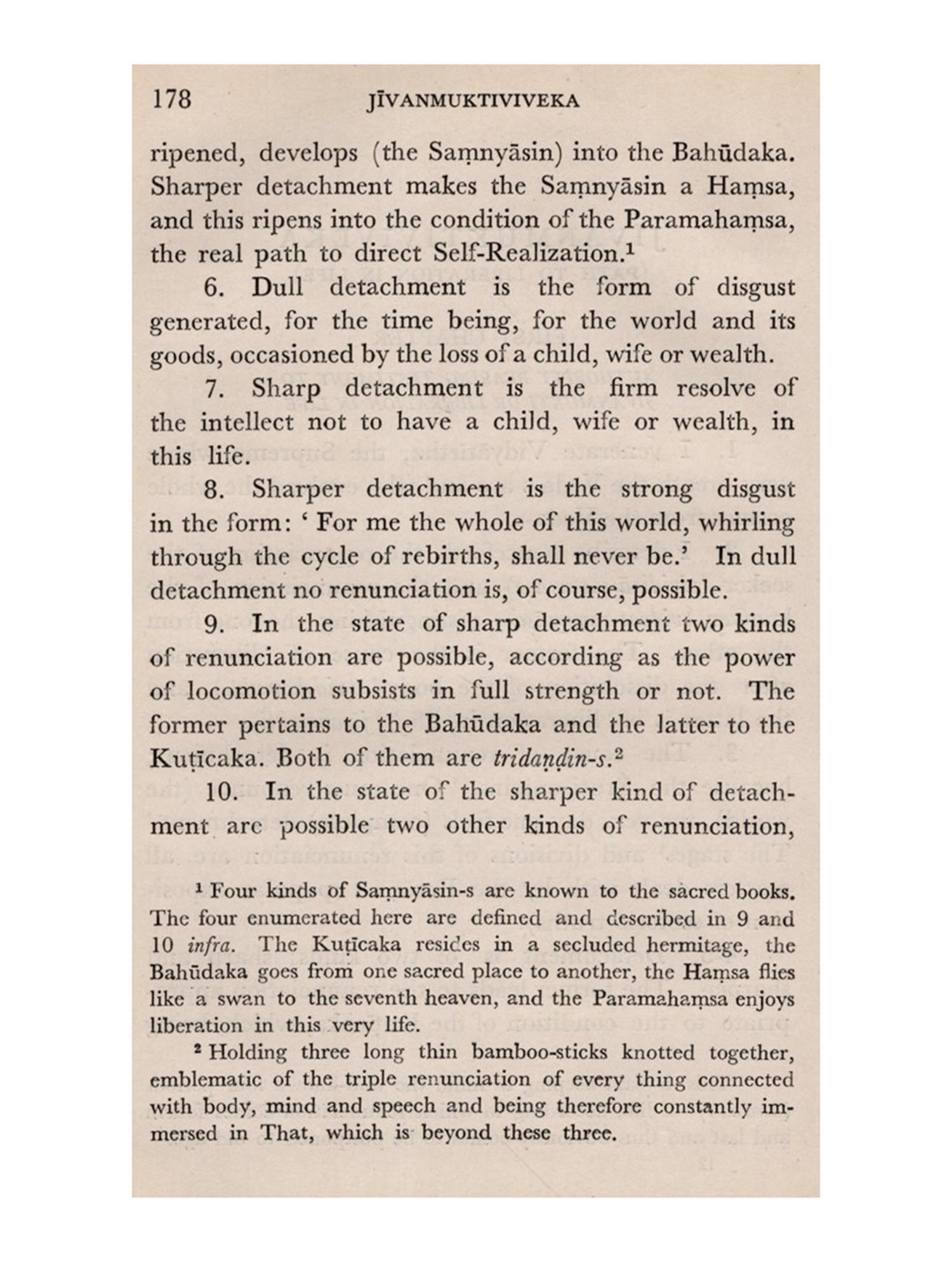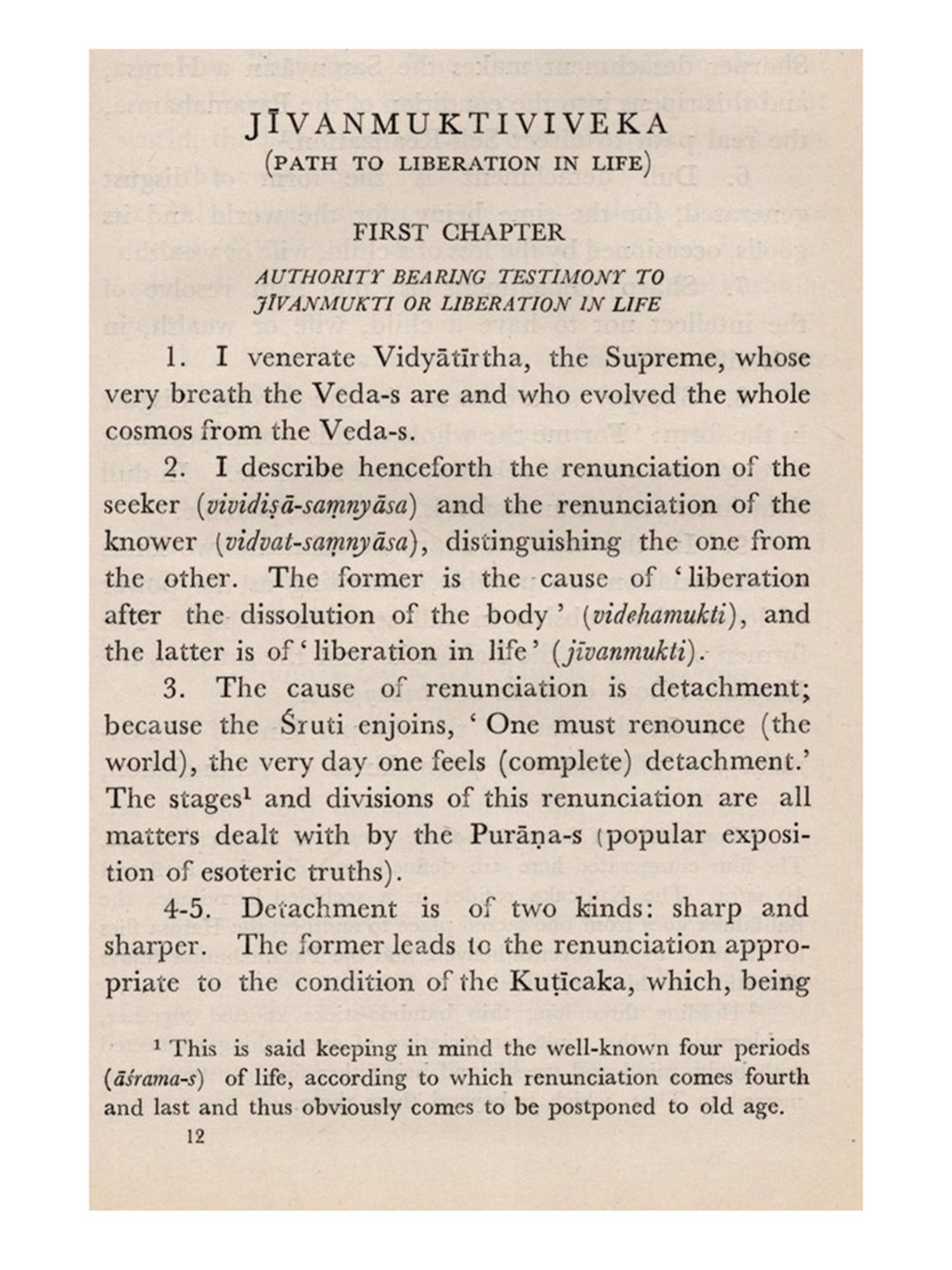 Though in the body of the work will be found some of the richest gems of purest ray serene gathered from several authentic works on which the ancient Hindu philosophy and culture is based, they would be simply lifeless without the living nexus supplied by the sage, Vidyaranya. The author, himself a samnyasin, begins and ends his book with the technical inquiry-whether renunciation (samnyasa) is the sine qua non of liberation or not-and answers it. The path to liberation, according to Vidyaranya, is indicated in one word-renunciation. Though this word has received a number of different shades of meaning from several writers, old and new, Vidyaranya would not understand it in any but the formal orthodox sense in which the Rși-s of yore (Hindu seers) principally employed it. Have no concern, bodily or mental, direct or indirect, with the world, live in entire isolation, so to speak, and wear the orthodox insignia of the order this is samnyasa, according to Vidyāranya. He divides renunciation into two kinds. The one he calls the renunciation of the seeker, the other, the renunciation of the knower. The first is, in fact, a preliminary stage to the second. One may apply oneself to the study, reflection, and assimilation of the Vedanta, with or without the first kind of renunciation. But with the dawning of the Light, renunciation of the second kind must surely follow. The first, if at all it comes about, must be sought after in the orthodox fashion; the second is bound by no injunction or prohibition'.