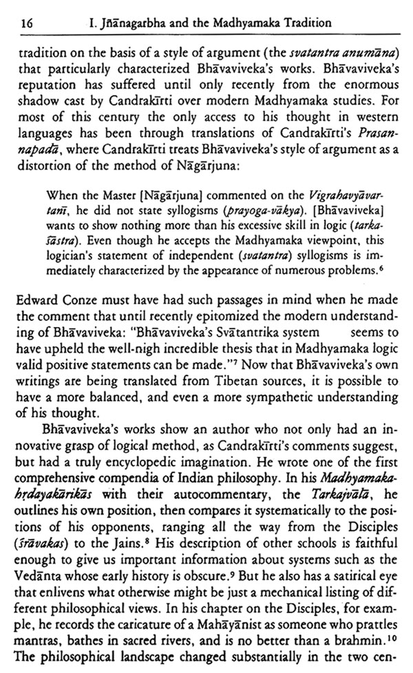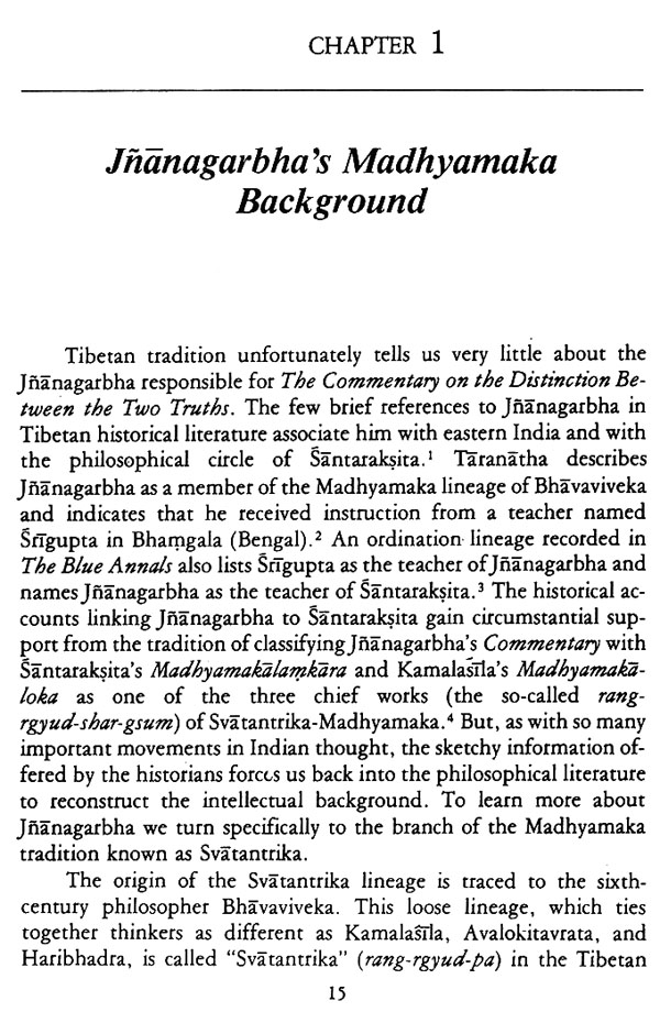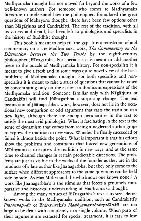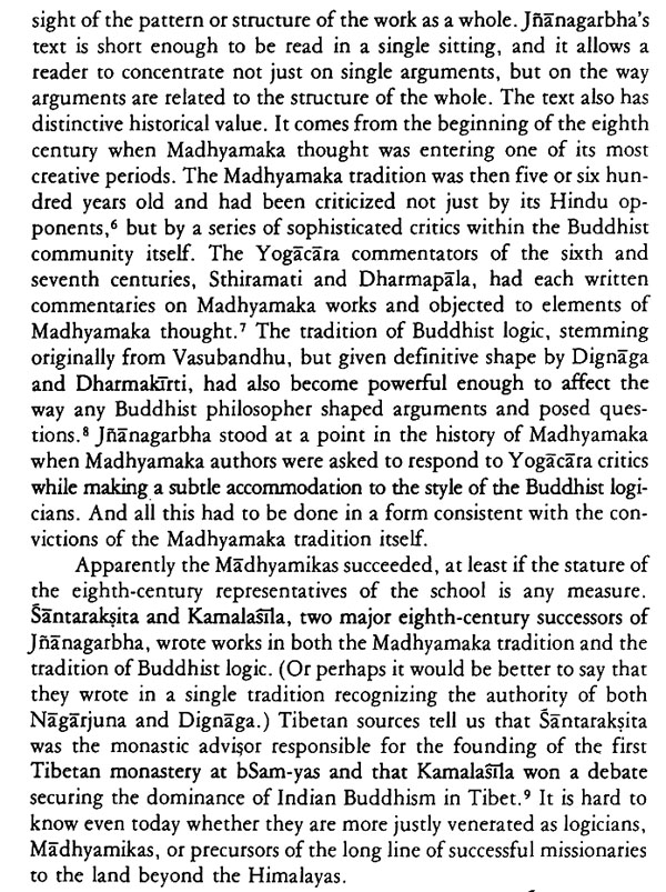 This study of the philosopher Jnanagarbha grows out of my earlier work on the formation of the Svatantrika Madhyamaka tradition in the works of Bhavaviveka. Jnanagarbha is Bhavaviveka's heir and helps carry Bhavaviveka's philosophical innovations into the period when Madhyamaka thought first took root in Tibet. For some-one whose focus is Tibetan Buddhism, this book could be understood as a study of one formative element in the tradition that eventually came to dominate the intellectual life of Tibet. But it would be wrong to think of jnanagarbha and his Madhyamika contemporaries only as a means to understand the origin of the Tibetan tradition. As I have studied the works of Jnanagarbha and come to appreciate his subtle combination of different points of view, drawn from sources as different as Nagarjuna, Bhavaviveka, Candrakirti, the Yogacara, and the Buddhist logicians, I have come to think of Janagarbha's thought as an example of something very dynamic in the Madhyamaka tradition. Jnanagarbha's work on the two truths records his struggle to adapt Madhyamaka thought to the philosophical innovations of his contemporaries without losing what is distinctive in his own past. What began as a study of one small part of a larger tradition has become a study of the flexibility and liveliness of the tradition itself. Of all the forces that modified and shaped Madhyamaka thought in the period between the time of Bhavaviveka and the time of Atisa, the most important may very well have been the Buddhist logical tradition of Dignaga and Dharmakirti.