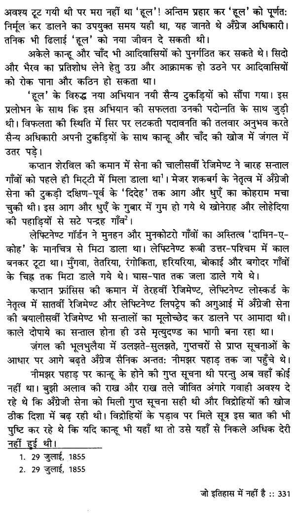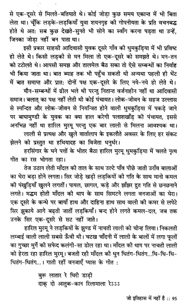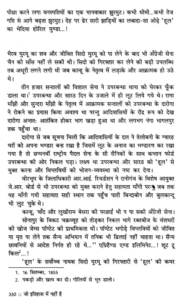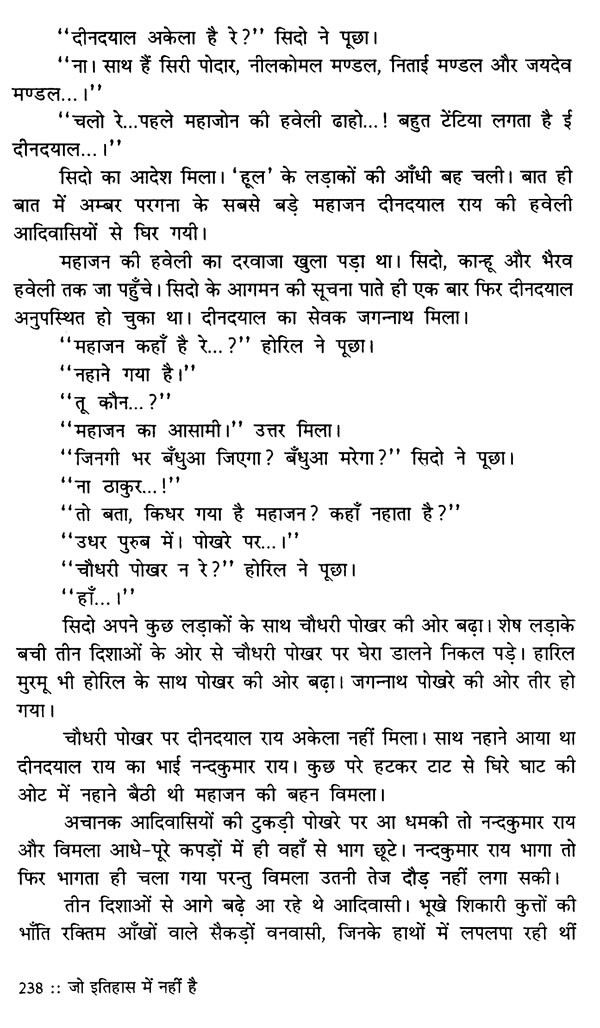 ईस्ट इण्डिया कम्पनी के शोषण और दमन से त्रस्त झारखण्ड के आदिवासी सन्ताल बहादुरों के मुक्ति-संग्राम की सशक्त महागाथा है' जो इतिहास में नहीं है'- उपन्यास। सन अ‌ट्ठारह सौ सत्तावन से पूर्व हुए इन आन्दोलनों के नायक वे लोग हैं, जिनके जल, जंगल और जमीन के नैसर्गिक अधिकारों से उन्हें लगातार बेदखल किया जाता रहा है। अंग्रेजी हुकूमत, जमींदार और साहूकार के त्रिगुट ने वस्तुतः इन वनपुत्रों को उनके जीने के प्राकृतिक अधिकार से वंचित कर रखा था। ऐसे में सिदो कान्हू-चाँद-भैरव जैसे लड़ाकों की अगुआई में सन्ताल क्रान्ति' हूल' का नगाड़ा बज उठता है। उपन्यास की यह कथा एक विद्रोही सन्ताल युवा हारिल मुरमू और उराँव युवती लाली के घनैले प्रेम के ताने-बाने से चुनी गयी है, जिसमें वहाँ के लोकजीवन और लोकरंग का गाढ़ापन है और जनजातीय समाज की धड़कनें भी। सन्देह नहीं कि बेहद रोचक और मर्मस्पर्शी इस उपन्यास की कथा को सहृदय पाठक वर्षों तक अपने दिल में सैंजोये रखेंगे।