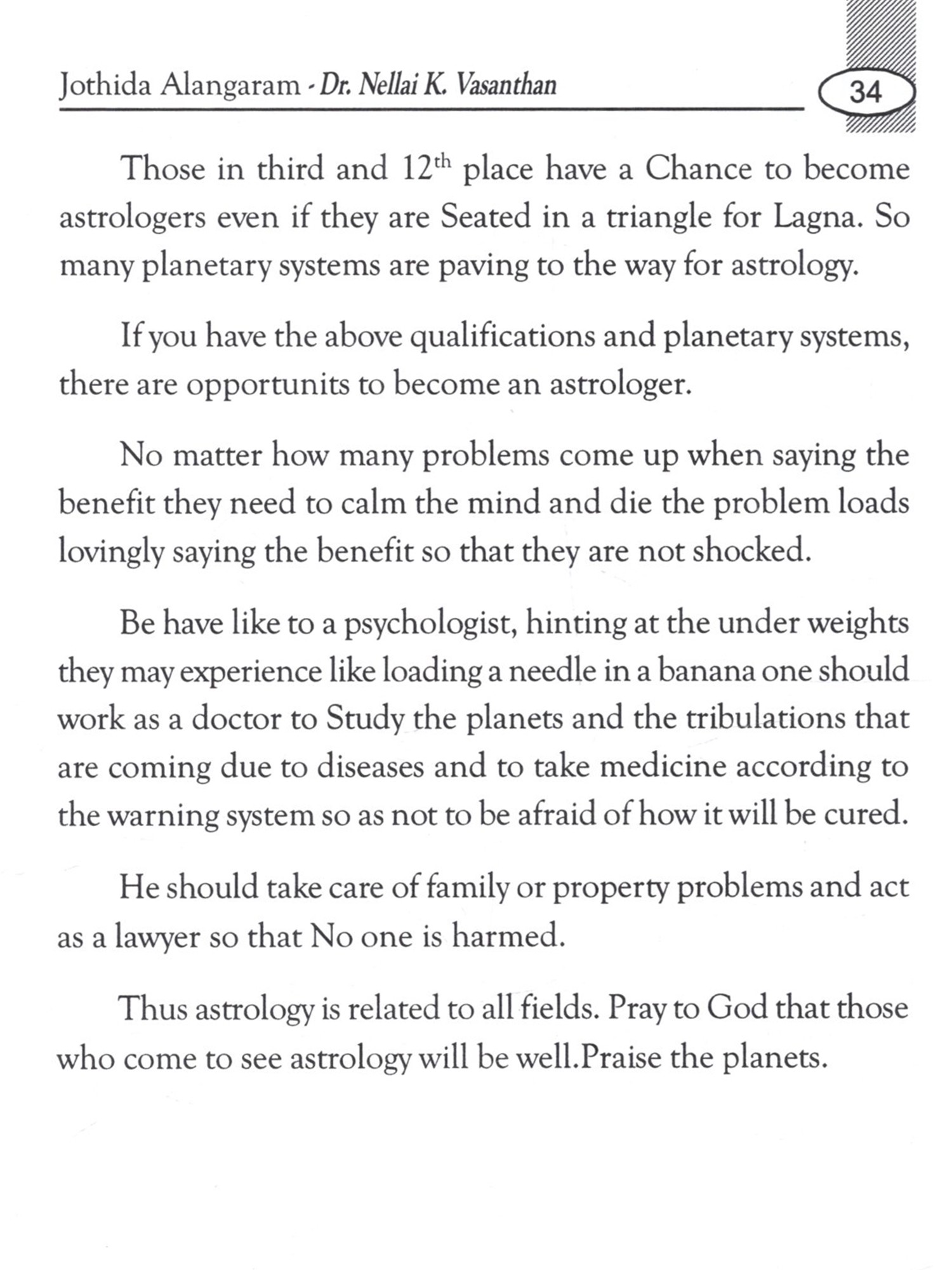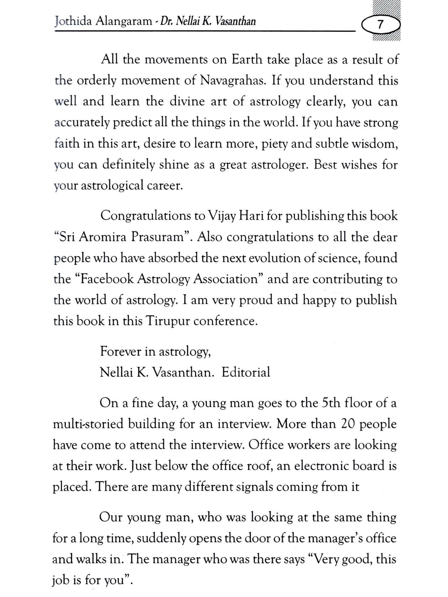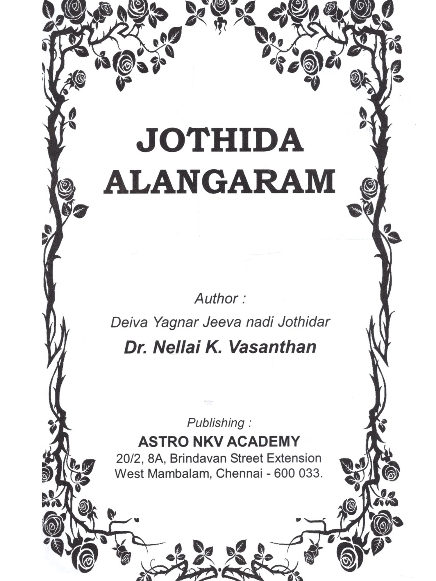 "Jothida Alangaram" Dr. Nellai Vasanthan is known for his unique way of approaching Astrology by saying even gods are controlled by planetary positions. N.K.V System is a modern art of Astrology and research which gives us simple and effective remedies for the welfare of human life. After many years of research, Dr. Nellai K Vasanthan compiled his knowledge and wisdom in the book "Jothida Alangaaram" which includes "To find ones career or business", "To find who can be-come an astrologer", "Planets related to flight accidents" and "To find who have credit card dhosham" "Jothida Alangaaram" is one of the masterpieces of Nellai K Vasanthan. N.K.V System has the most simple and unique way of remedies using ribbon, groceries, bamboo sticks, metals, and meat. This system can also be used to predict the future through Aadhar cards and Cash Prasanam. This system specifies in-name astrology of a particular horoscope of a person and their surroundings.