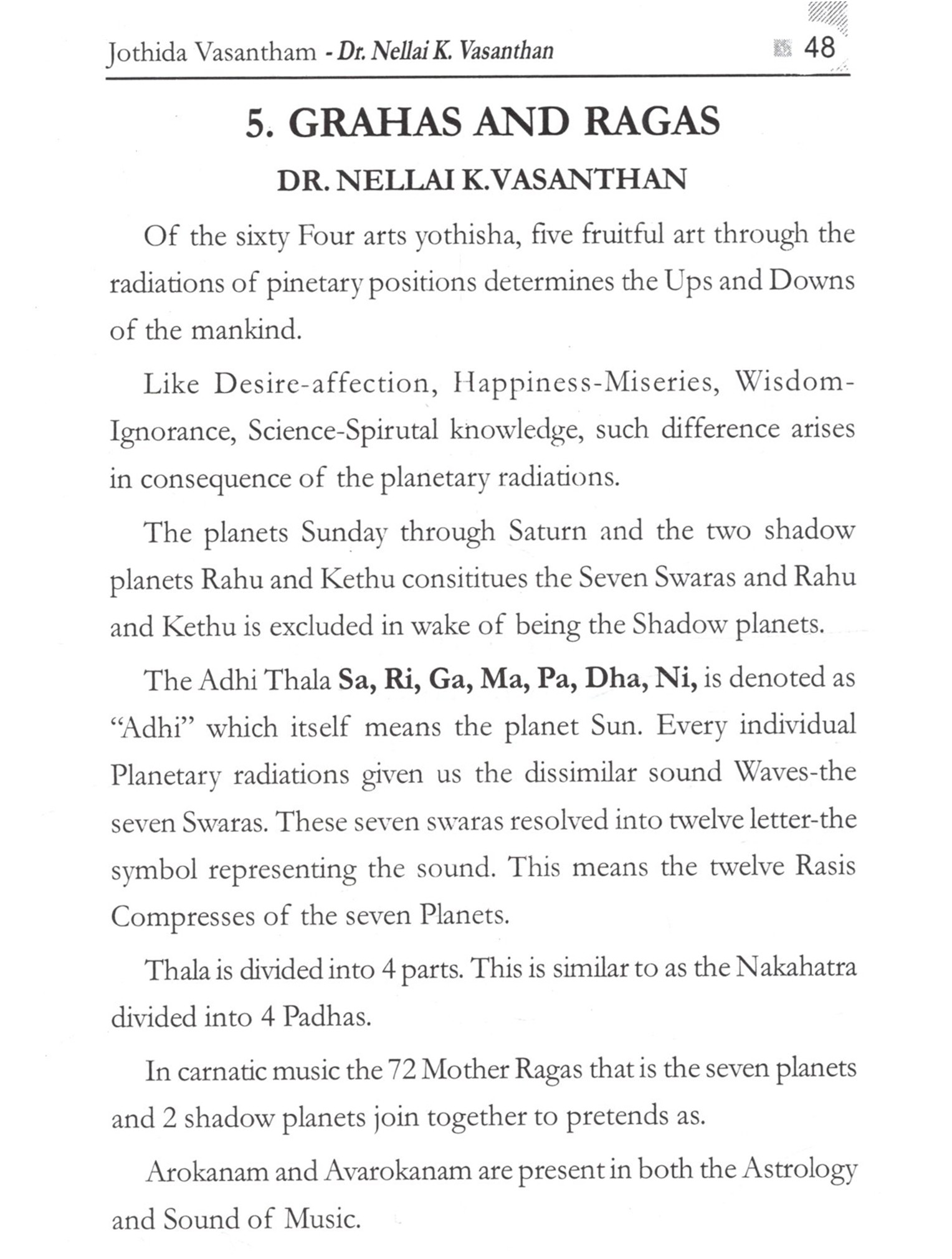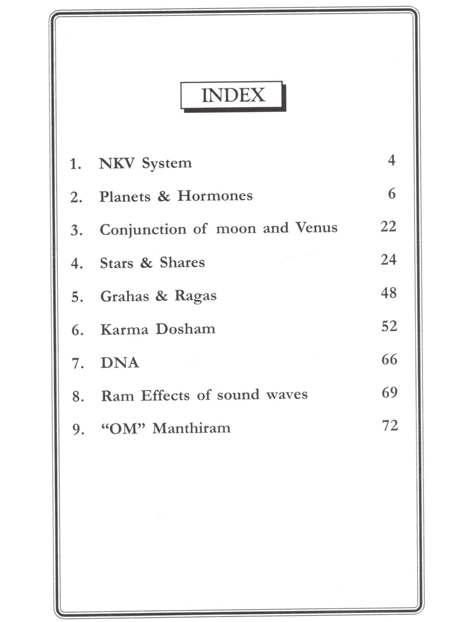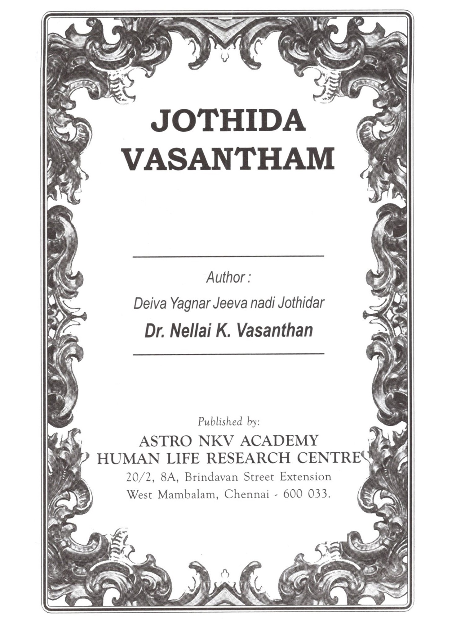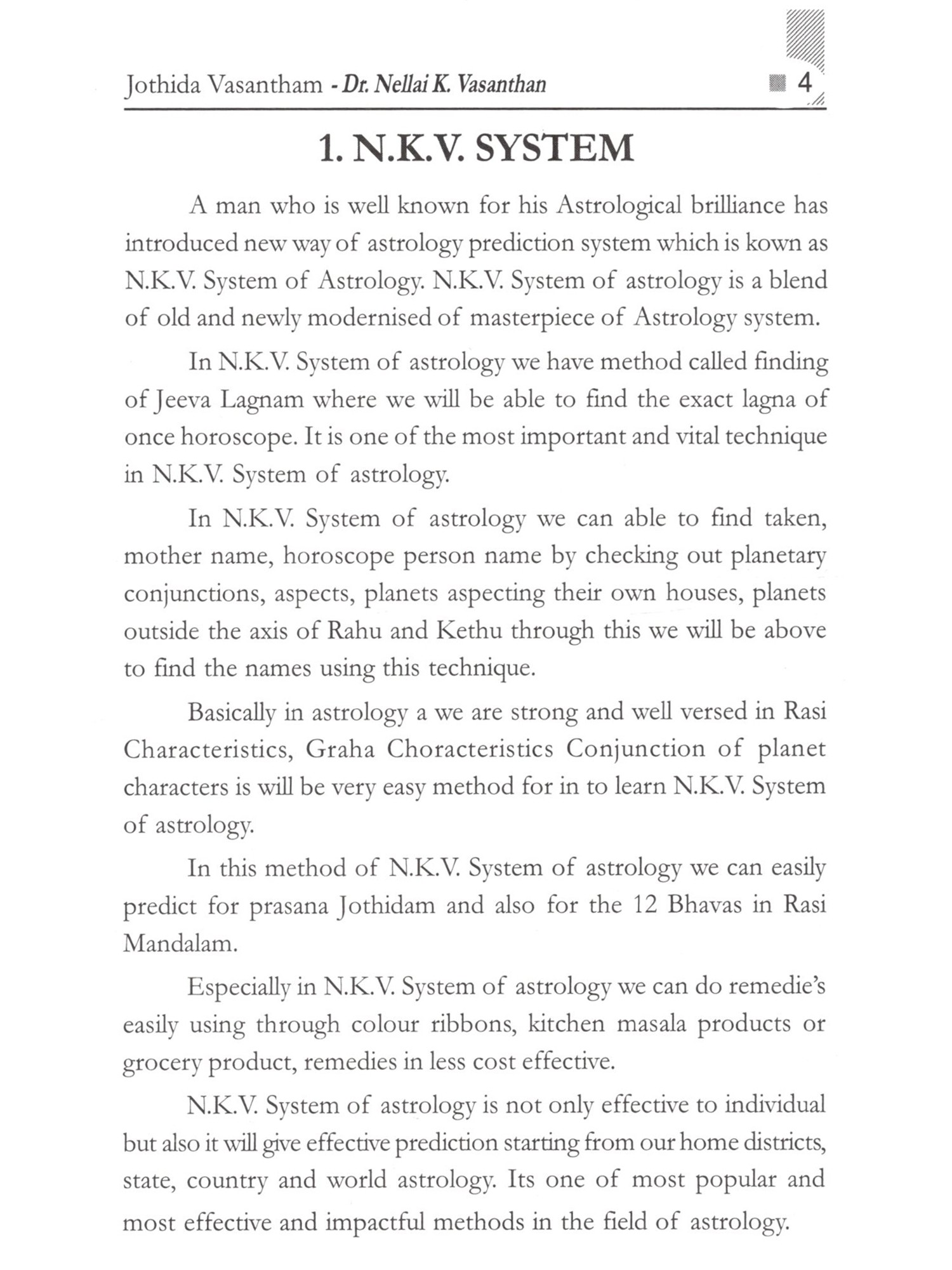 "Jothida Alangaram" Dr. Nellai Vasanthan is known for his unique way of approaching Astrology by saying even gods are controlled by planetary positions. N.K.V System is a modern art of Astrology and research which gives us simple and effective remedies for the welfare of human life. After many years of research, Dr. Nellai K Vasanthan compiled his knowledge and wisdom in the book "Jothida Alangaaram" which includes "To find ones career or business", "To find who can be-come an astrologer", "Planets related to flight accidents" and "To find who have credit card dhosham" "Jothida Alangaaram" is one of the masterpieces of Nellai K Vasanthan. N.K.V System has the most simple and unique way of remedies using ribbon, groceries, bamboo sticks, metals, and meat. This system can also be used to predict the future through Aadhar cards and Cash Prasanam. This system specifies in-name astrology of a particular horoscope of a person and their surroundings.