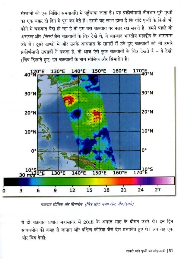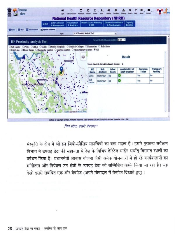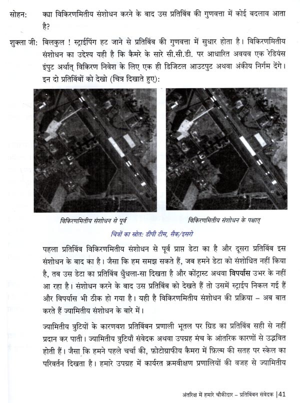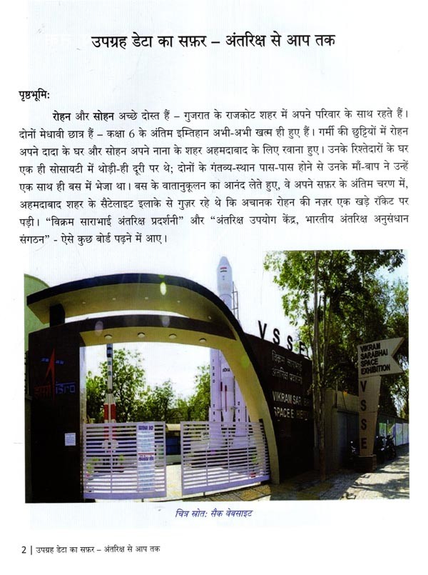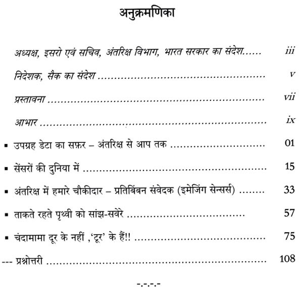 अंतरिक्ष आदिकाल से मानव की जिज्ञासा का विषय रहा है। भारत का अंतरिक्ष कार्यक्रम छोटे-से बीज की तरह अंकुरित होकर, अब वट वृक्ष का रूप ले चुका है। उपग्रह अभिकल्प, निर्माण और प्रक्षेपण अपने आप में एक चुनौतीपूर्ण कार्य है। उपग्रह से प्राप्त कच्चे आंकड़ों को उपयोक्ताओं हेतु प्रभावी बनाने के लिए इन आंकड़ों का प्रसंस्करण आवश्यक होता है। इस पुस्तक के प्रथम चरण में उपग्रह डेटा के अभिग्रहण से लेकर उसके अंतिम प्रयोक्ता तक पहुँचने तक के सफर को सरल भाषा में आलेखित करने का विनम्र प्रयास किया गया है। द्वितीय चरण में उपग्रह और उनके निर्धारित अनुप्रयोगों की चर्चा करते हुए, संवेदक (सेंसर) और नीतभार के अलग-अलग प्रकारों को दर्शित किया गया है। तृतीय चरण में इसरो के विभिन्न प्रतिर्विवन नीतभार से प्राप्त डेटा एवं उस डेटा से प्रसंस्कृत डेटा उत्पाद को समझाया गया है। चौथे चरण में गैर-प्रतिबिंबन संवेदक (नॉन-इमेजिंग सेंसर) की चर्चा करते हुए, उनके कुछ रोचक अनुप्रयोगों के बारे में चर्चा की गई है। पाँचवे और अंतिम चरण में इसरो के चंद्र एवं अंतरिक्ष के अन्वेषण हेतु ग्रहीय अभियानों की जानकारी को दर्शाया गया है; इस अध्याय में विशेष रूप से चंद्रयान और गगनयान के बारे में बताया गया है।