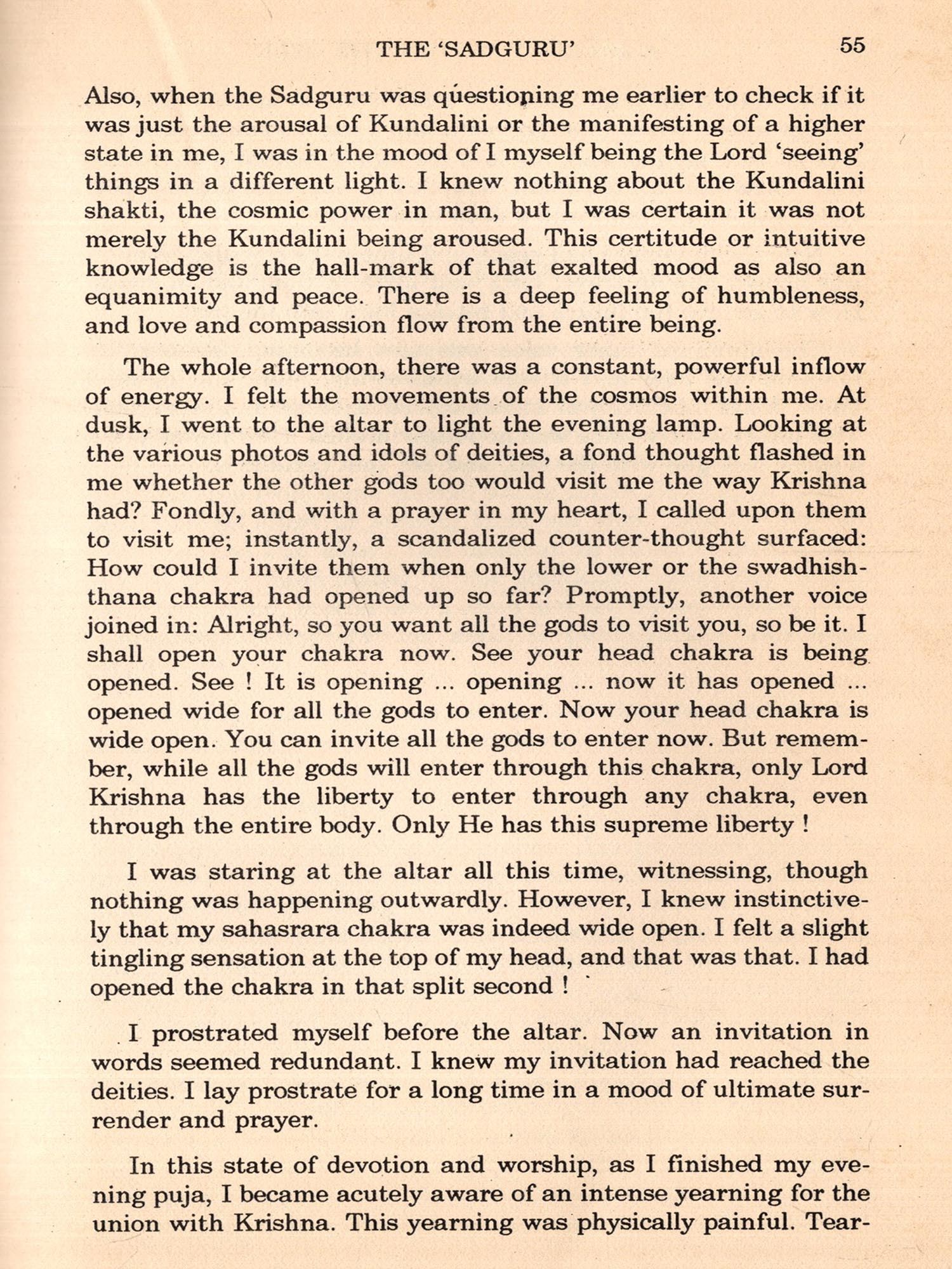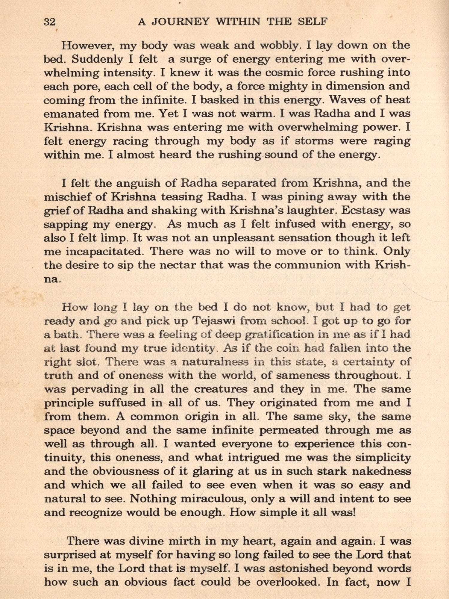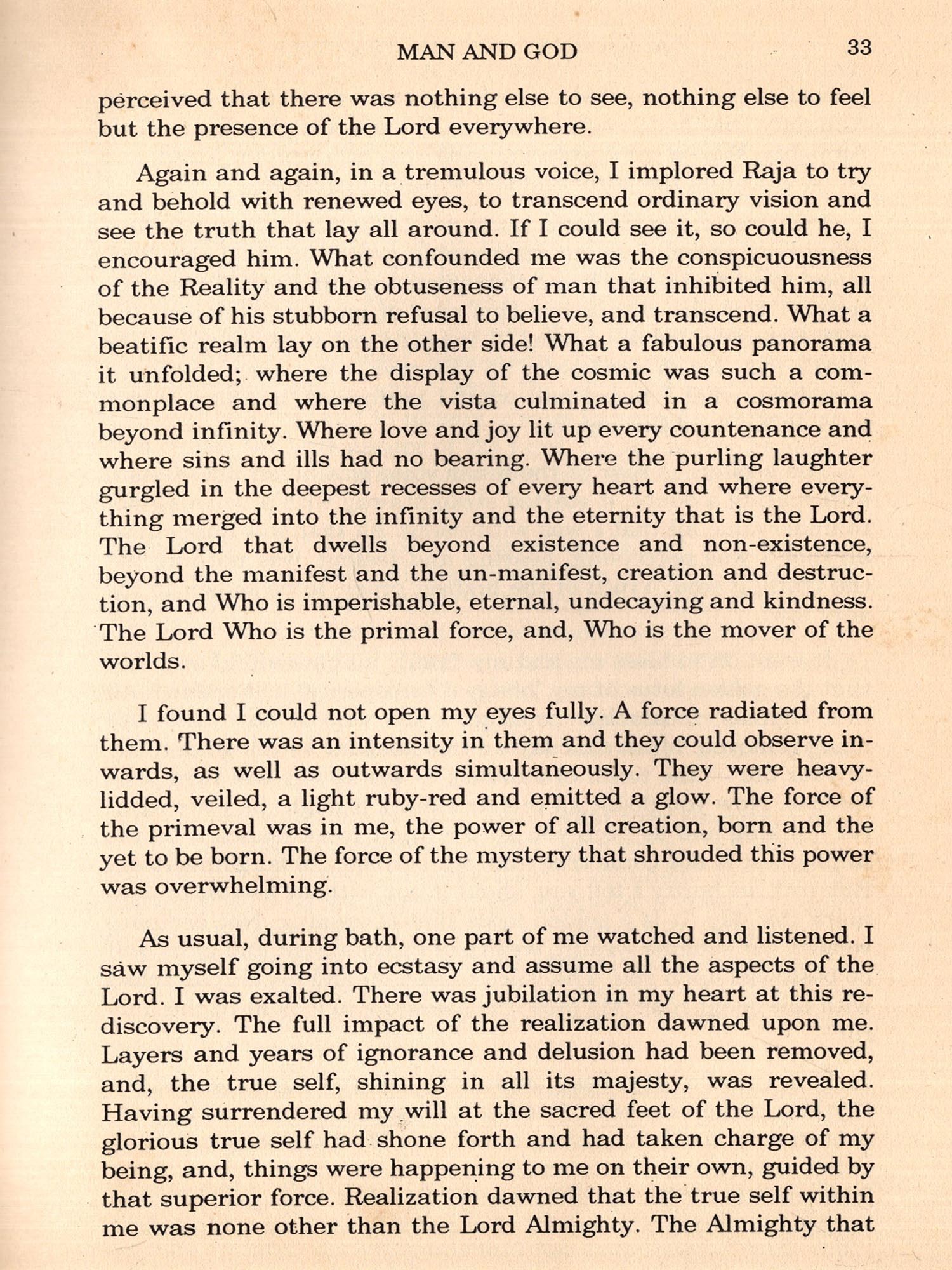 I had not read any scriptures prior to my experience outlined here nor had I any yearning at all for knowledge of the Divine Life was perfect for me. I needed no change. Desire for this or hankering for that was unknown to me.