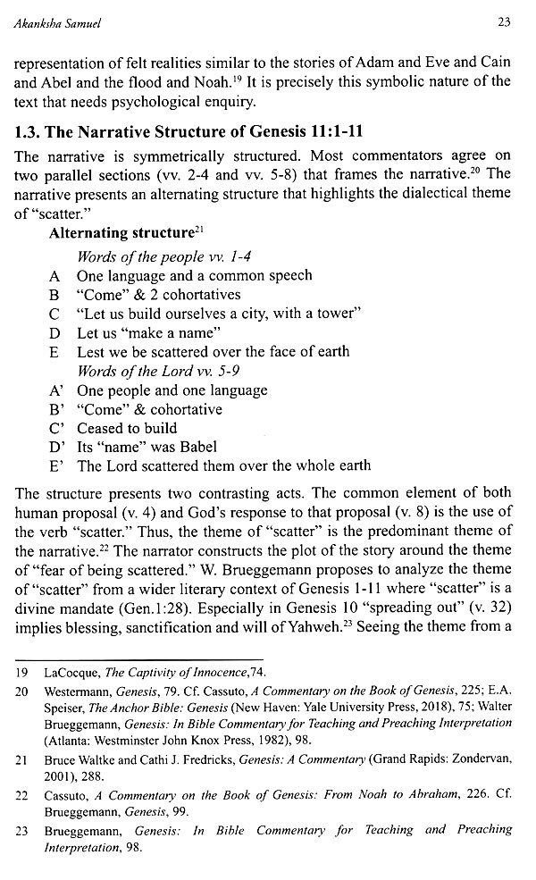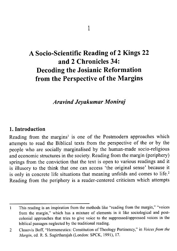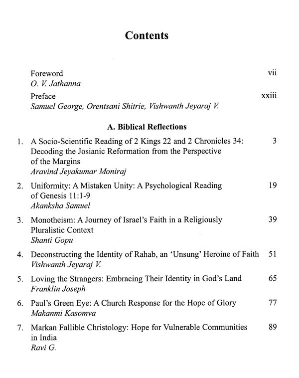 Aravind Jeyakumar Moniraj, in his article: A Socio-Scientific Reading 2 Kings 22 and 2 Chronicles 34: Decoding the Josianic Reformation from the perspectives of the Margins using socio-scientific method argues for unearthing 'hidden' agendas of Josianic reformation and its impact on the populace especially those from the marginalized sections. Akanksha Samuel, in her article: Uniformity. A Mistaken Unity. A Psychological Reading of Genesis 11:1-9, examines the narrative of the Tower of Babel from a psychological reading using Donald Woods Winnicott's Object Relations Theory. It highlights that true identity is not achieved through isolation or detachment but through the negotiation of relationships and the integration of diverse perspectives. Shanthi Gopu, in her article: Monotheism: A Journey of Israel's Faith in a Religiously Pluralistic Context speaks of the evolution of monotheism from polytheism in the Israelites' faith journey. It also highlights, how the neighboring countries' faith influenced and brought changes in Israel's faith journey and how it can be model for Christian faith in a pluralistic context. Vishwanth Jeyaraj, in his article: Deconstructing the identity of Rahab, an 'Unsung heroine of faith explores the identity of an 'unsung' heroine of faith in the Bible Rahab. A deconstructive historical-biblical approach is employed to unearth this identify Franklin Joseph, explores in his article: Loving the Strangers: Embracing their Identity in God's Land the importance of Loving strangers which is a biblical mandate. The aim is to show our solidarity with the strangers and embrace their identity as a Christian virtue.Makanmi Kasomva, investigates in his article: Paul's Green Eye: A Church Response for the Hope of Glory the ecological concerns faced in today's world through the lens of St. Paul. Ravi G., in his article: Markan Fallible Christology: Hope for Vulnerable Communities in India examines the Christological motifs in Markan Narratives, especially the suffering and death of Christ on the cross, and its relevance for vulnerable communities in India.