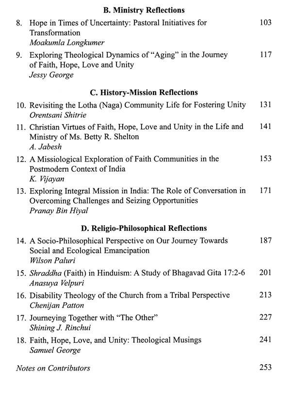 O.V. Jathanna, in his Foreword explores in depth the biblical-theological facets of the biblical triad of faith-hope-love and unity.