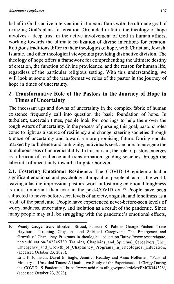 Moakumla Longkumer, in her article: Hope in Times of Uncertainty: Pastoral Initiatives for Transformation focuses on the importance of Christian ministry (pastoral) during and after COVID-19. Jessy George, her article: Exploring Theological Dynamics of "Aging" in the Journey of Faith, Hope. Love, and Unity offers a Christian ministerial perspective to the importance and challenges faced due to aging.