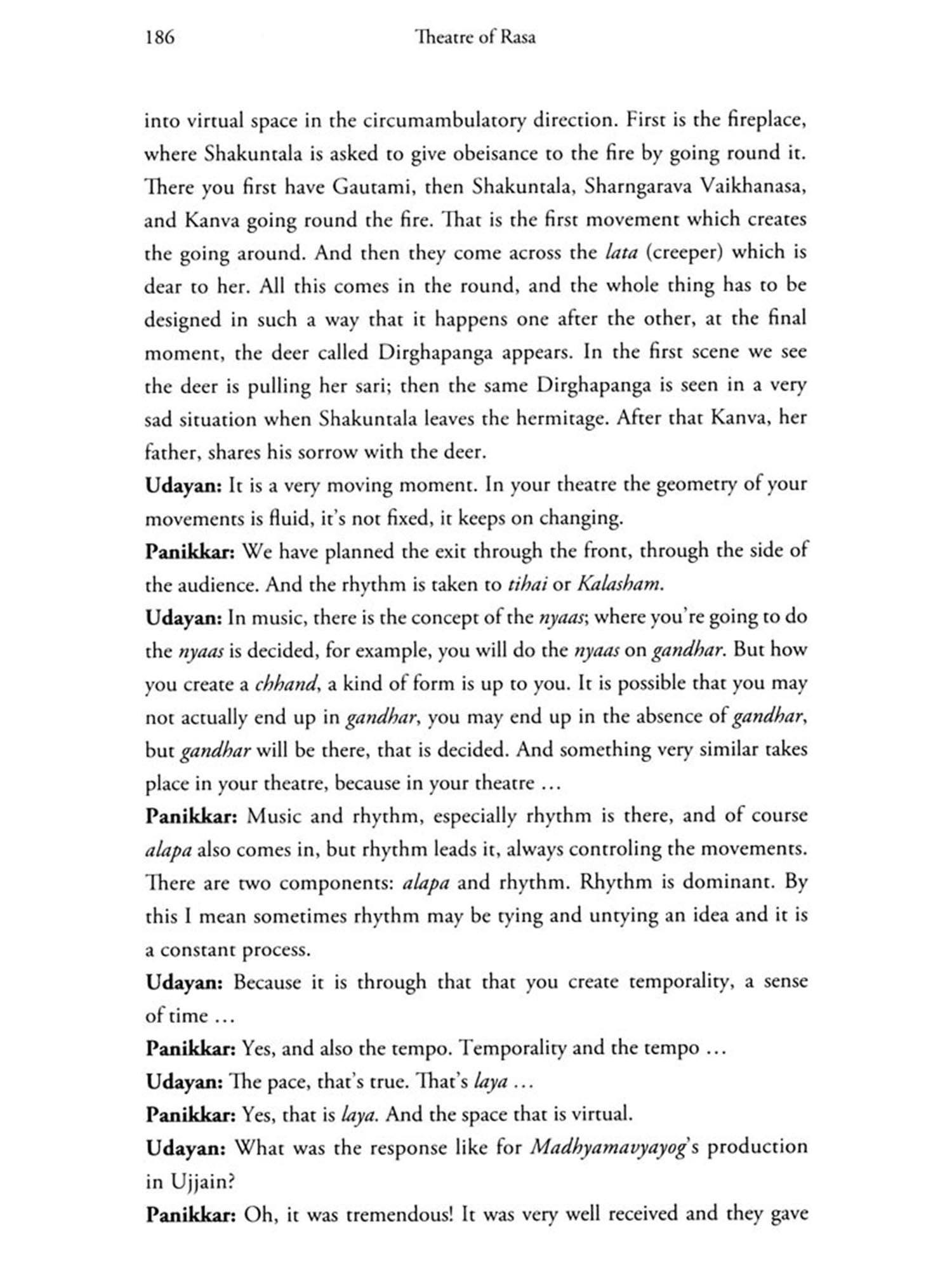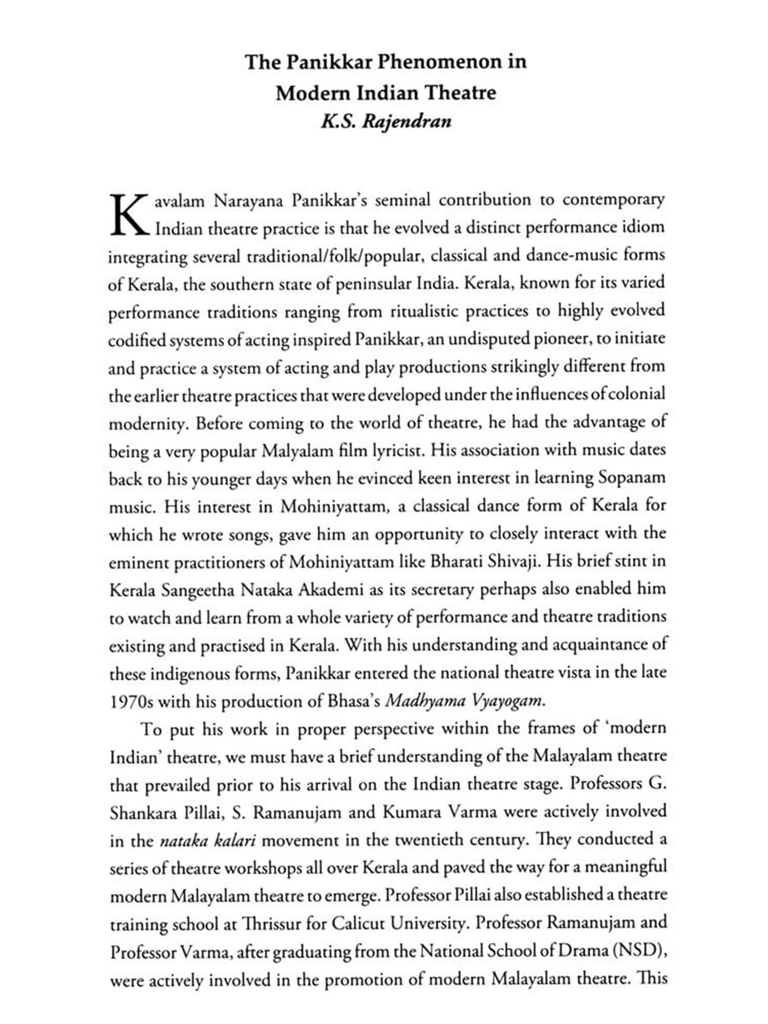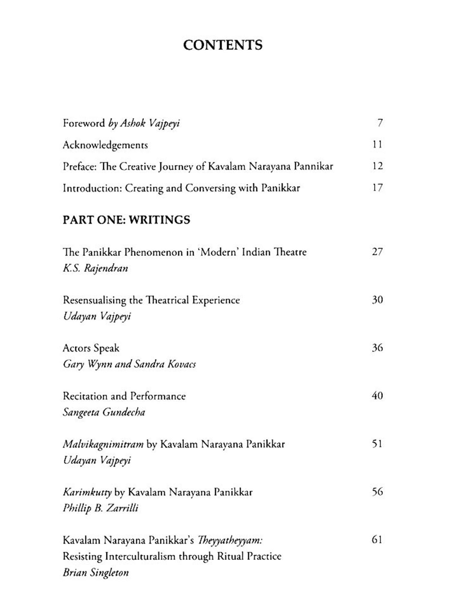 Udayan Vajpeyi has edited the book for Natarang Pratisthan. He is a Hindi poet, fiction writer and critic who has been engaged for long with cinema, theatre and other performing arts. He has spent considerable time with Panikkar watching him work and talked to him at length. The material collected in the book carries many traces of a multilayered dialogue between a master and a younger inquisitive and sensitive mind.