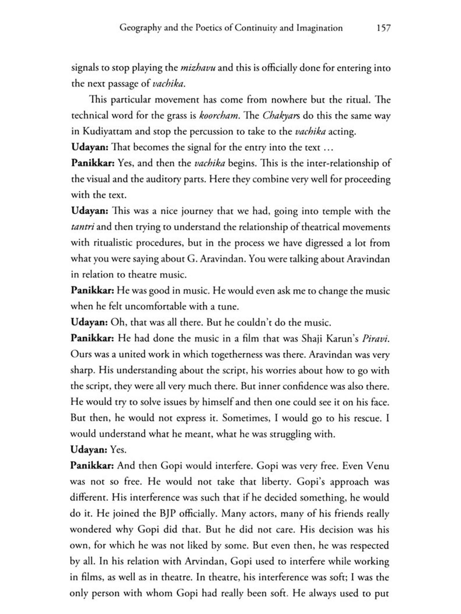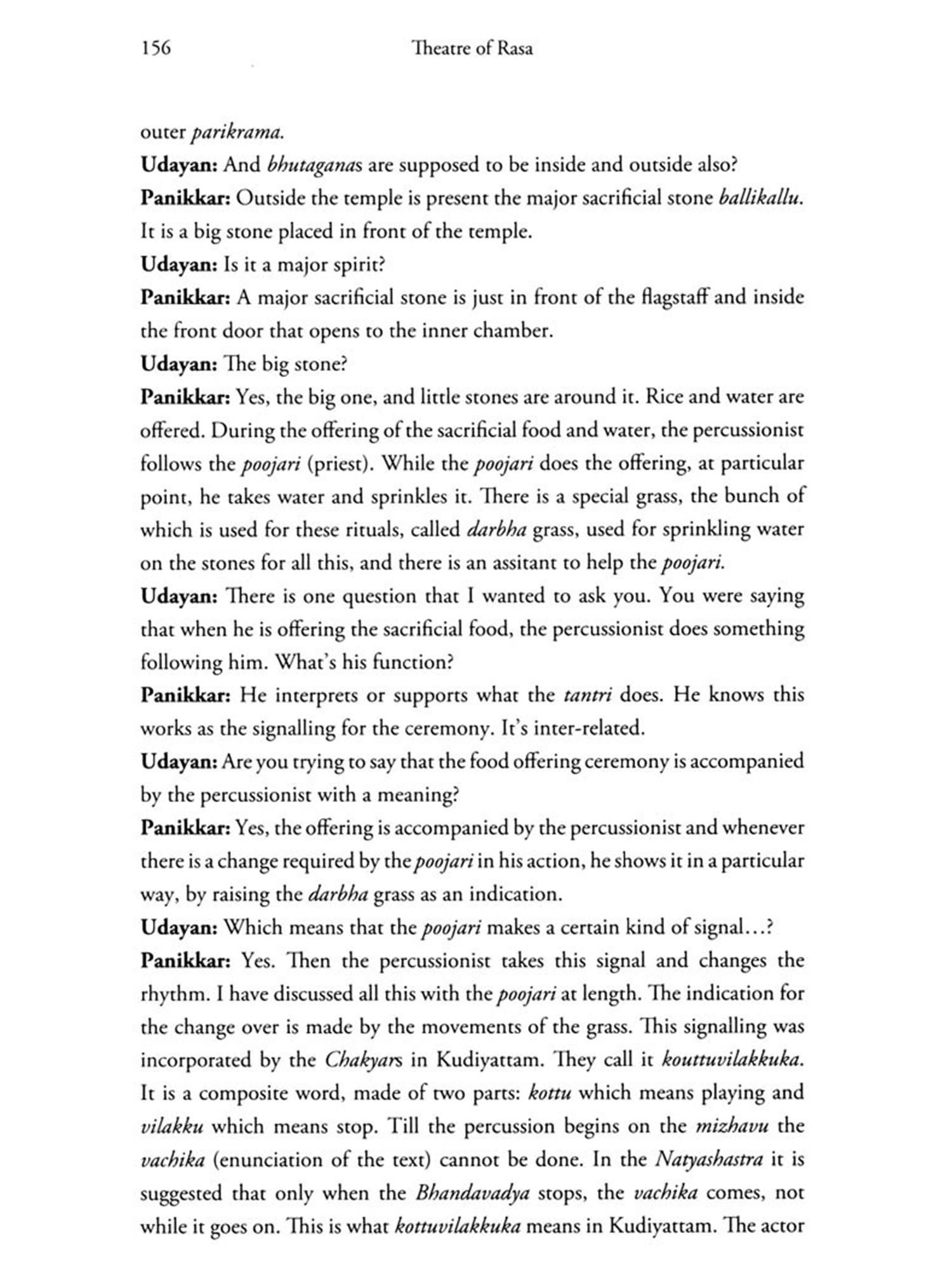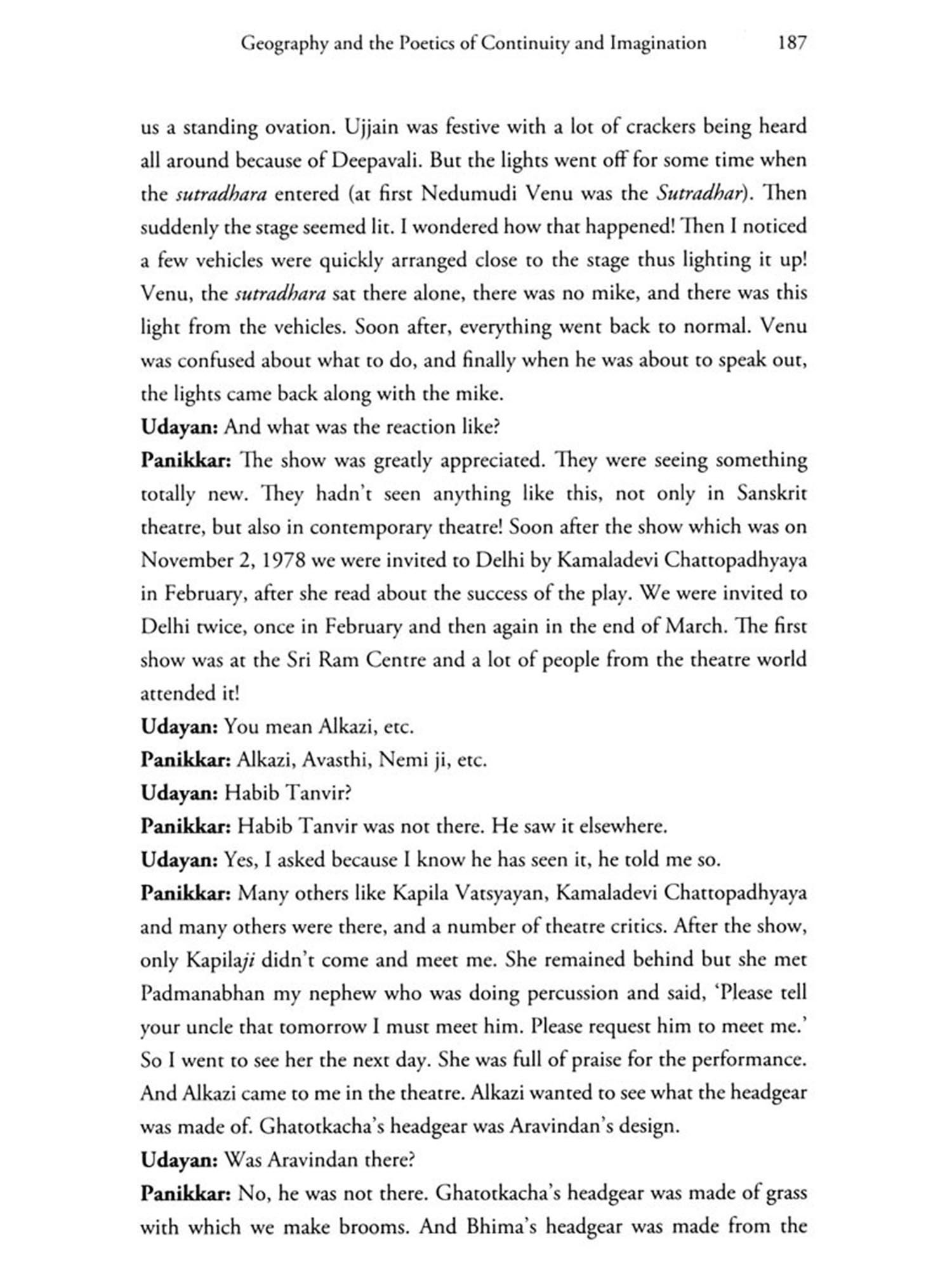 Udayan Vajpeyi has edited the book for Natarang Pratisthan. He is a Hindi poet, fiction writer and critic who has been engaged for long with cinema, theatre and other performing arts. He has spent considerable time with Panikkar watching him work and talked to him at length. The material collected in the book carries many traces of a multilayered dialogue between a master and a younger inquisitive and sensitive mind.