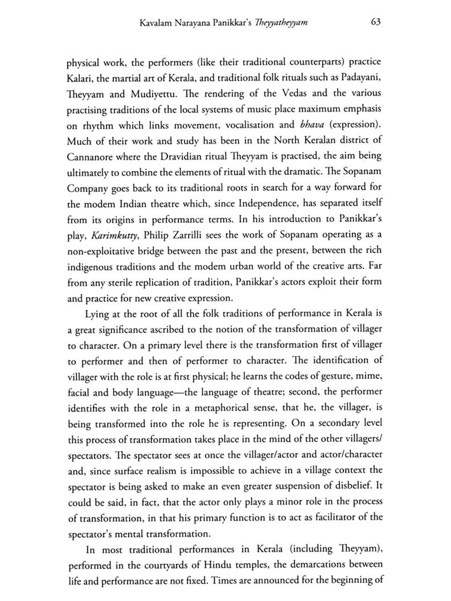 Kavalam Narayana Panikkar is one of India's most revered theatre directors. He has been writing and directing plays for the last four decades and even today, remains as energetic and as creative as ever. Panikkar's involvement with theatre began with him writing poetry and plays. Gradually he began directing plays himself. This was the beginning of a significant career as a theatre director who found new ways of relating to existing traditions. Panikkar's contemporaneity lies in his continual experimentation and innovation within the broader framework of Indian ways of doing theatre. In this way, his theatre is in constant dialogue with the folk (deshi) and classical (margi) traditions of performing art in India.