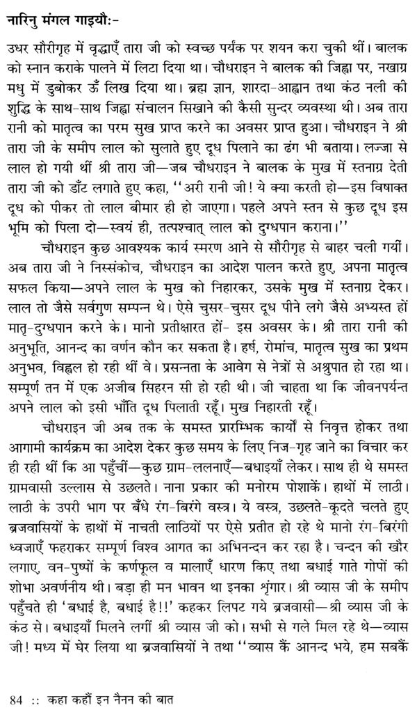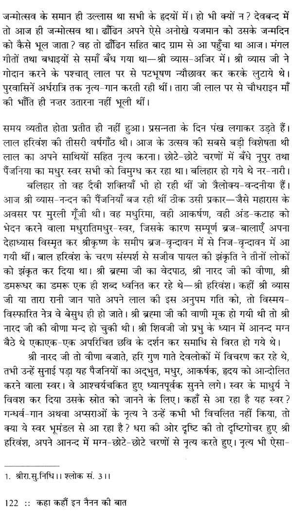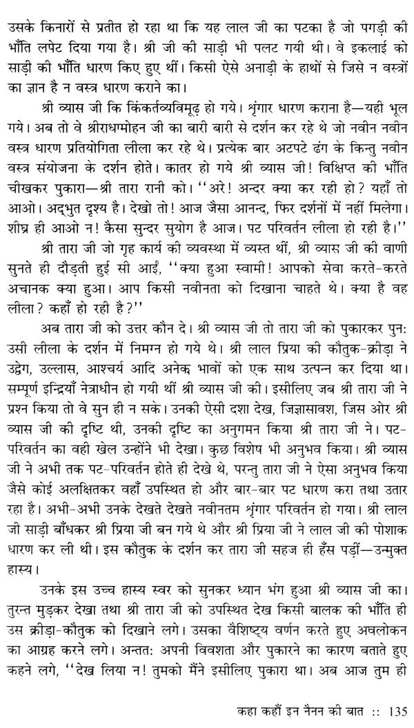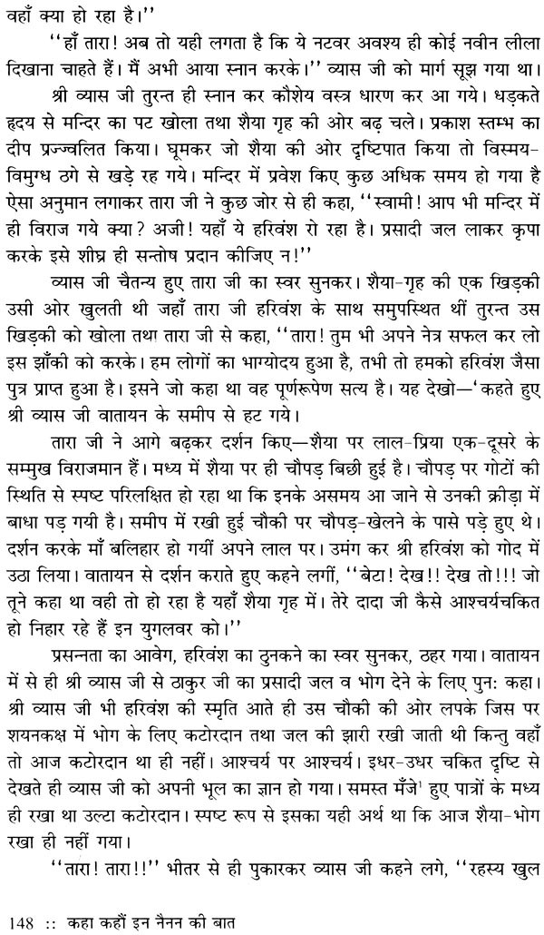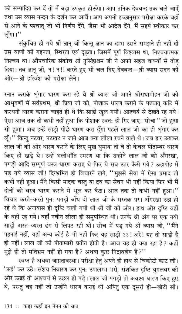 राष्ट्र भाषा भारती (हिन्दी खड़ी बोली) में रसावतार, प्रेम-मूर्ति, श्री हित महाप्रभु का चरित्र तो है ही, इसमें उस समय के देश, काल, वातावरण तथा घटनाओं का भी तात्कालिक चित्रण है। जिससे अतीत वर्तमान में घटित होता, मूर्तिमान होता प्रतीत होता है। इसमें कल्पनाओं का जाल, मूल 'श्री हित हरिवंश चरित' के पात्रों एवं घटनाओं के चारों ओर मकड़ी के जाले की भाँति अपने पारदर्शी स्वरूप में इस तरह लिपट गया है कि चरित्र इतिहास न रहकर कल्पना संयुक्त उपन्यास मात्र प्रतीत होता है। इसीलिए इसका औपन्यासिक नाम, श्री हित महाप्रभु के चरित्र की रस-सिक्तता के अनुकूल "कहा कहाँ इन नैनन की बात" ही सार्थक लगा। यह दो खण्डों में पूर्ण हुआ है, प्रथम श्री देवबन्द खण्ड तथा द्वितीय श्री वृन्दावन खण्ड।
