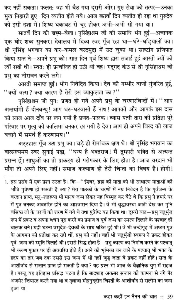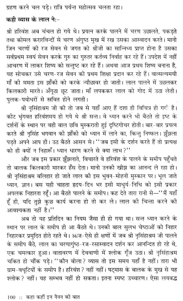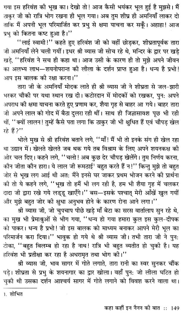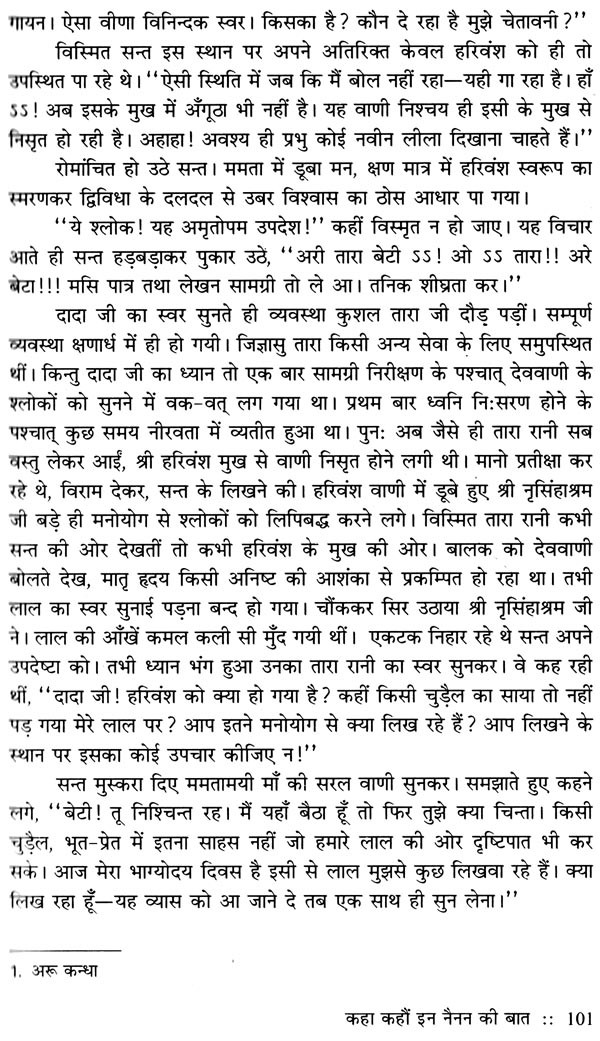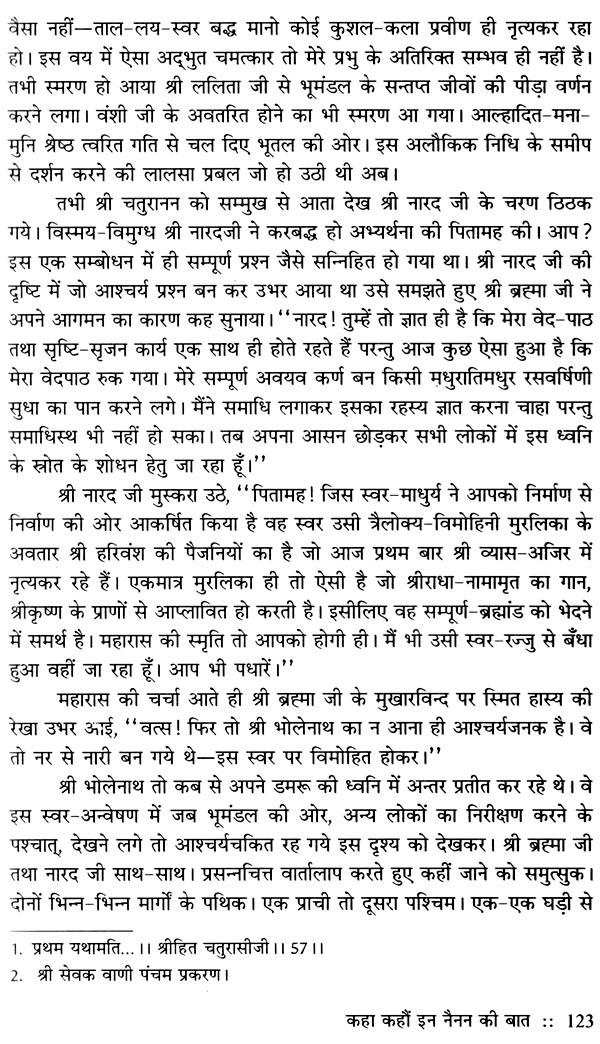 राष्ट्र भाषा भारती (हिन्दी खड़ी बोली) में रसावतार, प्रेम-मूर्ति, श्री हित महाप्रभु का चरित्र तो है ही, इसमें उस समय के देश, काल, वातावरण तथा घटनाओं का भी तात्कालिक चित्रण है। जिससे अतीत वर्तमान में घटित होता, मूर्तिमान होता प्रतीत होता है। इसमें कल्पनाओं का जाल, मूल 'श्री हित हरिवंश चरित' के पात्रों एवं घटनाओं के चारों ओर मकड़ी के जाले की भाँति अपने पारदर्शी स्वरूप में इस तरह लिपट गया है कि चरित्र इतिहास न रहकर कल्पना संयुक्त उपन्यास मात्र प्रतीत होता है। इसीलिए इसका औपन्यासिक नाम, श्री हित महाप्रभु के चरित्र की रस-सिक्तता के अनुकूल "कहा कहाँ इन नैनन की बात" ही सार्थक लगा। यह दो खण्डों में पूर्ण हुआ है, प्रथम श्री देवबन्द खण्ड तथा द्वितीय श्री वृन्दावन खण्ड।