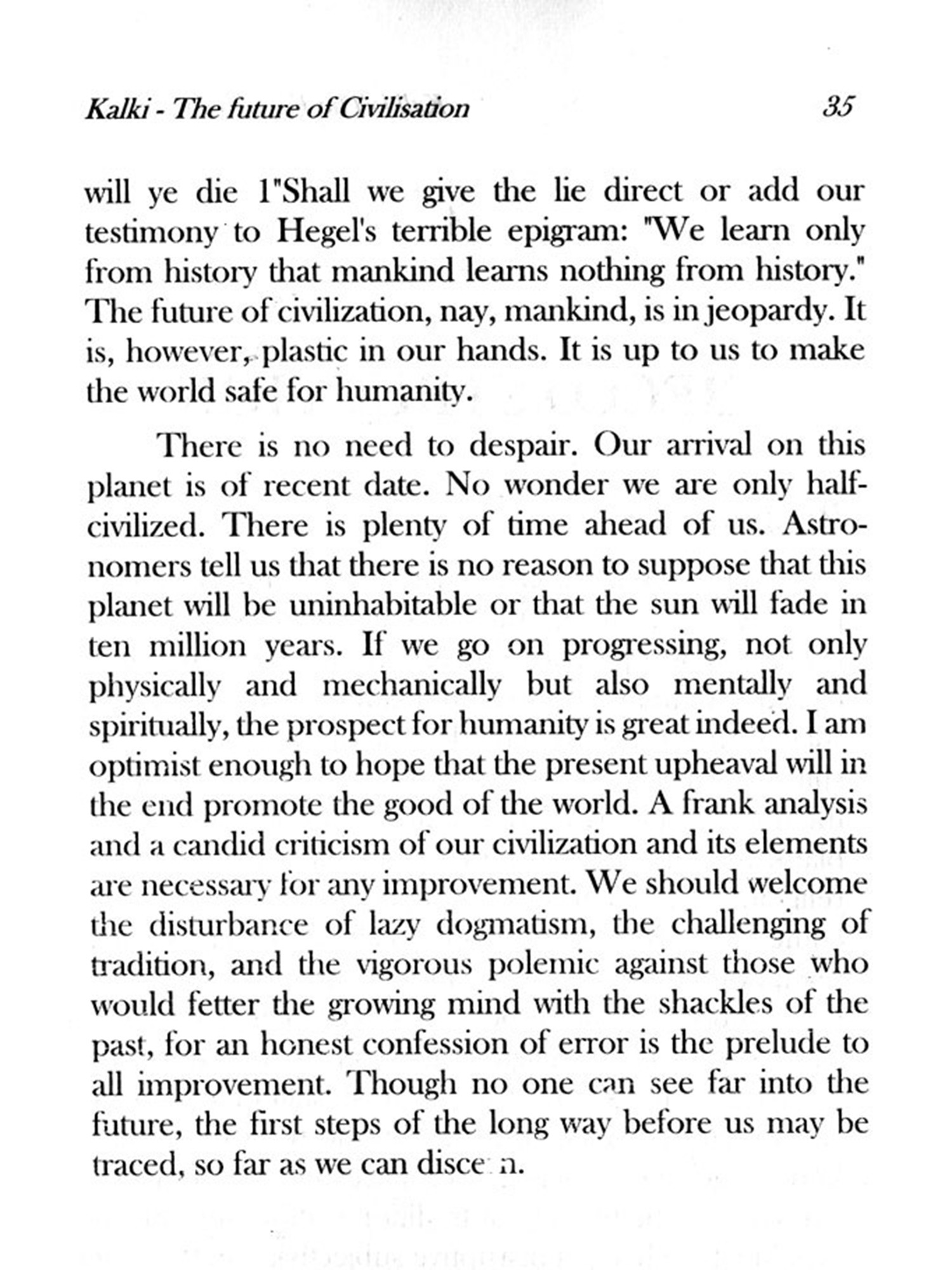 CIVILIZATION today seems to be passing through one of its periodic crises. The world is casting off its old garments. Standards, aims, arid institutions which were generally. accepted even a generation ago are now challenged and changing. Old motives are weakening and new forces are springing up. Anyone who has an insight into the mind of the age is vividly conscious of its restlessness and uncertainty, its dissatisfaction with the existing economic and social conditions and its yearning for the new order which is not yet realized. All this confusion of thought and unstable enthusiasms for ill-defined ideals show that humanity is about to take a new step forward. One of the chief factors in this unsettlement is modern science. Though science is not peculiar to our civilization, its pace of progress has become latterly too fast and its range too wide and deep for our quick adaptation. If we take an animal out of its normal environment and thrust it into another, it is bound to feel restless and uneasy until it adjusts itself to the new situation. An estimate of the future of civilisation it is relevant even today though forethought 80 years earlier. Dr. Radhakrishnan, the former President, and eminent Philosopher needs no introduction to his thoughts on the future of civilisation.
