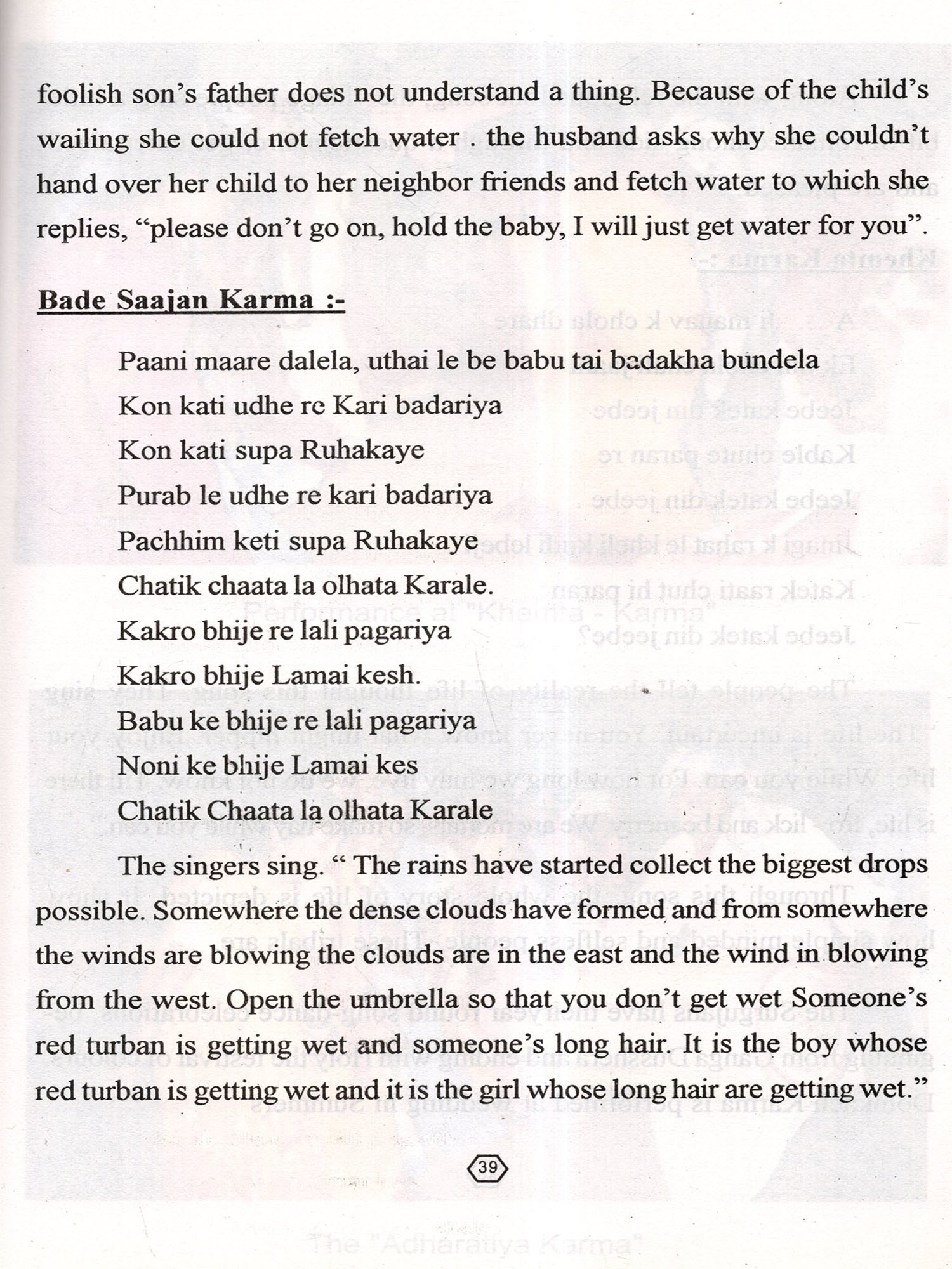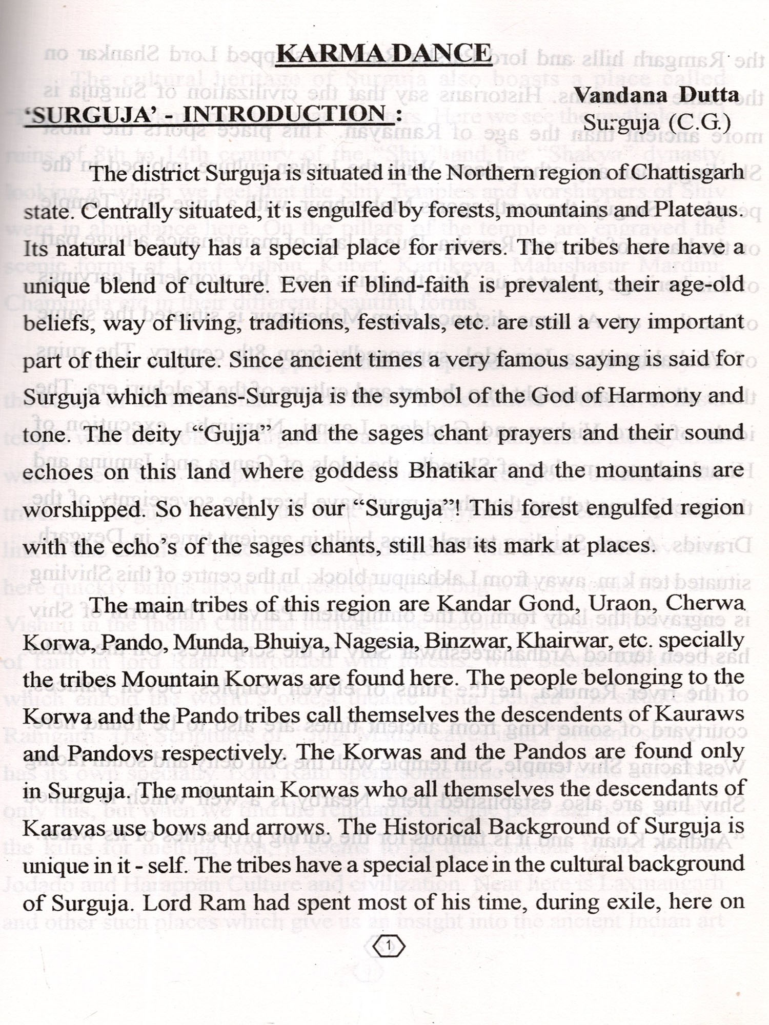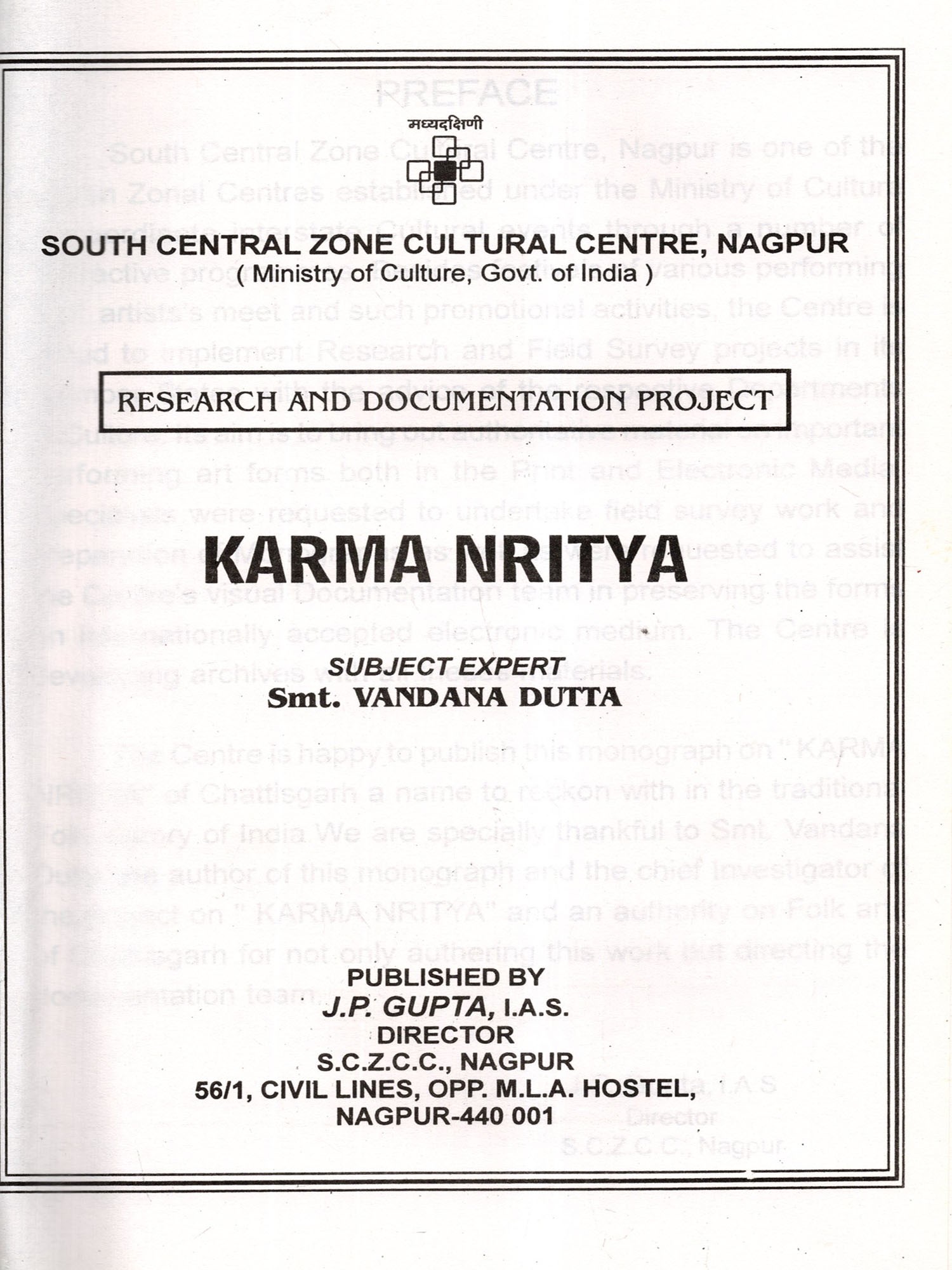The Centre is happy to publish this monograph on " KARMA NRITYA" of Chattisgarh a name to reckon with in the traditional Folk history of India. We are specially thankful to Smt. Vandana Dutta the author of this monograph and the chief Investigator of the project on " KARMA NRITYA" and an authority on Folk arts of Chattisgarh for not only authering this work but directing the documentation team.