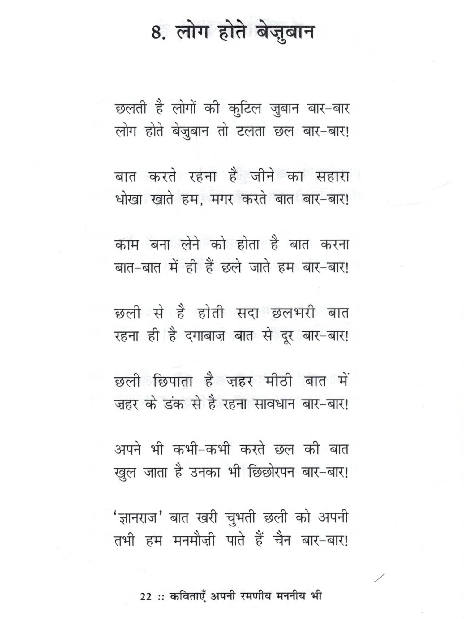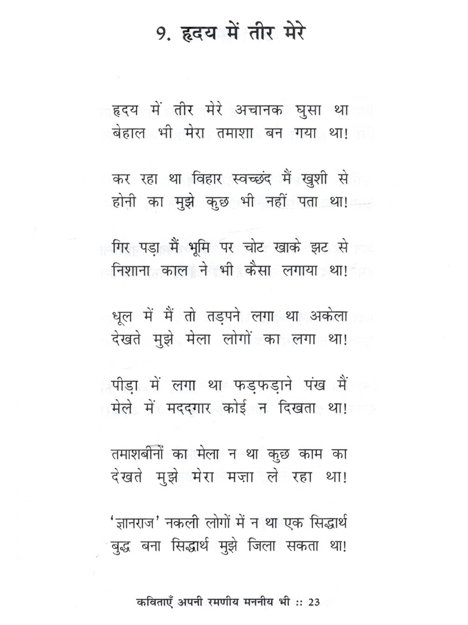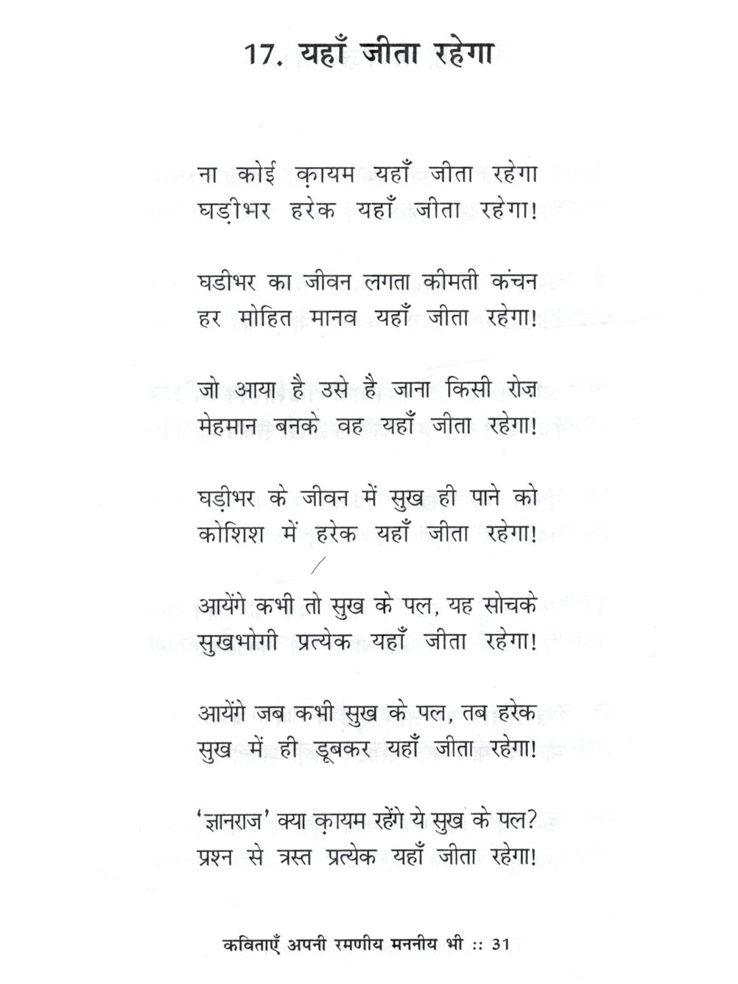 डॉ. ज्ञानराज काशीनाथ गायकवाड 'राजवंश' एम.ए.पीएच.डी. संभव है कि पढ़ने की क्रिया के द्वारा इस कविता संग्रह की कविताओं का आस्वादन करते समय पाठक रूपी रसिक अर्थात् सहृदय को लगता रहेगा कि ये कविताएँ तो अपनी ही हैं। क्योंकि कभी-कभी प्रसंगवश अपने को जो कुछ ऐसा लगने लगता है, जिसे अपना मन शब्दों के माध्यम से व्यक्त करना चाहता रहता है, वही तो कविता के रूप में इस कविता संग्रह की कविताओं में अभिव्यक्त हुआ है। अतएव ये कविताएँ अपनी ही हैं। साथ ही साथ उन कविताओं का आस्वादन करते समय सहृदय को ऐसा भी लगता रहेगा कि ये कविताएँ अपने प्रभावी आशय से तथा अपनी आनन्ददायक कलात्मकता से मन को रमानेवाली हैं. इसलिए ये कविताएँ रमणीय हैं और मन को जीवन के विषय में उपयुक्त विचार करने के लिए प्रेरित करनेवाली हैं, इसलिए वे कविताएँ मननीय भी हैं!