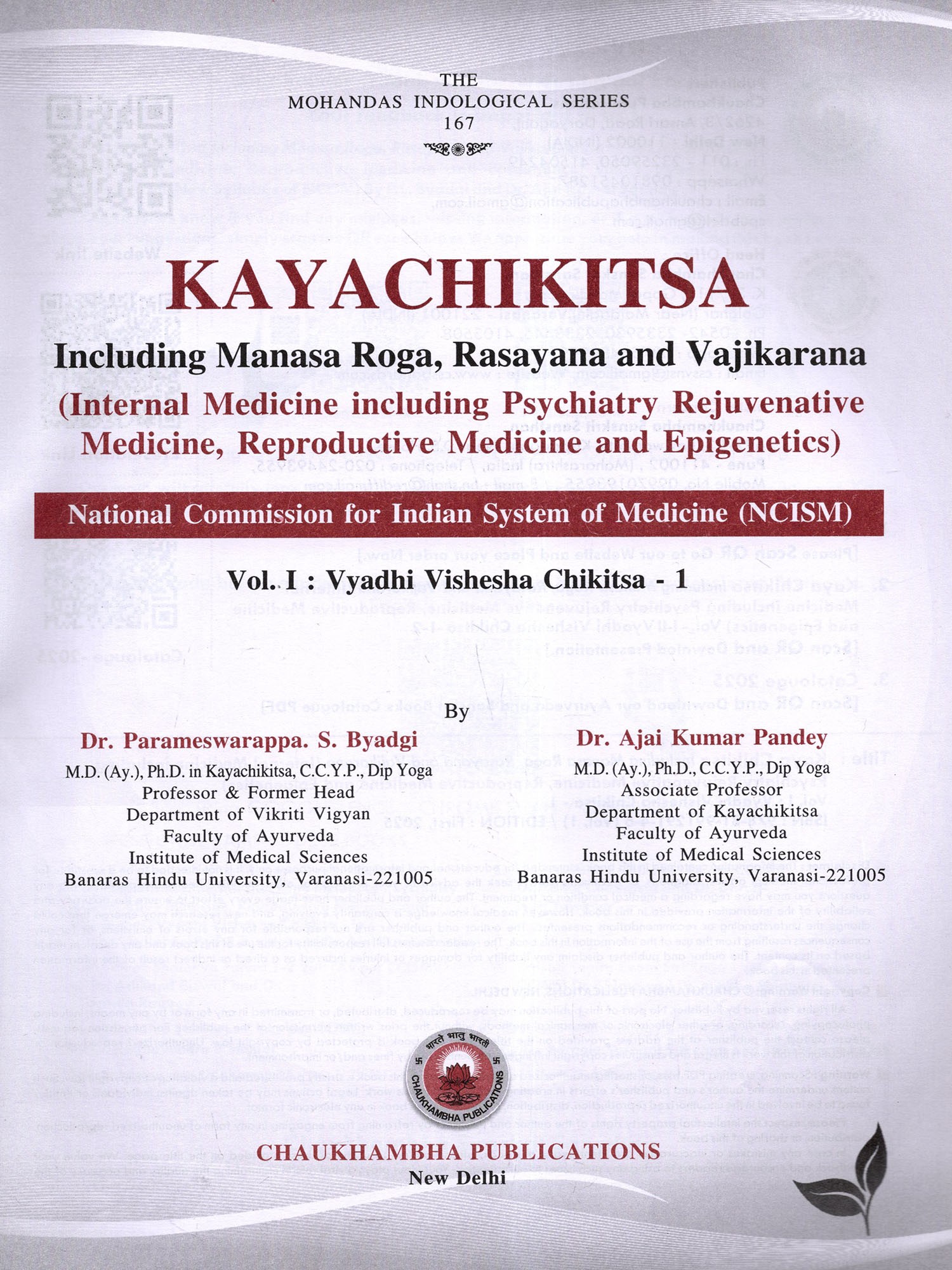 Very recently, the syllabus of Kayachikitsa (Internal Medicine) has been revised by the National Commission for Indian System of Medicine (NCISM), New Delhi. At this juncture, there is a strong felt need among the academic fraternity to develop a textbook on Kayachikitsa that addresses the evolving needs of students. This book has been written with a student-centric approach, focusing on the classical aspects of disease management while also incorporating modern perspectives on various diseases to ensure its relevance in contemporary clinical practice. This textbook has been meticulously designed to serve as a comprehensive guide for undergraduate and postgraduate students, Ayurveda practitioners, and scholars. It integrates classical concepts drawn from the Charaka Samhita, Ashtanga Hridaya, and other authoritative Ayurvedic texts with contemporary clinical interpretations, evidence-based approaches etc.