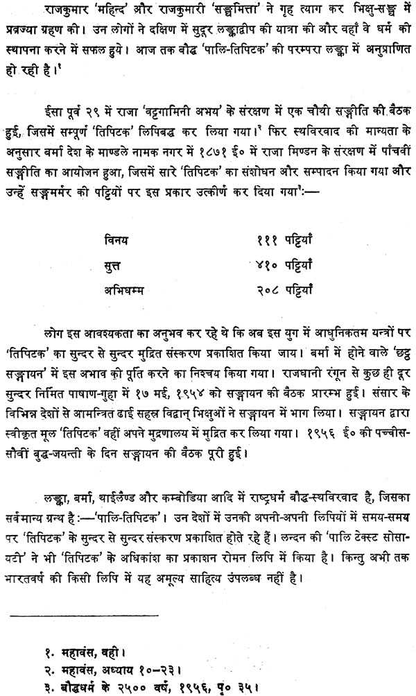 The Buddhist literature, particularly the canonical literature, containing the collection of the words of the Buddha, was collected verbally by his monk disciples in different regional dialects of north and central India. However a considerable part of these collections is lost in original Indian languages and is available only in Chinese and Tibetan Translations. However, Theravada tradition is the only tradition which has preserved the largest collection of Buddha teachings in original in a language which is called Pali. The Buddhist literature preserved in Pali is undoubtedly most authentic and earliest source for the knowledge of earliest form of Buddhism. For centuries after the Mahaparinibbana of the Buddha, the Pali Tipitika was traditionally handed down orally and was compiled in the form of the books for the first time in Ceylon in 29 B.C. Latter on it was again compiled with revision and re-edition at Mandlay, upper Myanmar in 1871 and finally upto date edition of the Pali Tipitika was printed by the sixth great council held in Rangoon in 1954. In the Theravada countries like Ceylon, Myanmar, Thailand, Laos and Cambodia, the Pali Tipitika was printed in the native scripts of the countries. However, complete Pali Tripitaka was not available in any script of India, the land of origin of Buddhism and Pali Tipitaka.