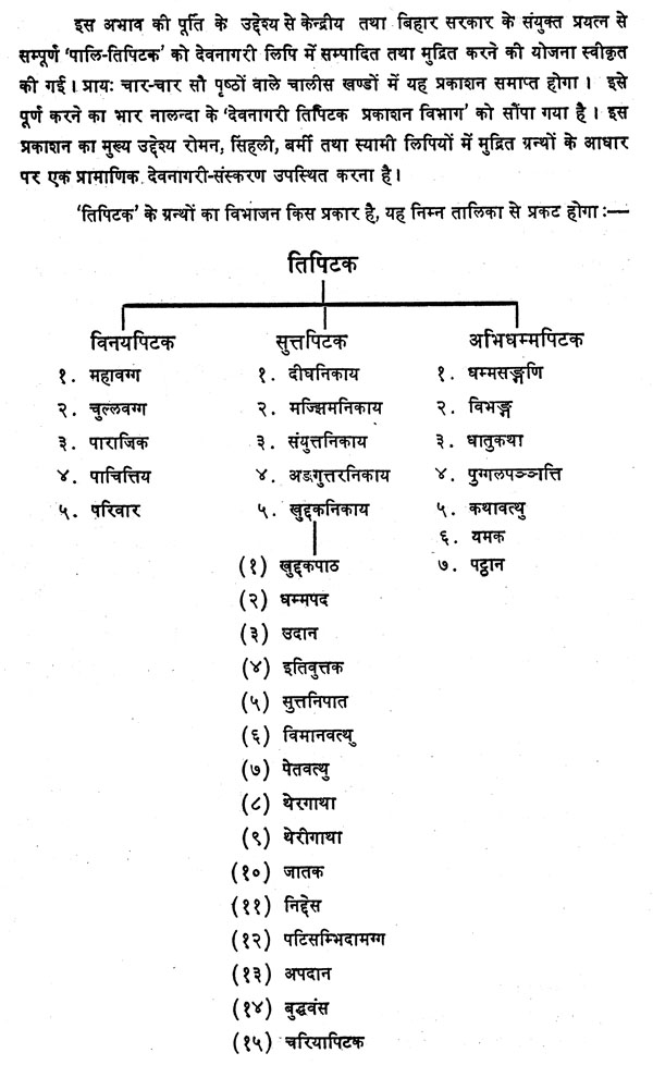 In the 19th Century the lost Buddhist tradition especially the Pali-Tradition of the Theravada Buddhism was revived. Subsequently separate departments and institutions for the study of Pali were established. Nava Nalanda Mahavihara was one of them. The principal aim and objective of establishing the Nava Nalanda Mahavihara was to publish entire Pali Tipitika Text in Deva Nagari Script. To materialize this objective the Government of India and State Government of Bihar jointly sanctioned a project of editing and publishing the entire Pali-Tipitika in 41 Volumes in Deva-Nagari Script. The Mahavihara, under the able guidance of Late Bhikkhu Jagdish Kashyap, published for the first time the entire Pali-Tipitika Text in Deva-Nagari Script in 1955-56 on the occasion of 2500th year of Buddha Jayanti in 41 Volumes. This publication of Pali Tipitika presented a coordinated edition of Texts based on the printed books in Roman, Sinhali, Burmese and Siyamese scripts. This publication gave a golden opportunity to the people, especially the people of Hindi speaking areas, to know more about the Buddha and his Dhamma, which was lost in India several centuries ago. It also became very popular and highly useful among the students and scholars of all over the world and was highly appreciated for the quality of the editing. Due to its popularity and high demand it went out of the market quickly. Its second edition or reprint became the need of the day.
