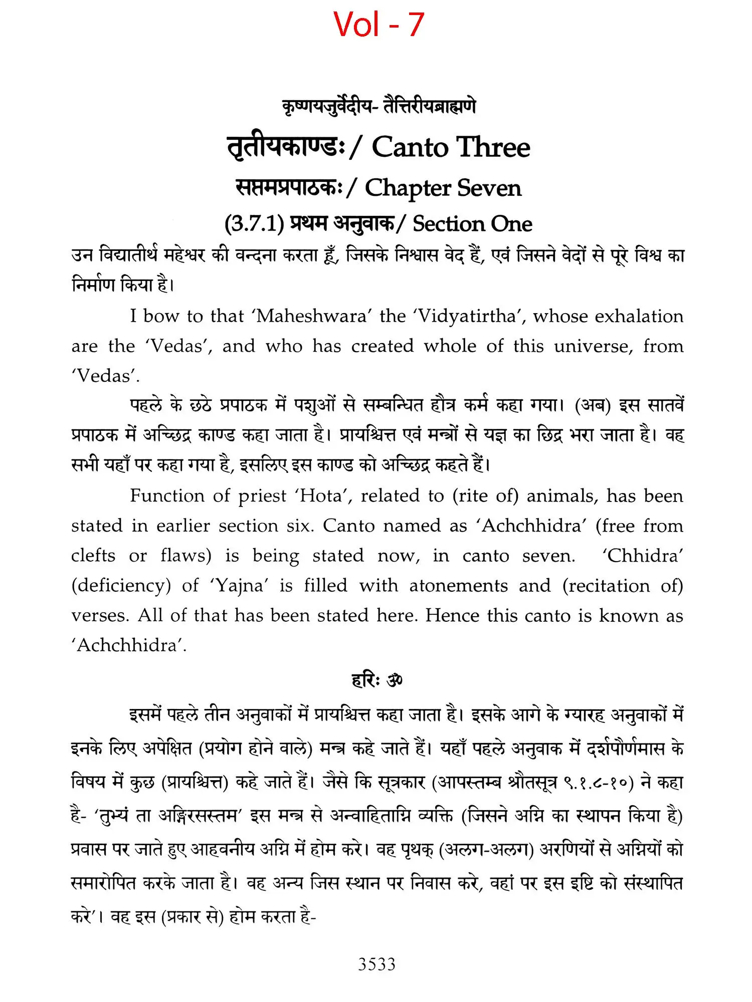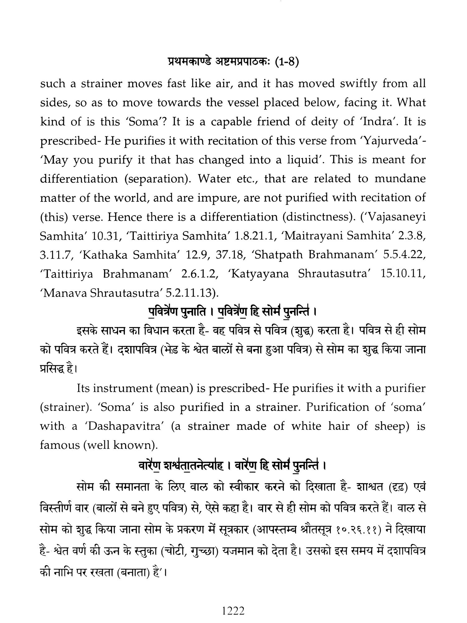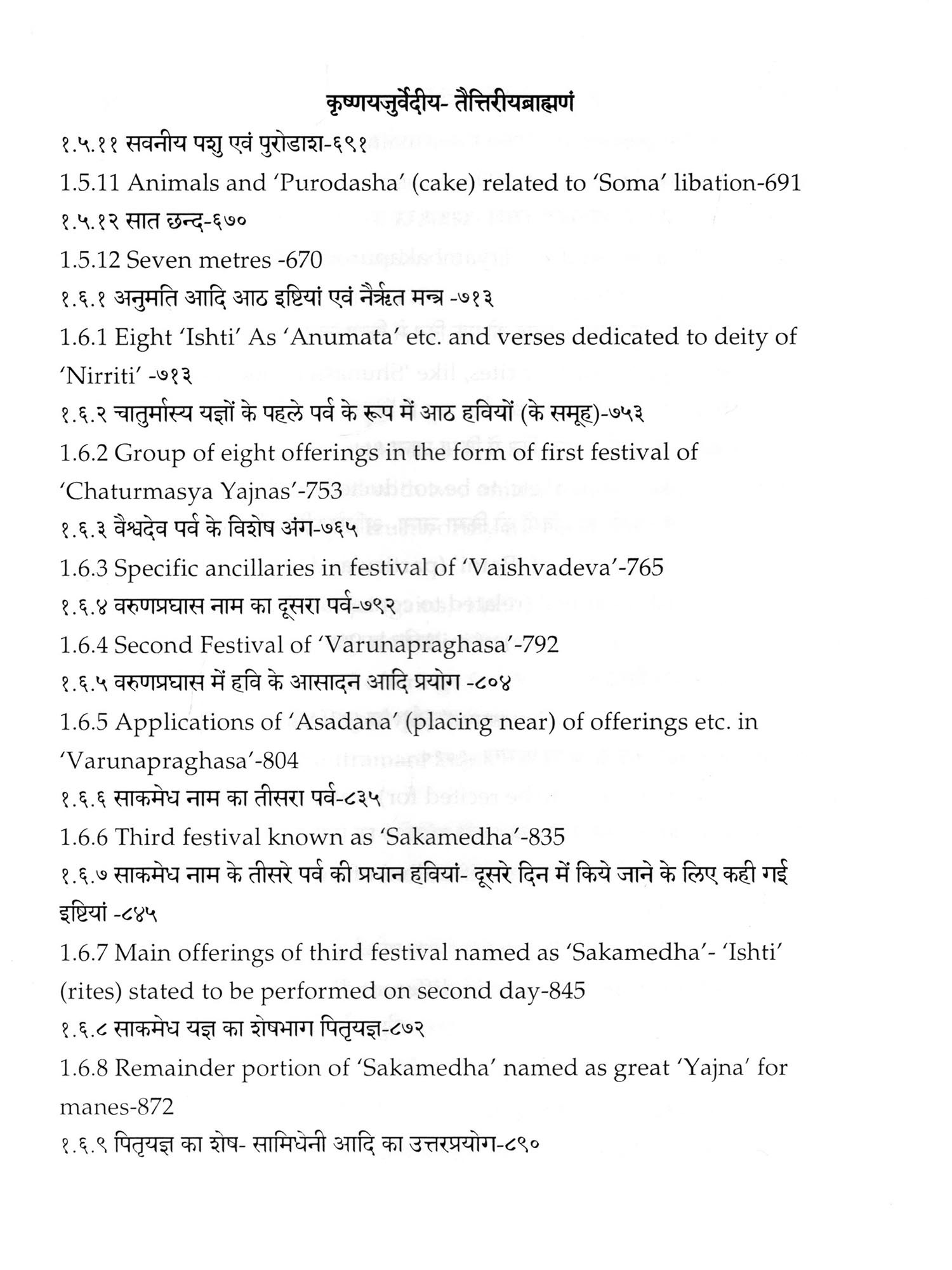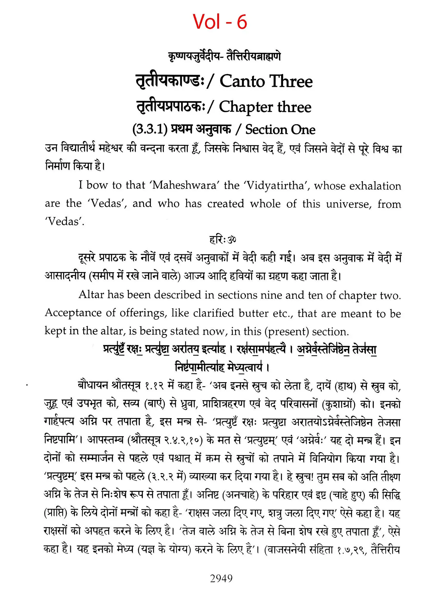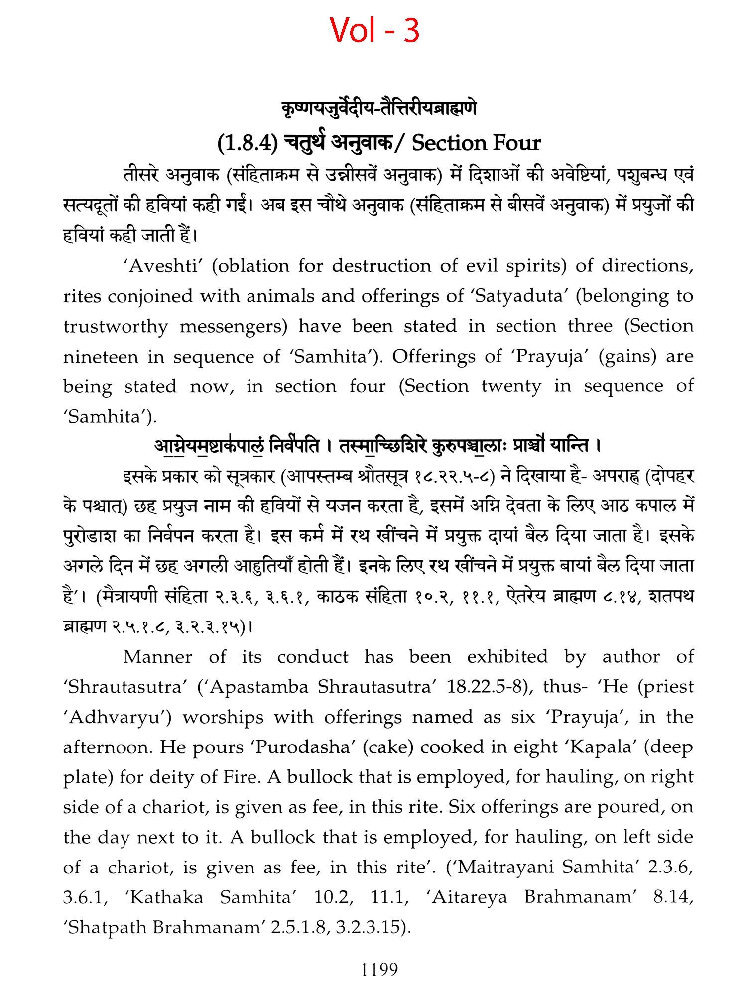 Chapters 6 to 8 of Canto one and chapters 2,3 and 5 of 'Taittiriya Brahmnanam' had been already explained and commented upon by 'Acharya Sayana' much before he commenced upon writing commentary on 'Taittiriya Samhita'. Since these were in the earlier and introductory cantos of the *Samhita', the commentary is too elaborate and relies heavily upon 'Jaiminiya Nyayamala', to explain various processes of 'Yajnas' and to reply frequently asked questions. It is seen that all the publishers, who have otherwise published commentary by 'Sayana', have opted to leave these six chapters without any commentary, even without giving a hint as to where would one find it. In order to make present work exhaustive, those portions have been taken from 'Samhita' and the commentary on these sections has been included in the present work so that the reader does not need to refer to the 'Samhita portion. Efforts have been made to point out the location of those references from treatises that have been referred to by 'Sayana' in the commentary, but as was usual in those days, names of the treatises as well as the reference to chapter, section and verse/sentence number have not been mentioned. In same very manner, references from other branches of 'Veda Samhitas', 'Brahmanam', 'Aranyaka', 'Upanishads', 'Shrautasutras', 'Grihyasutras' and 'Brihaddevata' have been provided, in case of both verses as well as sentences of 'Brahmanam' so that the reader is able to know and refer to the same, as extension of the study. The reader may also look into those treatises referred to and compare with the commentaries written on them. This is just a lead for those who want to have an exhaustive and comparative study in the matter.