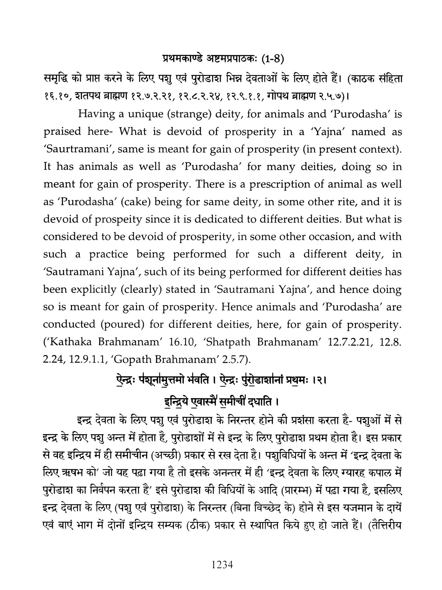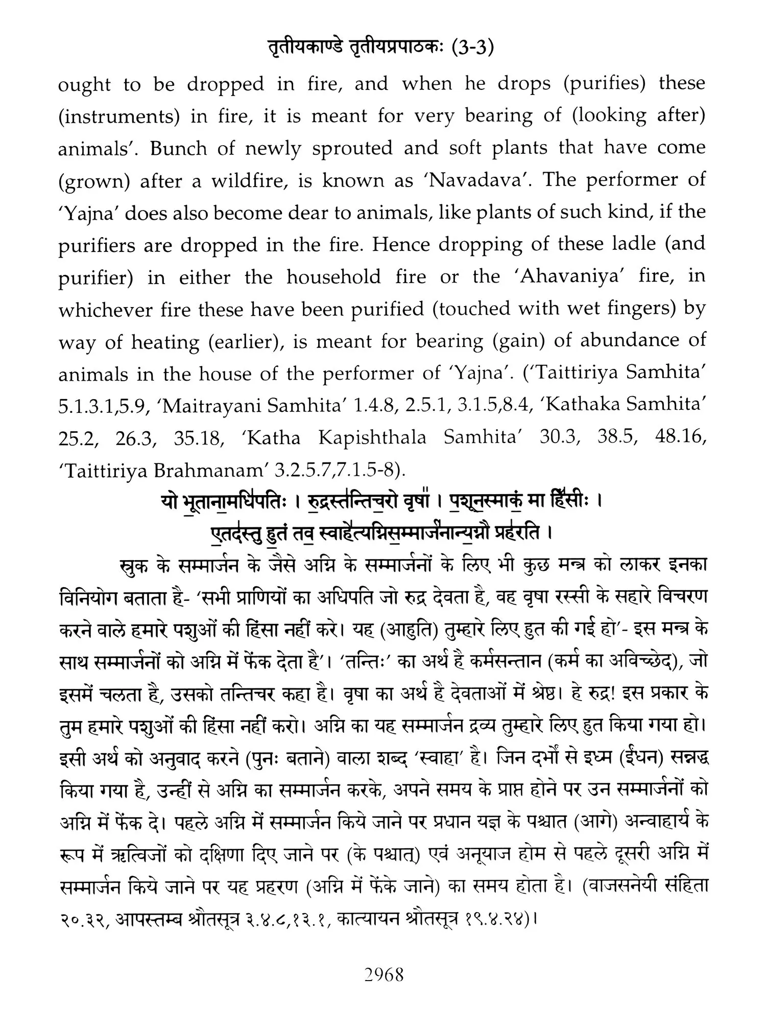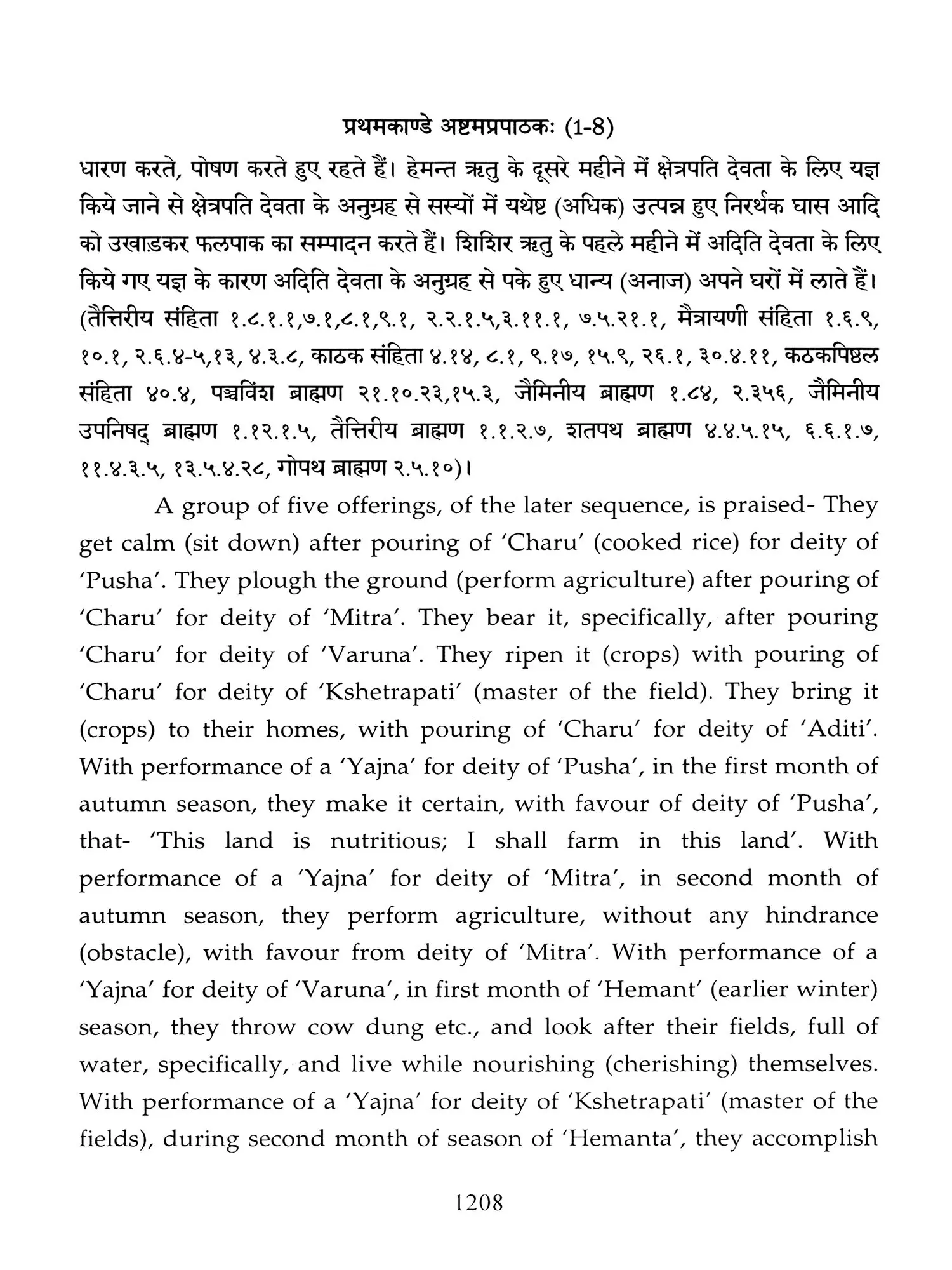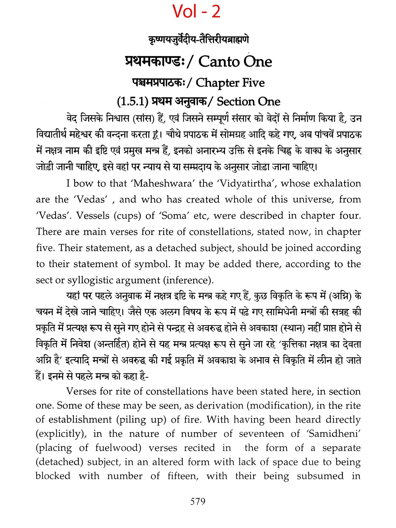 Chapters 6 to 8 of Canto one and chapters 2,3 and 5 of 'Taittiriya Brahmnanam' had been already explained and commented upon by 'Acharya Sayana' much before he commenced upon writing commentary on 'Taittiriya Samhita'. Since these were in the earlier and introductory cantos of the *Samhita', the commentary is too elaborate and relies heavily upon 'Jaiminiya Nyayamala', to explain various processes of 'Yajnas' and to reply frequently asked questions. It is seen that all the publishers, who have otherwise published commentary by 'Sayana', have opted to leave these six chapters without any commentary, even without giving a hint as to where would one find it. In order to make present work exhaustive, those portions have been taken from 'Samhita' and the commentary on these sections has been included in the present work so that the reader does not need to refer to the 'Samhita portion. Efforts have been made to point out the location of those references from treatises that have been referred to by 'Sayana' in the commentary, but as was usual in those days, names of the treatises as well as the reference to chapter, section and verse/sentence number have not been mentioned. In same very manner, references from other branches of 'Veda Samhitas', 'Brahmanam', 'Aranyaka', 'Upanishads', 'Shrautasutras', 'Grihyasutras' and 'Brihaddevata' have been provided, in case of both verses as well as sentences of 'Brahmanam' so that the reader is able to know and refer to the same, as extension of the study. The reader may also look into those treatises referred to and compare with the commentaries written on them. This is just a lead for those who want to have an exhaustive and comparative study in the matter.