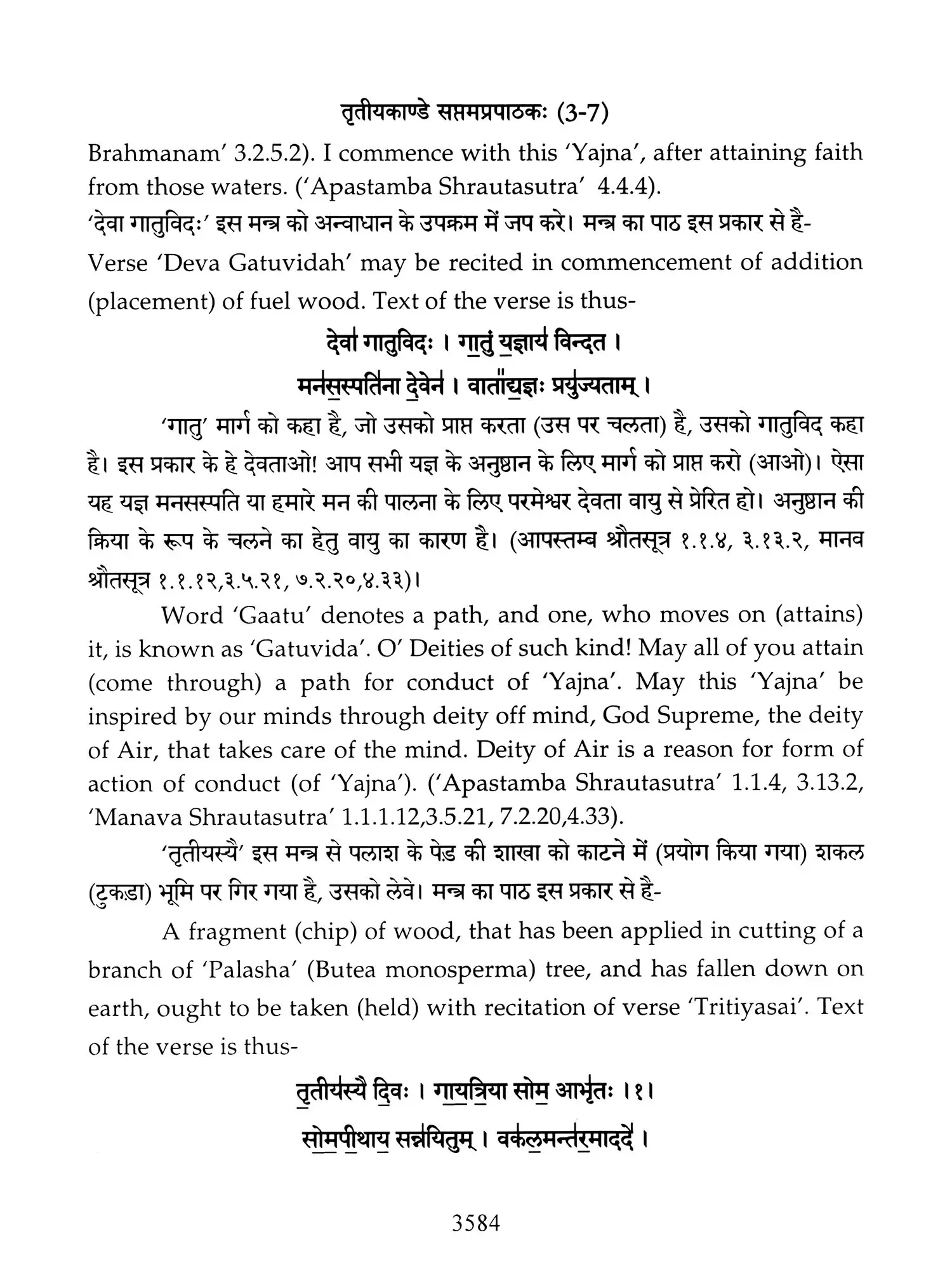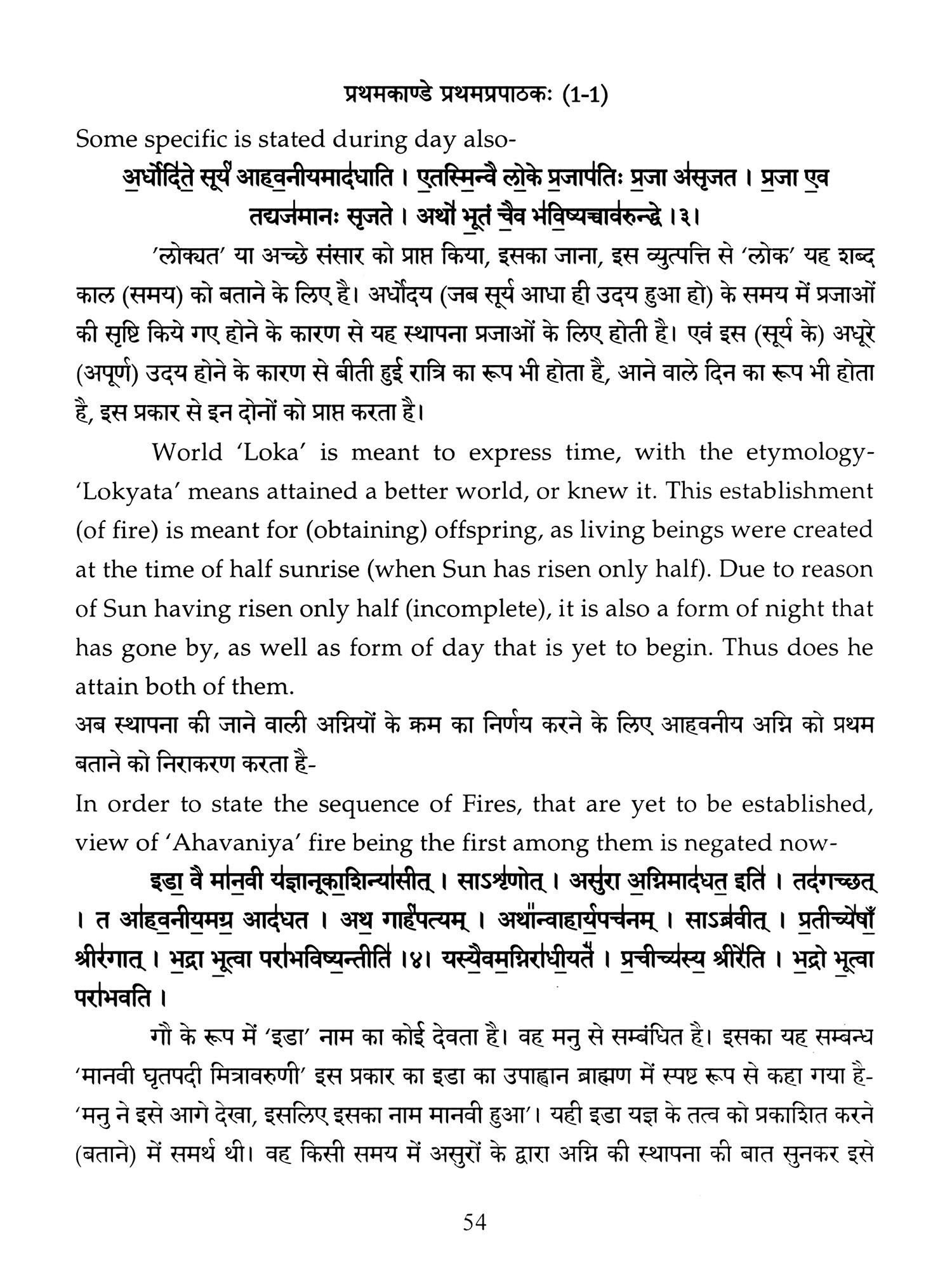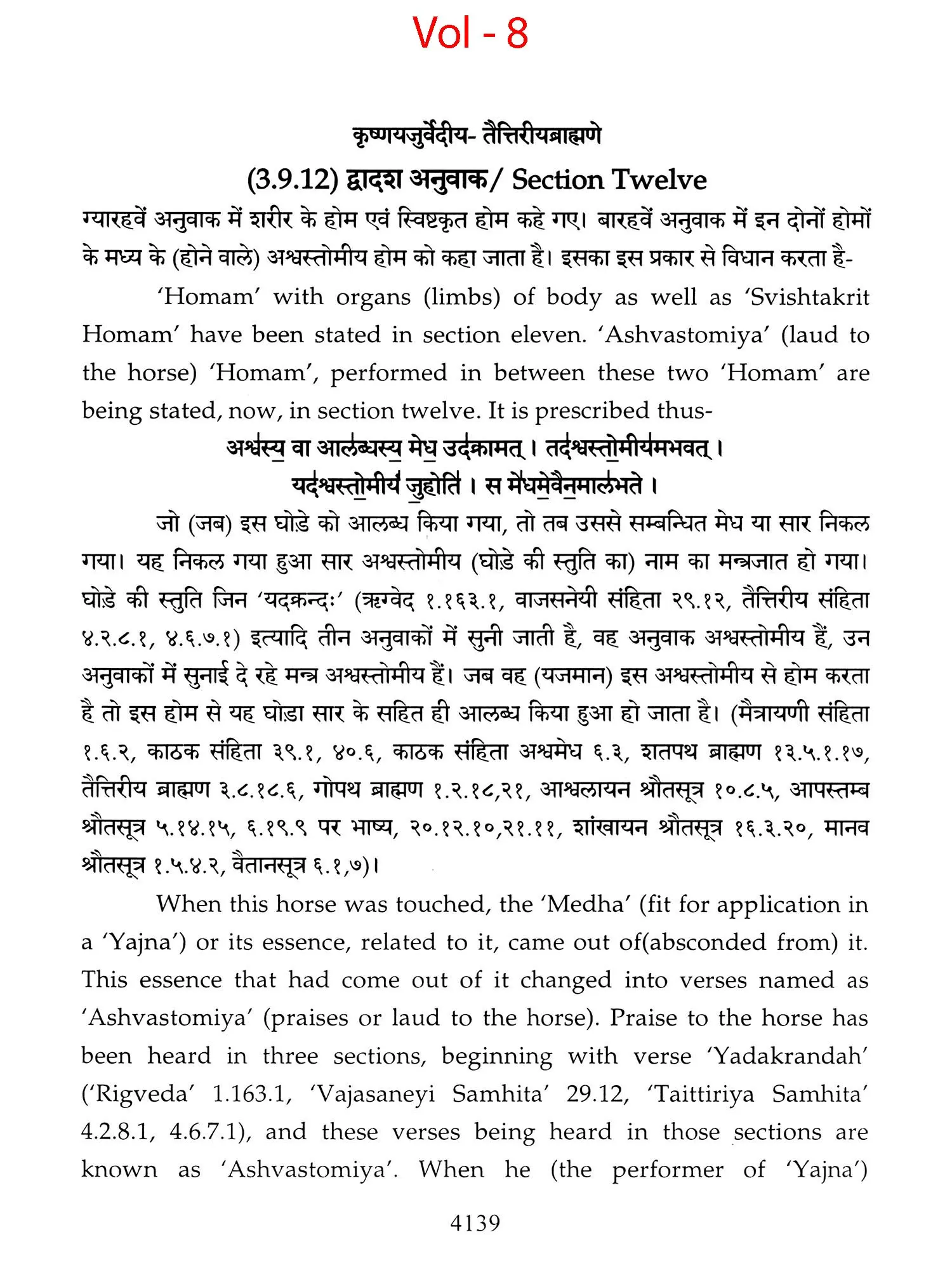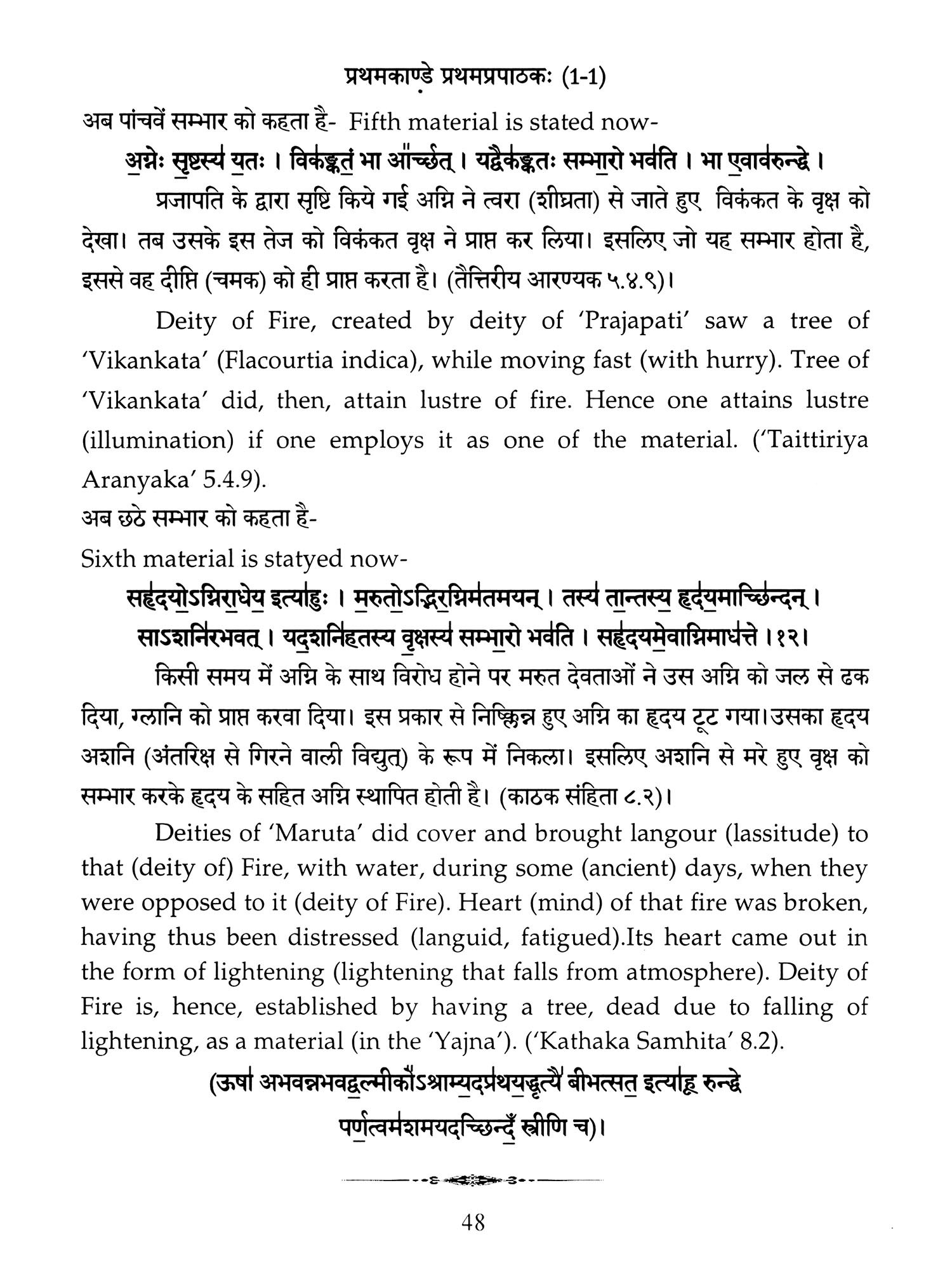 Hence a need was felt that these ancient treatises should also be made available in Hindi and English so that people, laymen as well as those having knowledge of Sanskrit are able to study the same. Present translation has been made with the same motive. Since 'Brahmanam' literature is revealed in a language, that is too obscure nowadays, and most of the technical words and phrases in the same, related to the procedure of 'Yajnas' is complicated and scattered in ancillary literature, a mere word to word transliteration might not have been that much useful, to understand the purport of these 'Yajnas' and their procedure. To our good fortune, we have with us, commentaries written by esteemed scholars in the past, among whom 'Acharya Sayana' is the epitome. It is with the help of commentaries by 'Sayana' that the treasure of 'Vedic' knowledge has been made easy to understand, for us. It is impossible to have such a great scholar in present day, but it was feat of this great scholar, to write commentaries on almost all the 'Samhita' and 'Brahmanam'. It is also a fact that a few branches of 'Krishna Yajurveda', like the 'Kathaka' and 'Maitrayani', and 'Brahmanam' like 'Kaushitaki', 'Gopath' and the three of 'Jaiminiya' branch, that were not commented upon by 'Sayana' are still lying without any commentary, and none of the scholars of later days, including those who have a habit to find fault with 'Sayana' at every step, have even tried to write any commentary on these. It is disheartening to say that whatever has been left untouched by 'Sayana' is still lying untouched. This is enough to show scholarship of 'Sayana', who has done yeoman's service to the later day students of 'Vedas'. Commentaries by 'Sayana' refer to 'Samhita', Brahmanam', 'Aranyaka', various 'Upanishads, 'Shrautasutras', and epics frequently, in almost every verse or sentence, so that the narrative flows easily and intricacies of the process of 'Yajna' is understood.