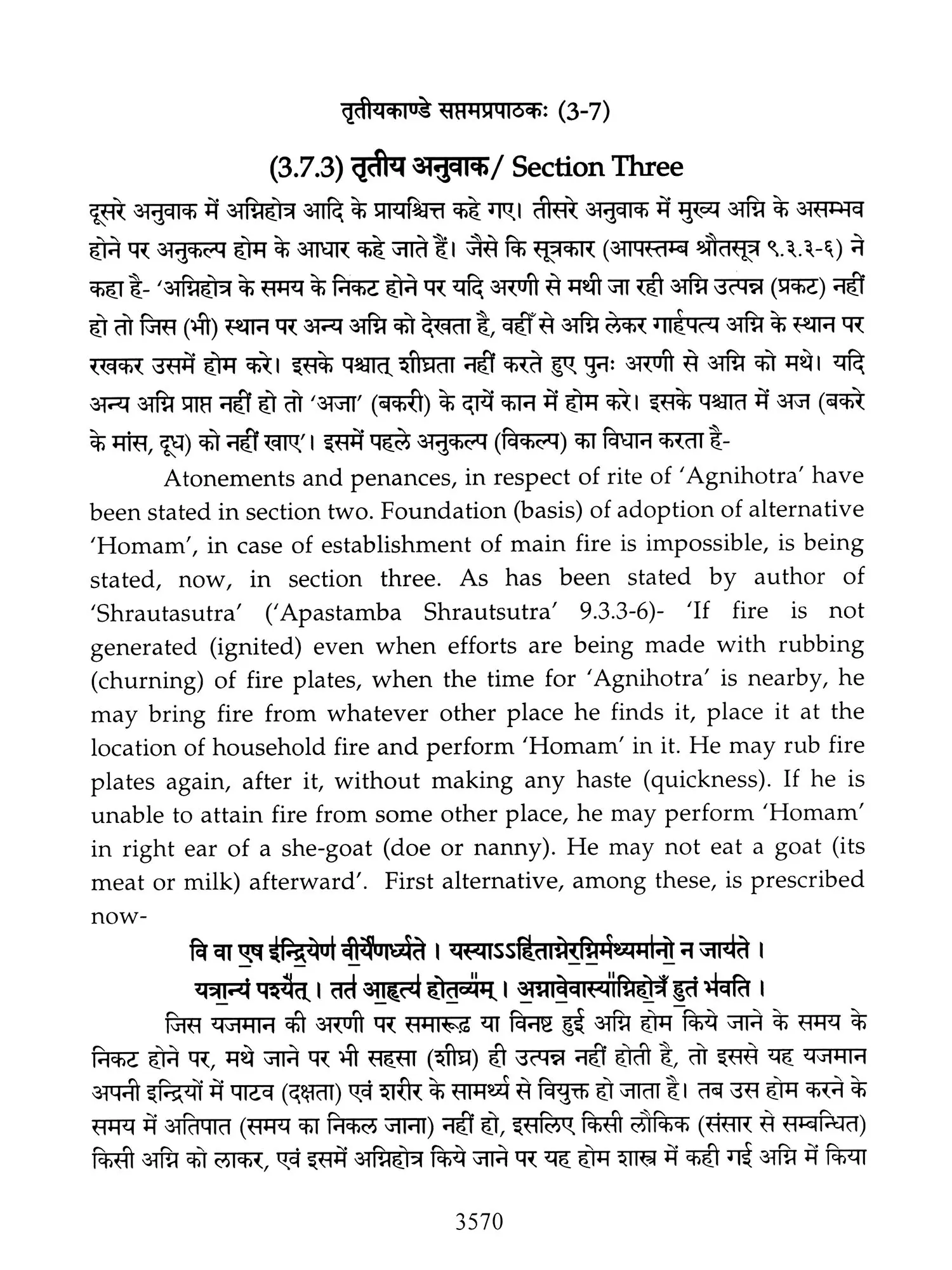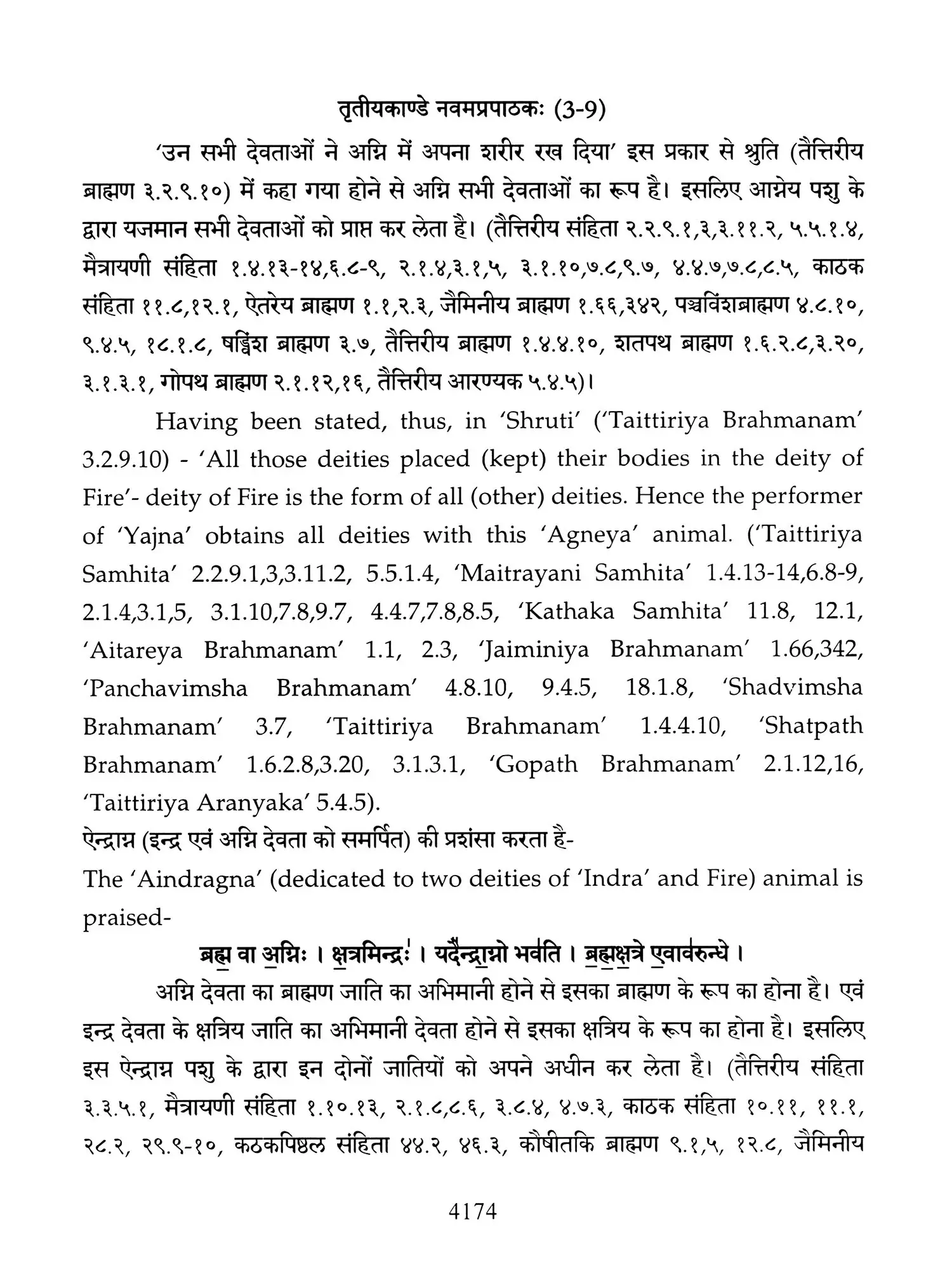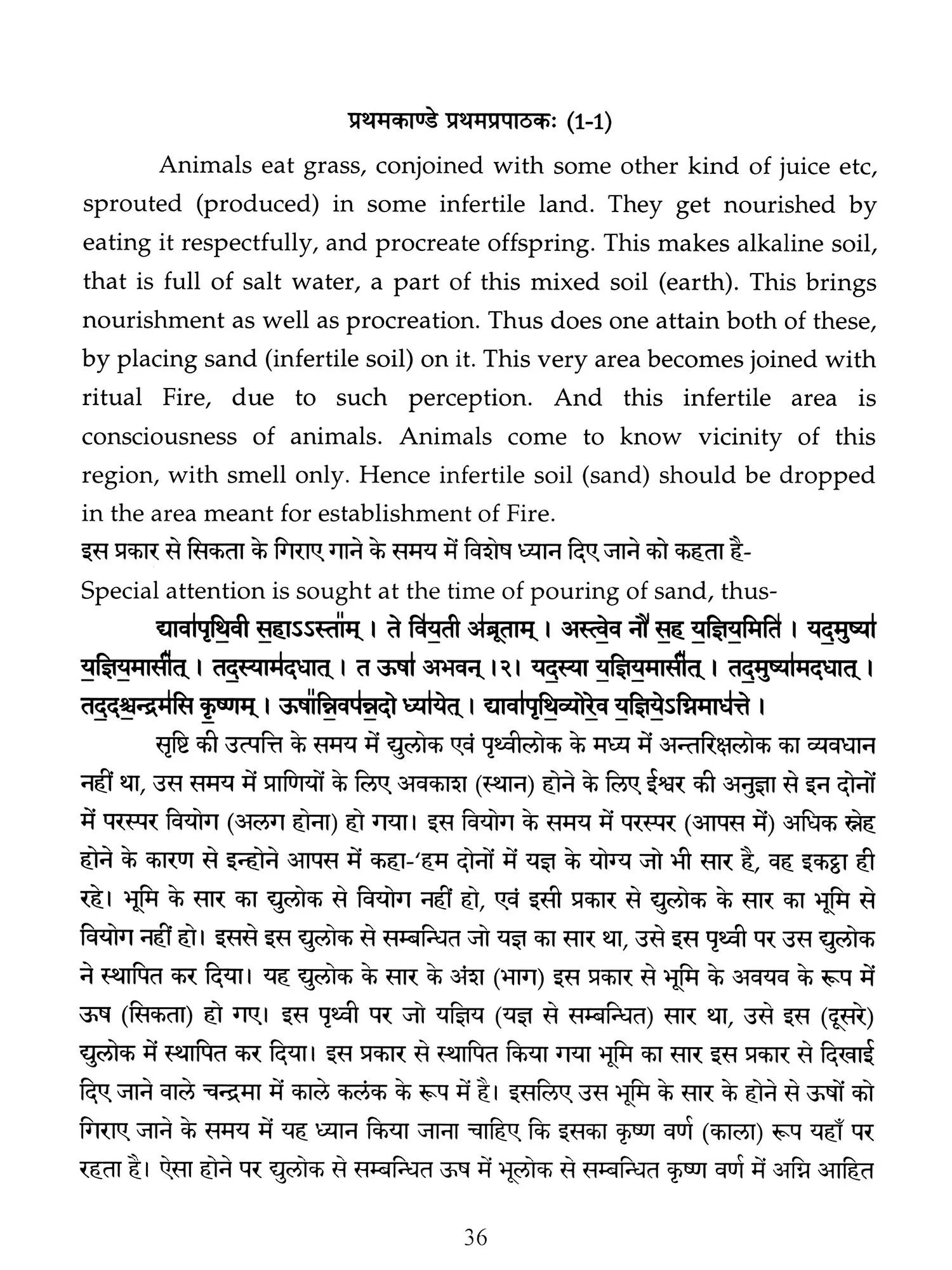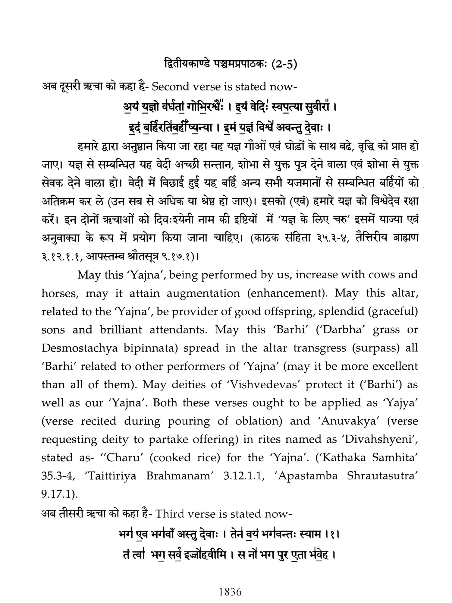 Hence a need was felt that these ancient treatises should also be made available in Hindi and English so that people, laymen as well as those having knowledge of Sanskrit are able to study the same. Present translation has been made with the same motive. Since 'Brahmanam' literature is revealed in a language, that is too obscure nowadays, and most of the technical words and phrases in the same, related to the procedure of 'Yajnas' is complicated and scattered in ancillary literature, a mere word to word transliteration might not have been that much useful, to understand the purport of these 'Yajnas' and their procedure. To our good fortune, we have with us, commentaries written by esteemed scholars in the past, among whom 'Acharya Sayana' is the epitome. It is with the help of commentaries by 'Sayana' that the treasure of 'Vedic' knowledge has been made easy to understand, for us. It is impossible to have such a great scholar in present day, but it was feat of this great scholar, to write commentaries on almost all the 'Samhita' and 'Brahmanam'. It is also a fact that a few branches of 'Krishna Yajurveda', like the 'Kathaka' and 'Maitrayani', and 'Brahmanam' like 'Kaushitaki', 'Gopath' and the three of 'Jaiminiya' branch, that were not commented upon by 'Sayana' are still lying without any commentary, and none of the scholars of later days, including those who have a habit to find fault with 'Sayana' at every step, have even tried to write any commentary on these. It is disheartening to say that whatever has been left untouched by 'Sayana' is still lying untouched. This is enough to show scholarship of 'Sayana', who has done yeoman's service to the later day students of 'Vedas'. Commentaries by 'Sayana' refer to 'Samhita', Brahmanam', 'Aranyaka', various 'Upanishads, 'Shrautasutras', and epics frequently, in almost every verse or sentence, so that the narrative flows easily and intricacies of the process of 'Yajna' is understood.