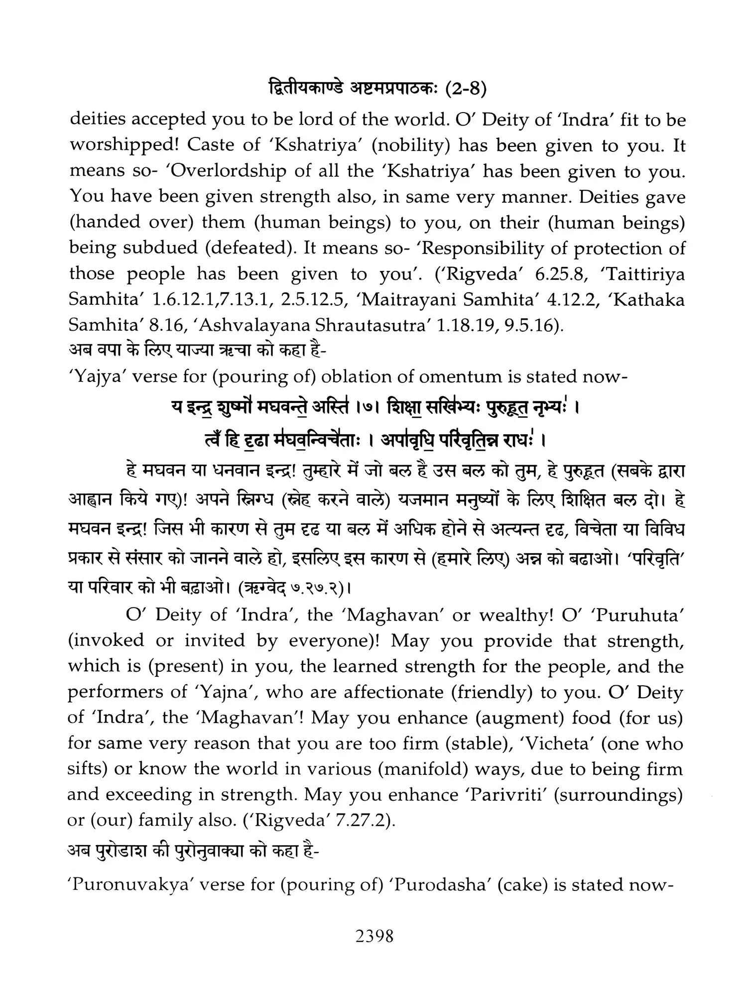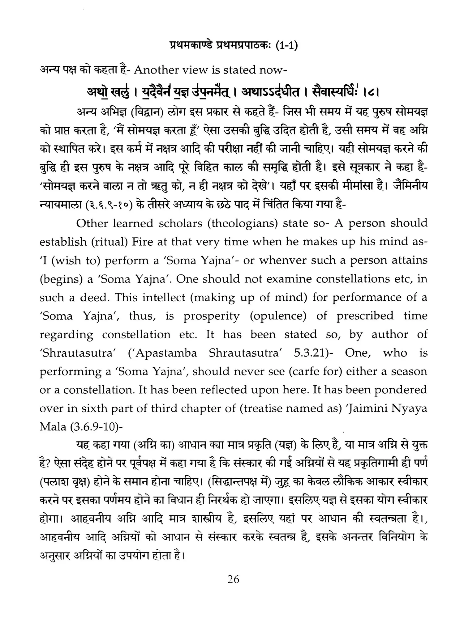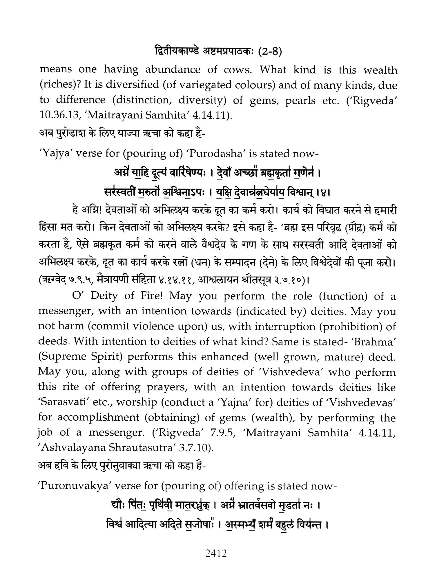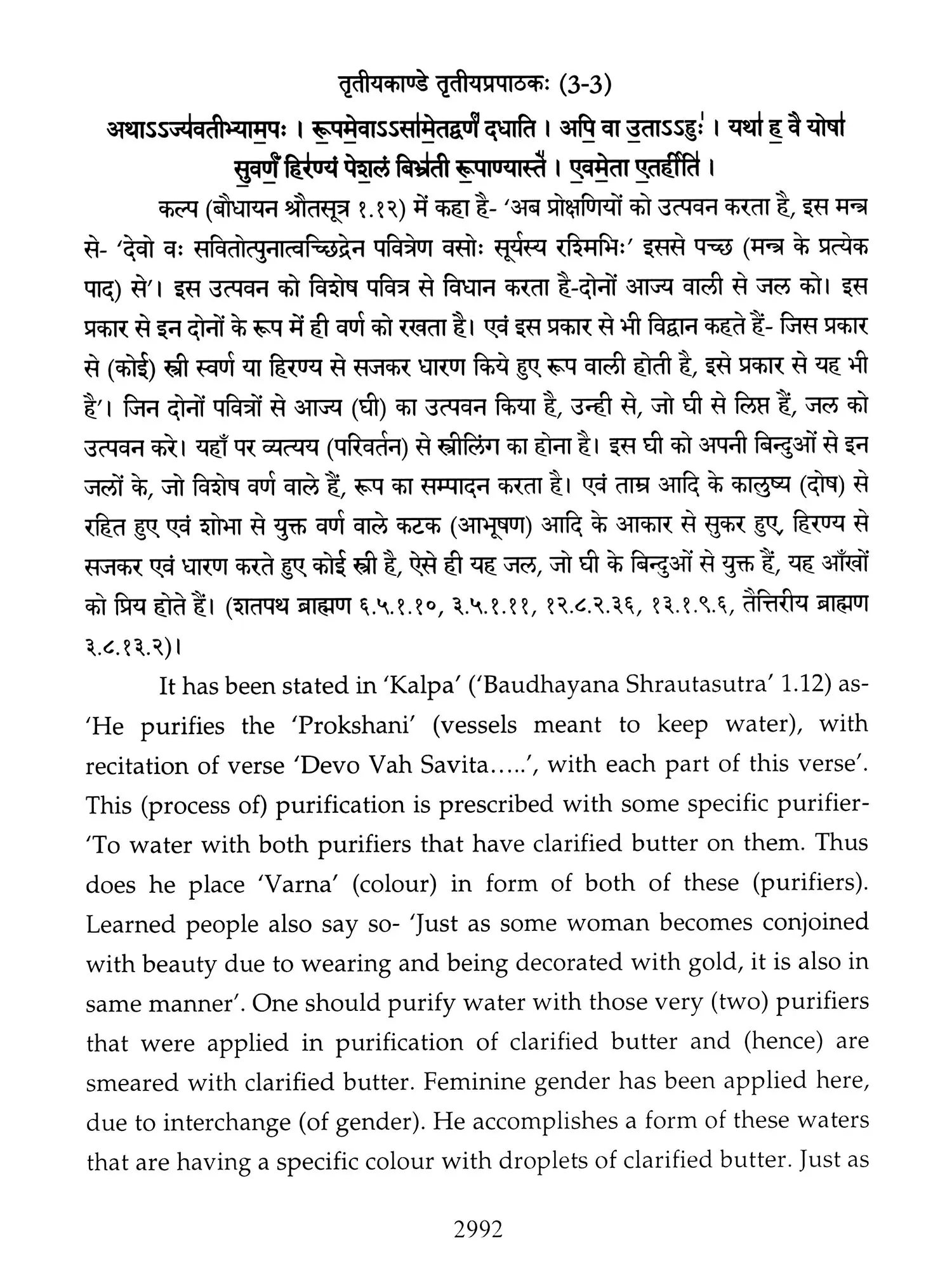 Hence a need was felt that these ancient treatises should also be made available in Hindi and English so that people, laymen as well as those having knowledge of Sanskrit are able to study the same. Present translation has been made with the same motive. Since 'Brahmanam' literature is revealed in a language, that is too obscure nowadays, and most of the technical words and phrases in the same, related to the procedure of 'Yajnas' is complicated and scattered in ancillary literature, a mere word to word transliteration might not have been that much useful, to understand the purport of these 'Yajnas' and their procedure. To our good fortune, we have with us, commentaries written by esteemed scholars in the past, among whom 'Acharya Sayana' is the epitome. It is with the help of commentaries by 'Sayana' that the treasure of 'Vedic' knowledge has been made easy to understand, for us. It is impossible to have such a great scholar in present day, but it was feat of this great scholar, to write commentaries on almost all the 'Samhita' and 'Brahmanam'. It is also a fact that a few branches of 'Krishna Yajurveda', like the 'Kathaka' and 'Maitrayani', and 'Brahmanam' like 'Kaushitaki', 'Gopath' and the three of 'Jaiminiya' branch, that were not commented upon by 'Sayana' are still lying without any commentary, and none of the scholars of later days, including those who have a habit to find fault with 'Sayana' at every step, have even tried to write any commentary on these. It is disheartening to say that whatever has been left untouched by 'Sayana' is still lying untouched. This is enough to show scholarship of 'Sayana', who has done yeoman's service to the later day students of 'Vedas'. Commentaries by 'Sayana' refer to 'Samhita', Brahmanam', 'Aranyaka', various 'Upanishads, 'Shrautasutras', and epics frequently, in almost every verse or sentence, so that the narrative flows easily and intricacies of the process of 'Yajna' is understood.