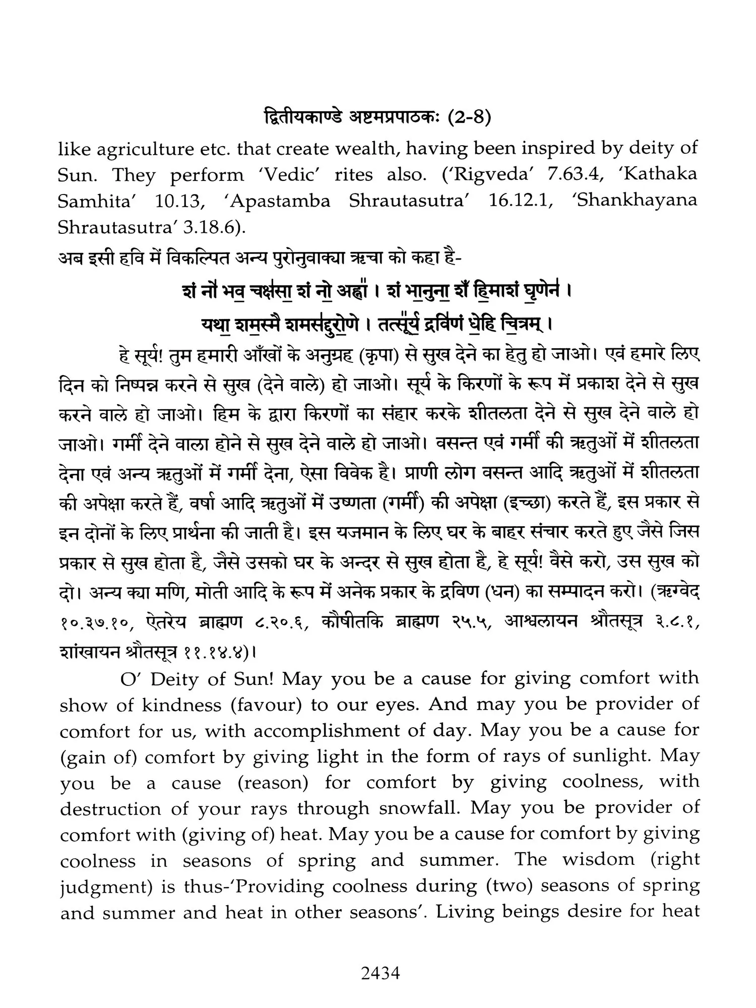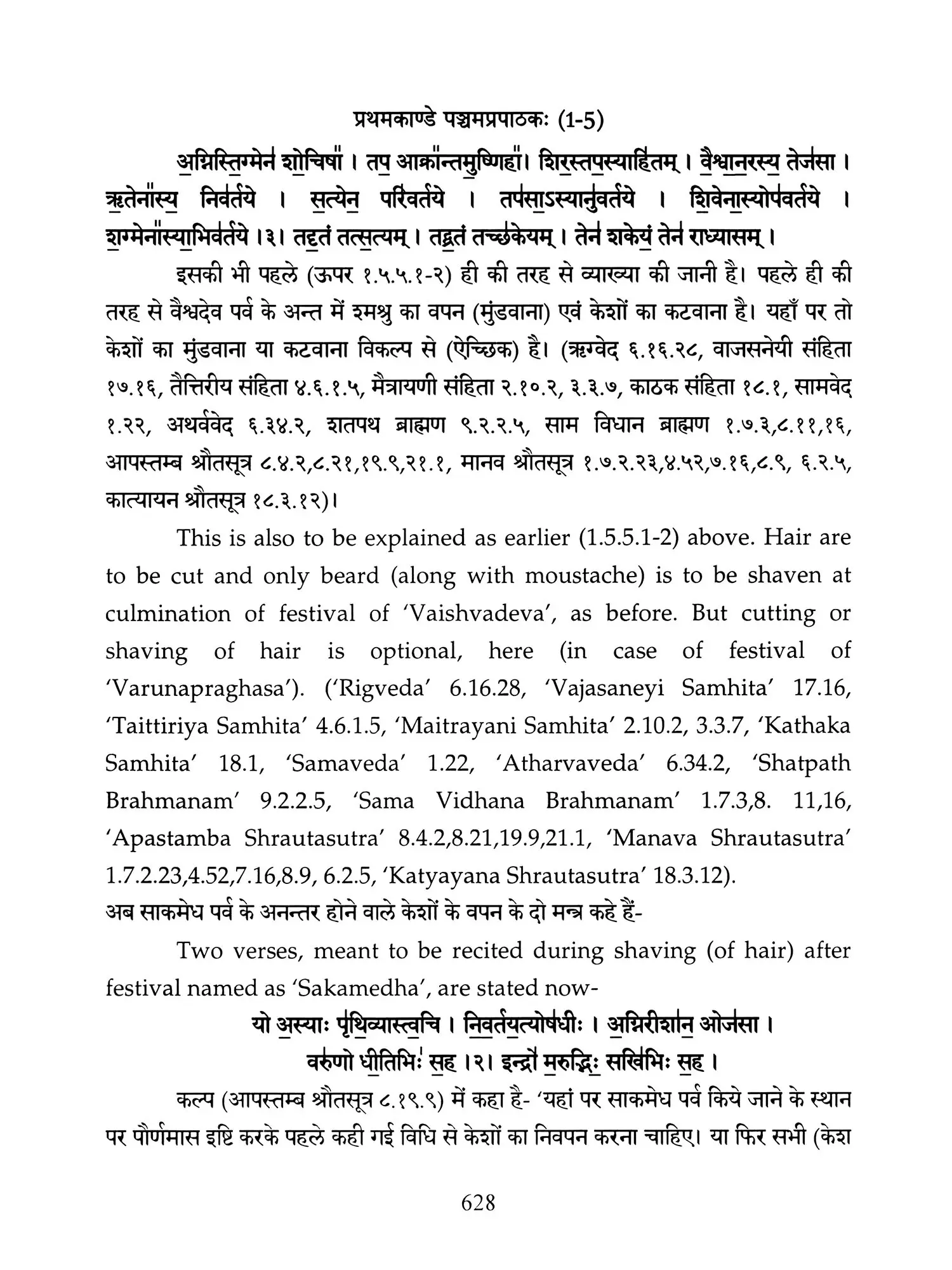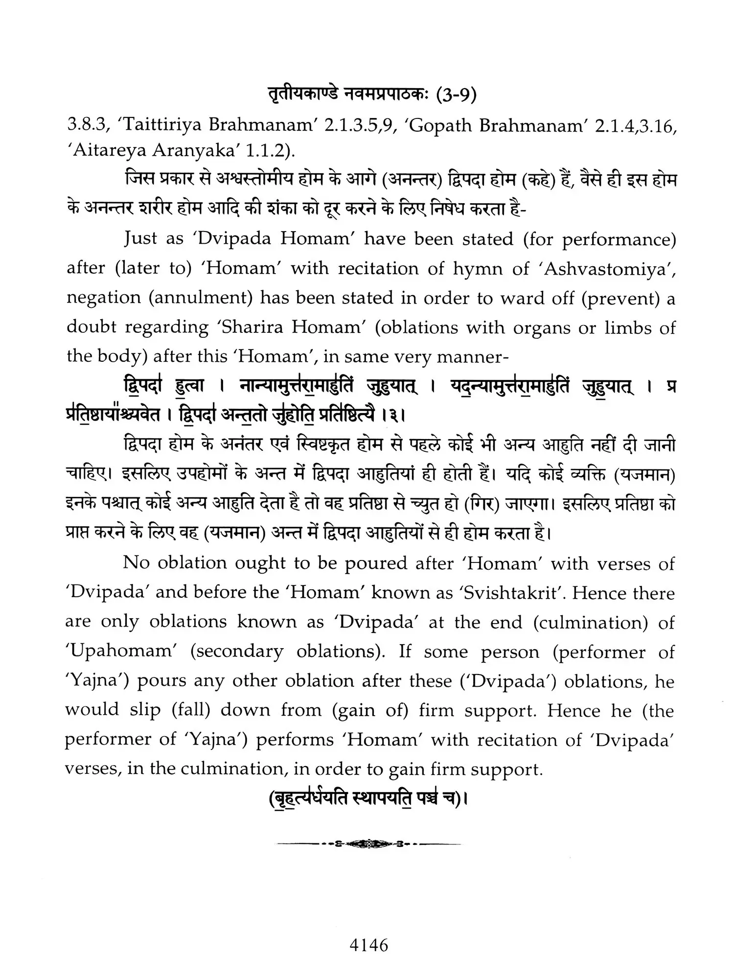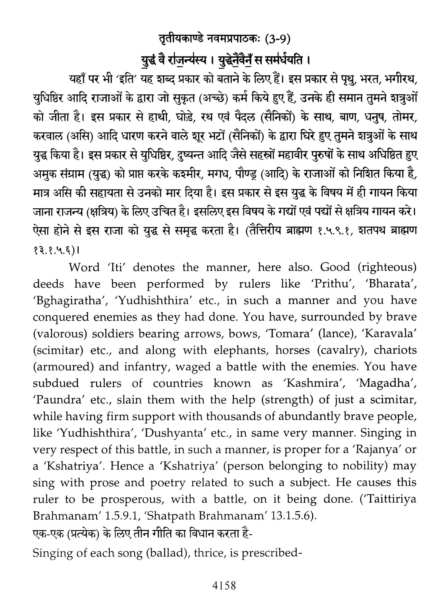 Hence a need was felt that these ancient treatises should also be made available in Hindi and English so that people, laymen as well as those having knowledge of Sanskrit are able to study the same. Present translation has been made with the same motive. Since 'Brahmanam' literature is revealed in a language, that is too obscure nowadays, and most of the technical words and phrases in the same, related to the procedure of 'Yajnas' is complicated and scattered in ancillary literature, a mere word to word transliteration might not have been that much useful, to understand the purport of these 'Yajnas' and their procedure. To our good fortune, we have with us, commentaries written by esteemed scholars in the past, among whom 'Acharya Sayana' is the epitome. It is with the help of commentaries by 'Sayana' that the treasure of 'Vedic' knowledge has been made easy to understand, for us. It is impossible to have such a great scholar in present day, but it was feat of this great scholar, to write commentaries on almost all the 'Samhita' and 'Brahmanam'. It is also a fact that a few branches of 'Krishna Yajurveda', like the 'Kathaka' and 'Maitrayani', and 'Brahmanam' like 'Kaushitaki', 'Gopath' and the three of 'Jaiminiya' branch, that were not commented upon by 'Sayana' are still lying without any commentary, and none of the scholars of later days, including those who have a habit to find fault with 'Sayana' at every step, have even tried to write any commentary on these. It is disheartening to say that whatever has been left untouched by 'Sayana' is still lying untouched. This is enough to show scholarship of 'Sayana', who has done yeoman's service to the later day students of 'Vedas'. Commentaries by 'Sayana' refer to 'Samhita', Brahmanam', 'Aranyaka', various 'Upanishads, 'Shrautasutras', and epics frequently, in almost every verse or sentence, so that the narrative flows easily and intricacies of the process of 'Yajna' is understood.