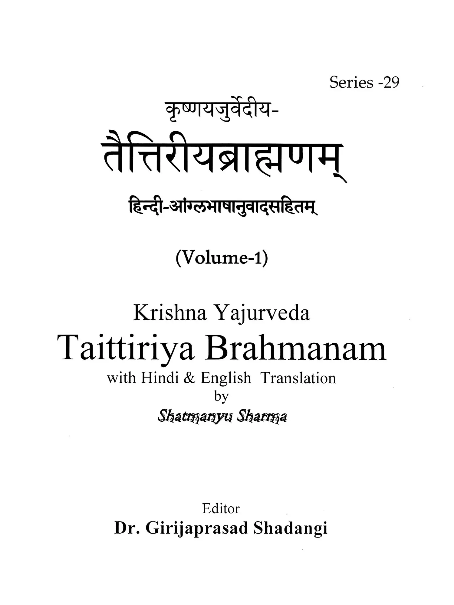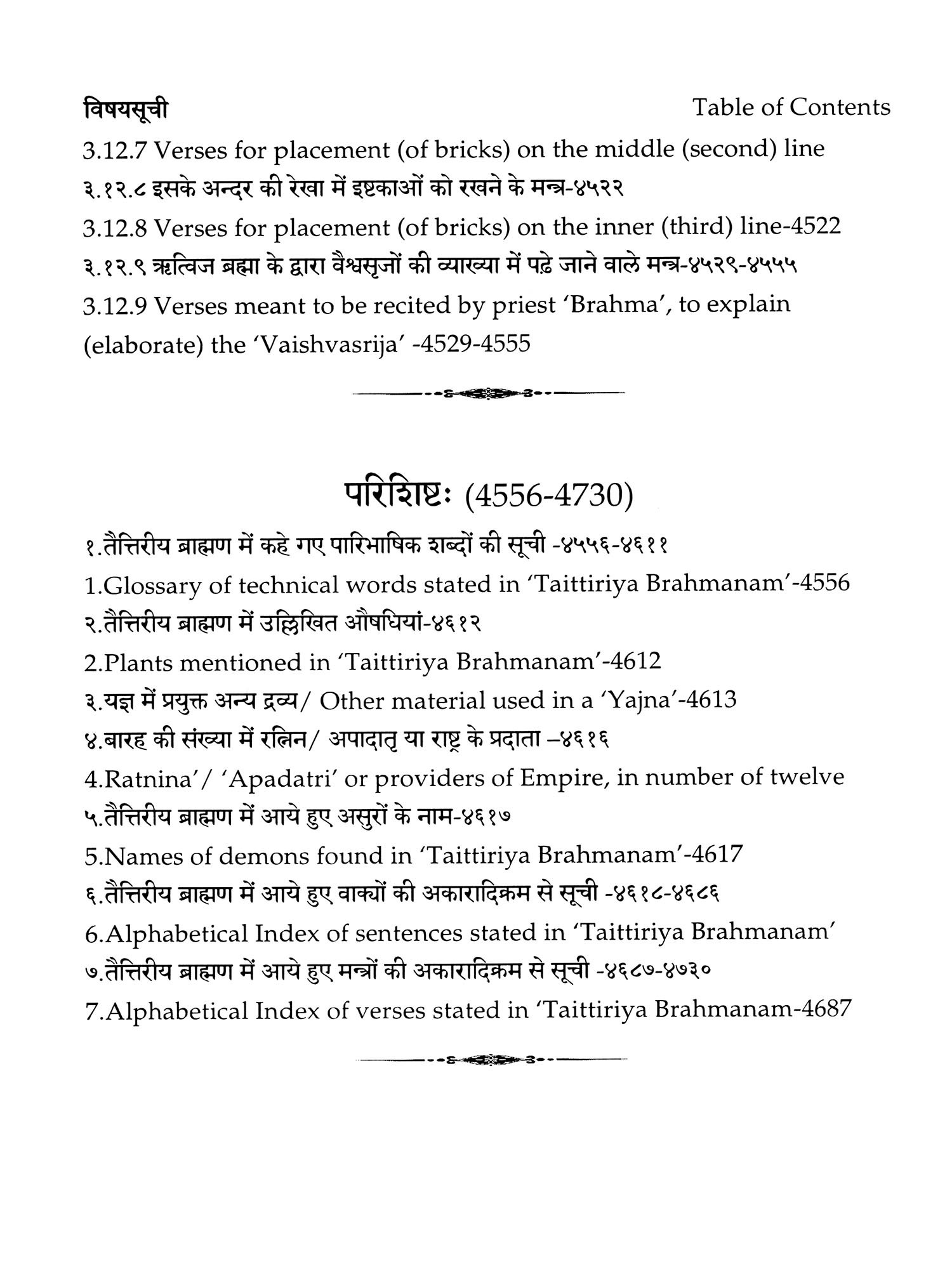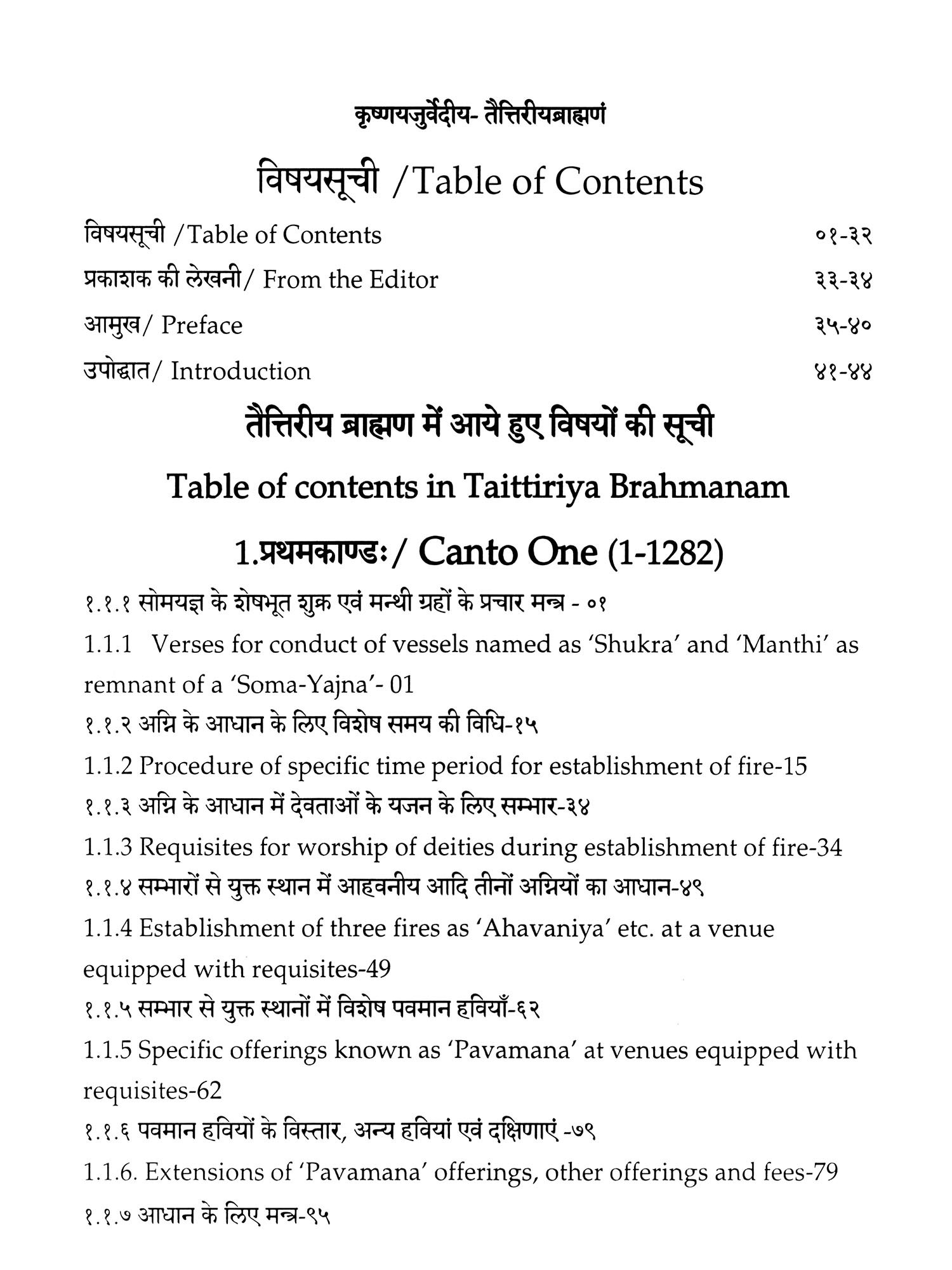 I have relied upon commentary on 'Taittiriya Brahmanam' by 'Sayana' and the present work is just a translation of this commentary, into Hindi and English languages. Sanskrit version of this commentary published by Anandashrama Press, Pune has been relied upon by me. The table of contents has been compiled on the basis of introduction to each section by 'Sayana', where contents of previous section as well as current section have been given along with a compilation of verses, 'Brahmanam' and sections at the end of sections and chapters so as to summarise the matter discussed in the sections.